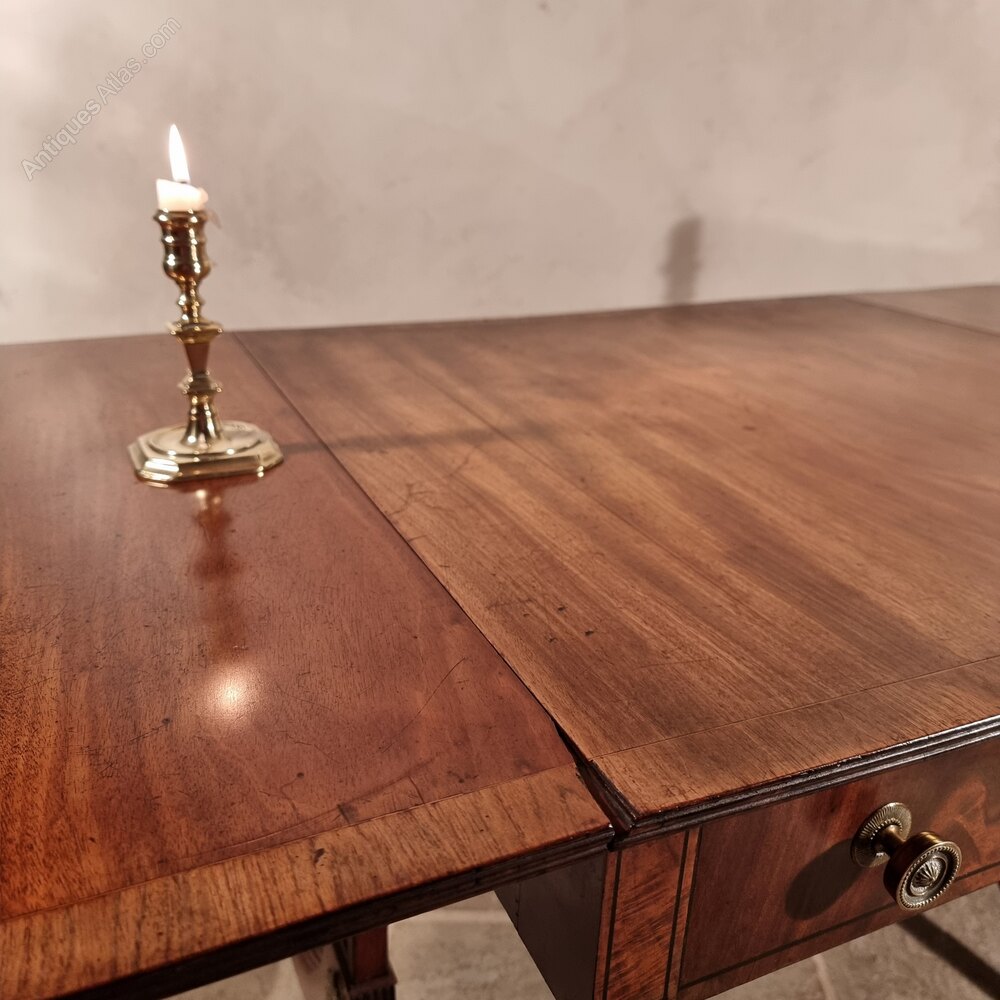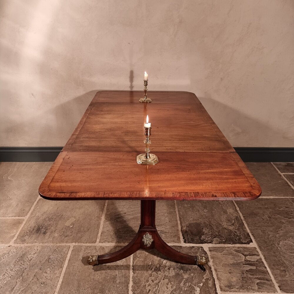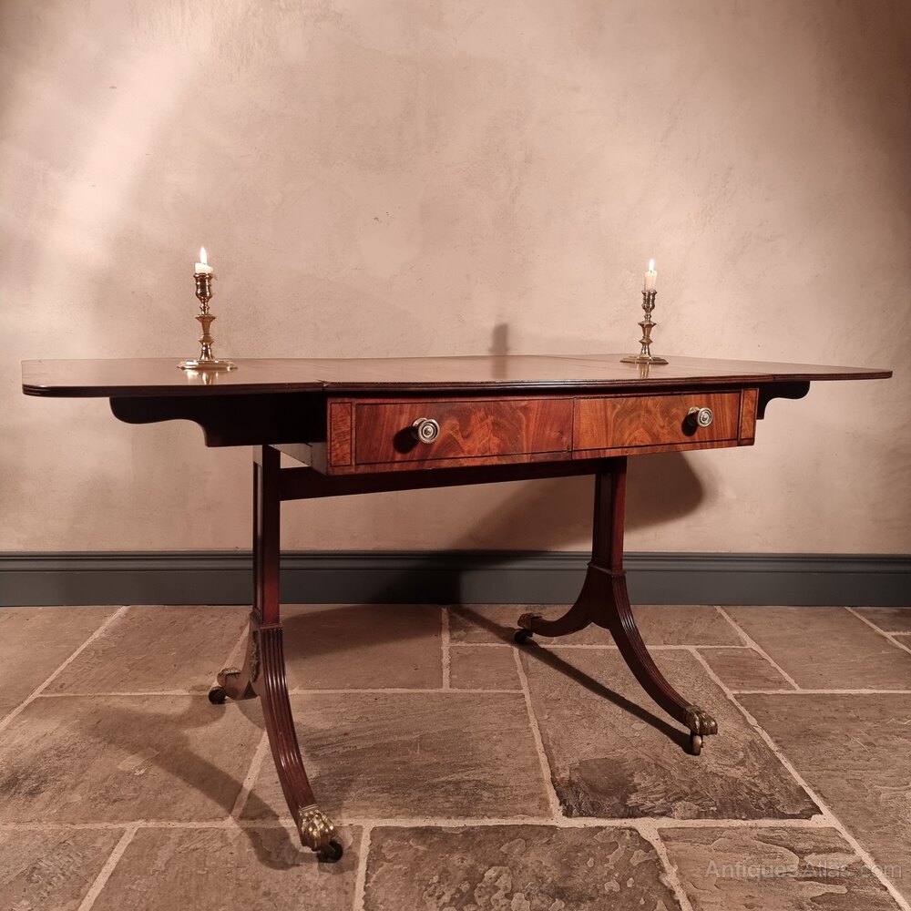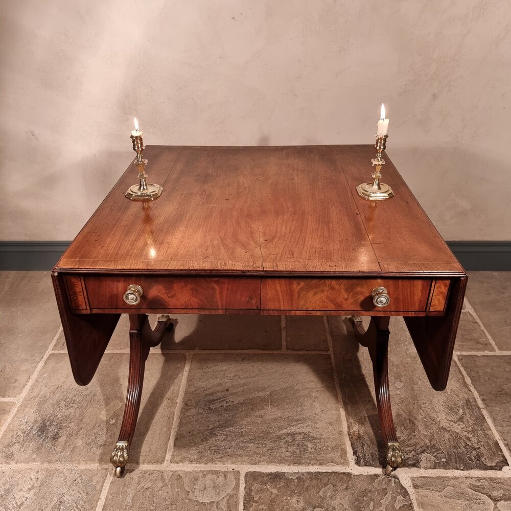 A fine regency mahogany sofa table of elegant refined form, with its splayed reeded legs and original brass lion paw castors. The box section below the top contains two deep long drawers which are right and left on opposite side of the table with two dummie drawers, all complete with brass roundle handles. The leaves pull up and rest upon four bracket supports , the top having beutiful mahogany veneers with exceptional grain and then crossbanded with a single line of stringing, and the face of the top edge finish with a planed reeded moulding.