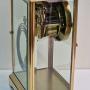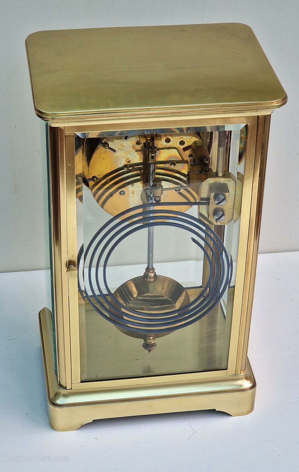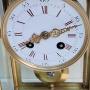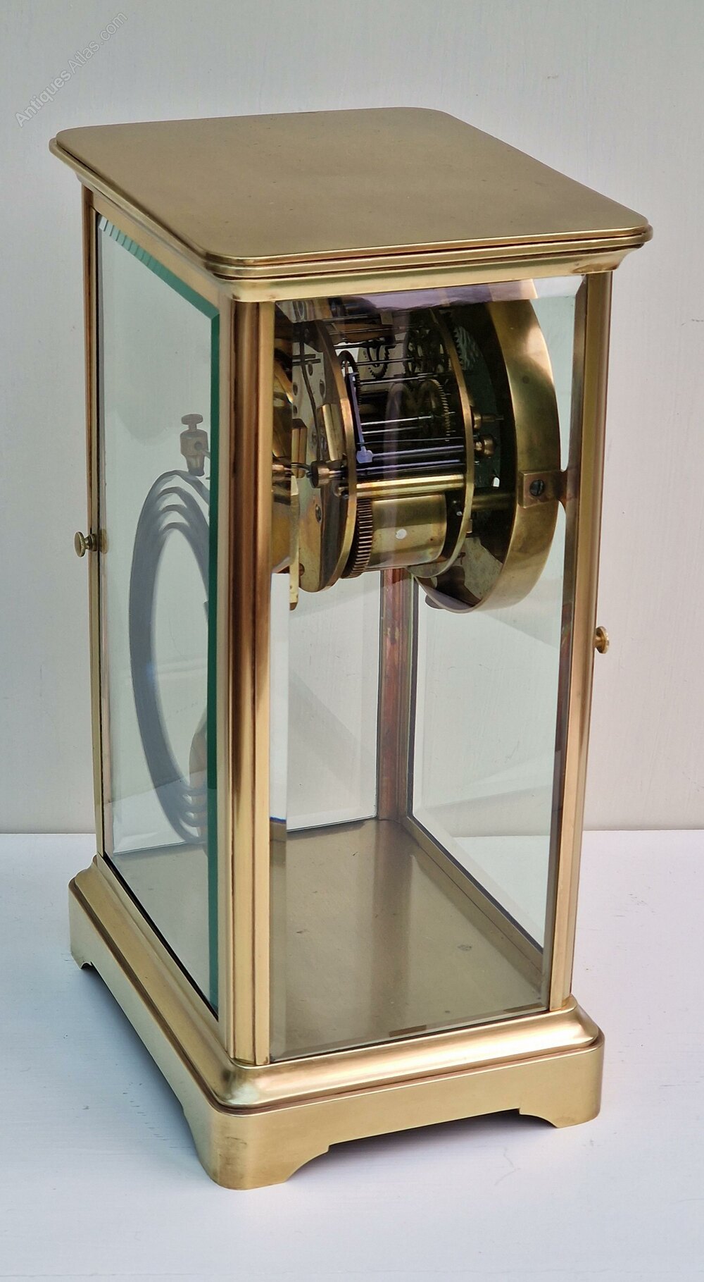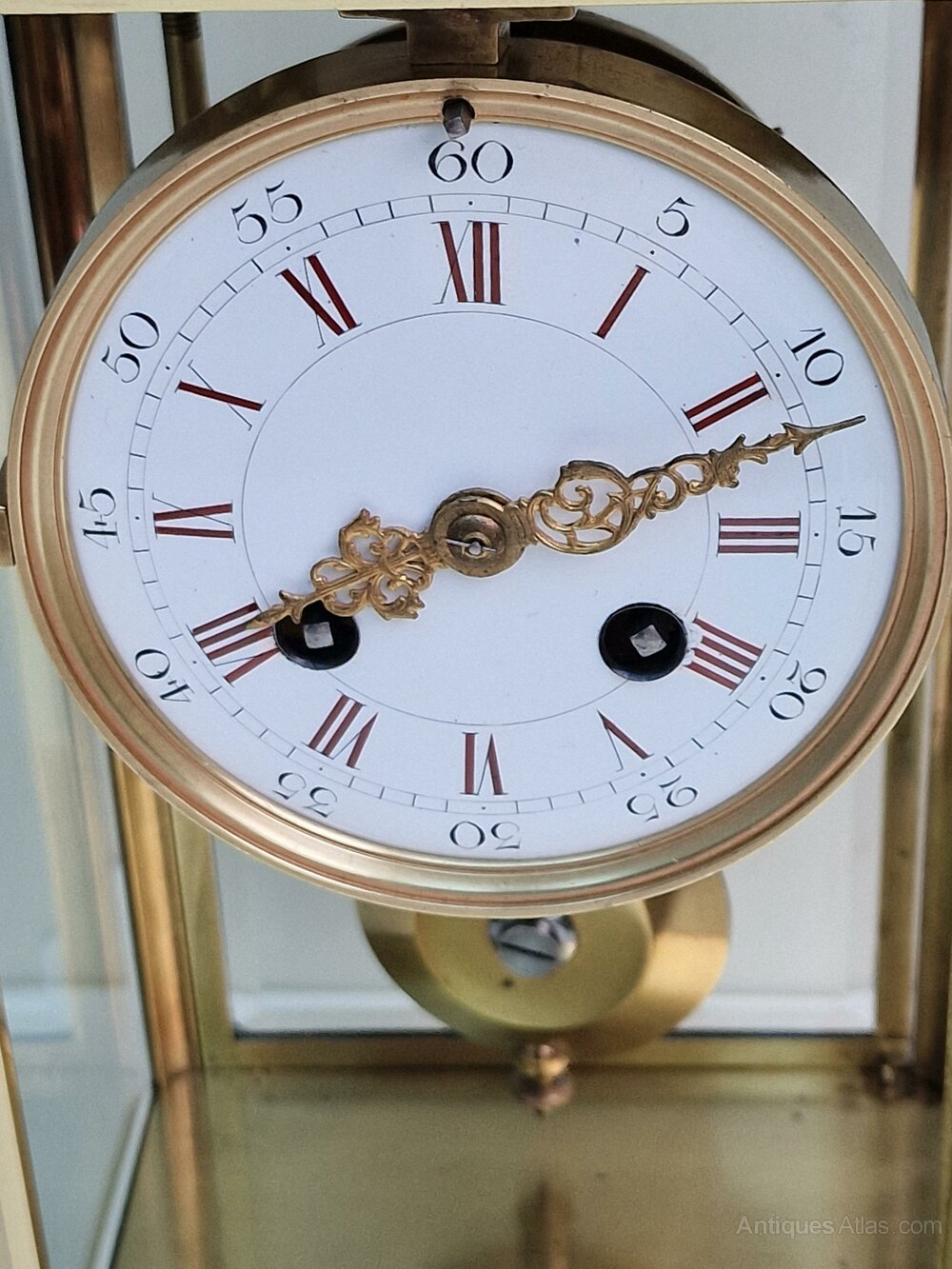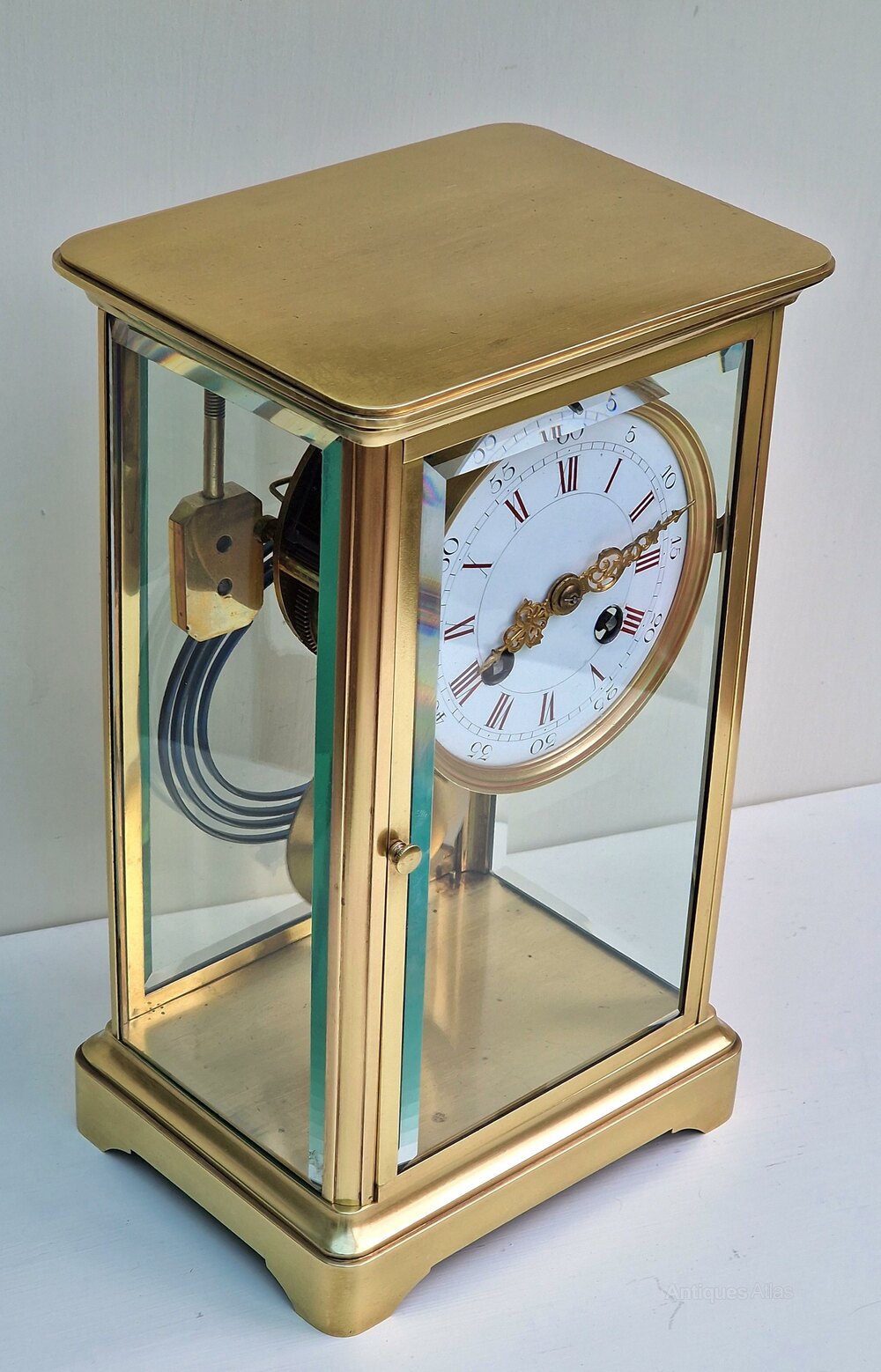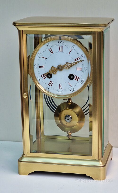 A French four glass mantel clock. Bevelled glass panels with opening front and rear doors. An enamel dial with pierced gilt hands. Roman numerals and 5 minute outer dial markers. A circular gilt brass pendulum.