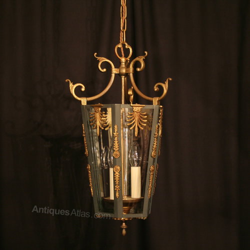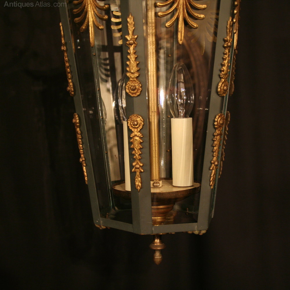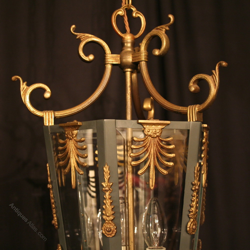 A French gilded cast brass Empire styled triple light hexagonal antique hall lantern, the six bevelled tapering glass panels held within a dark green enamelled scrolling tapering framework with three internal light fittings and decorative scrolled central Anthemion embellishments with a scrolling open top canopy, having the original chain and ceiling rose, good original patination and size. Fully rewired and PAT tested. All our lanterns come with bulbs and ceiling fixings.