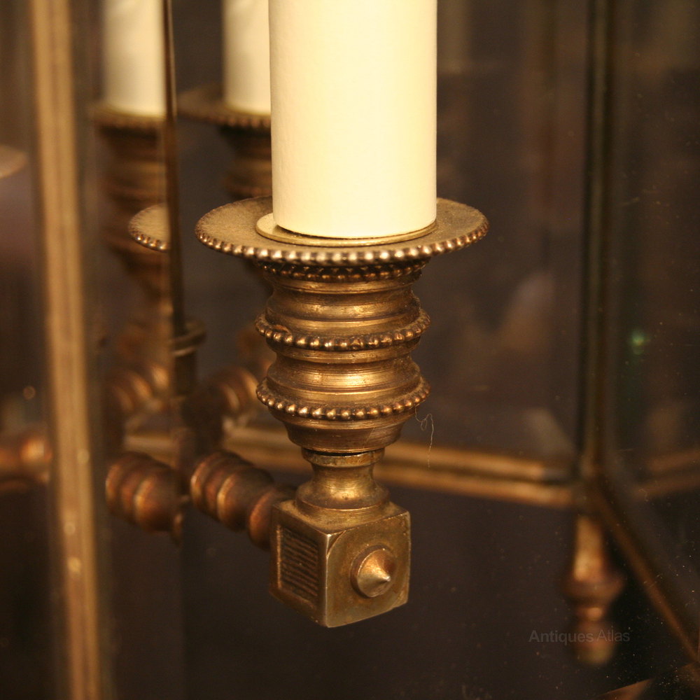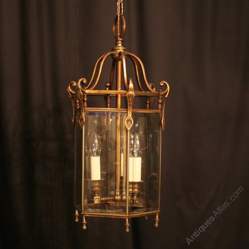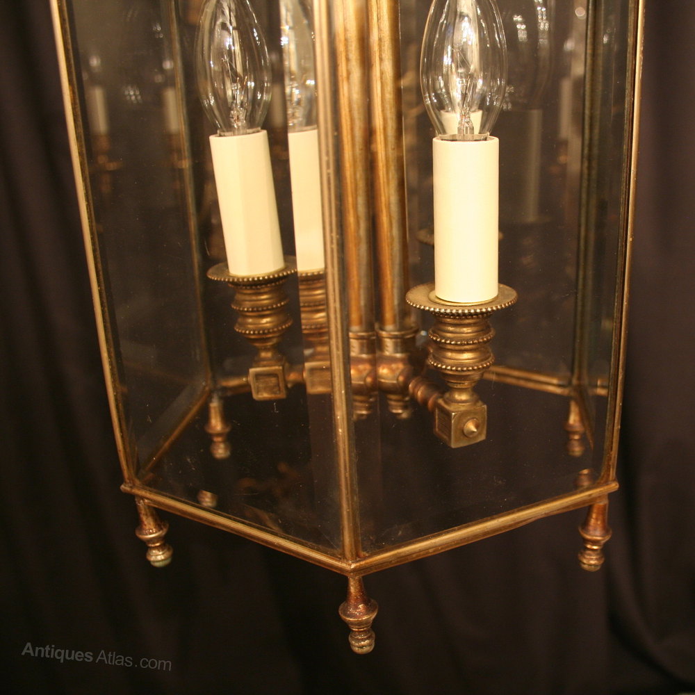 A French cast brass triple light hexagonal antique hall lantern, the six glass bevelled panels held within a scrolling framework with three internal light fittings, decorative scrolling open top canopy, ornate diamond lozenge embellishments and elongated terminals, having the original chain and ceiling rose, original patination and good size. Fully rewired and PAT tested. All our lanterns come with bulbs and ceiling fixings.