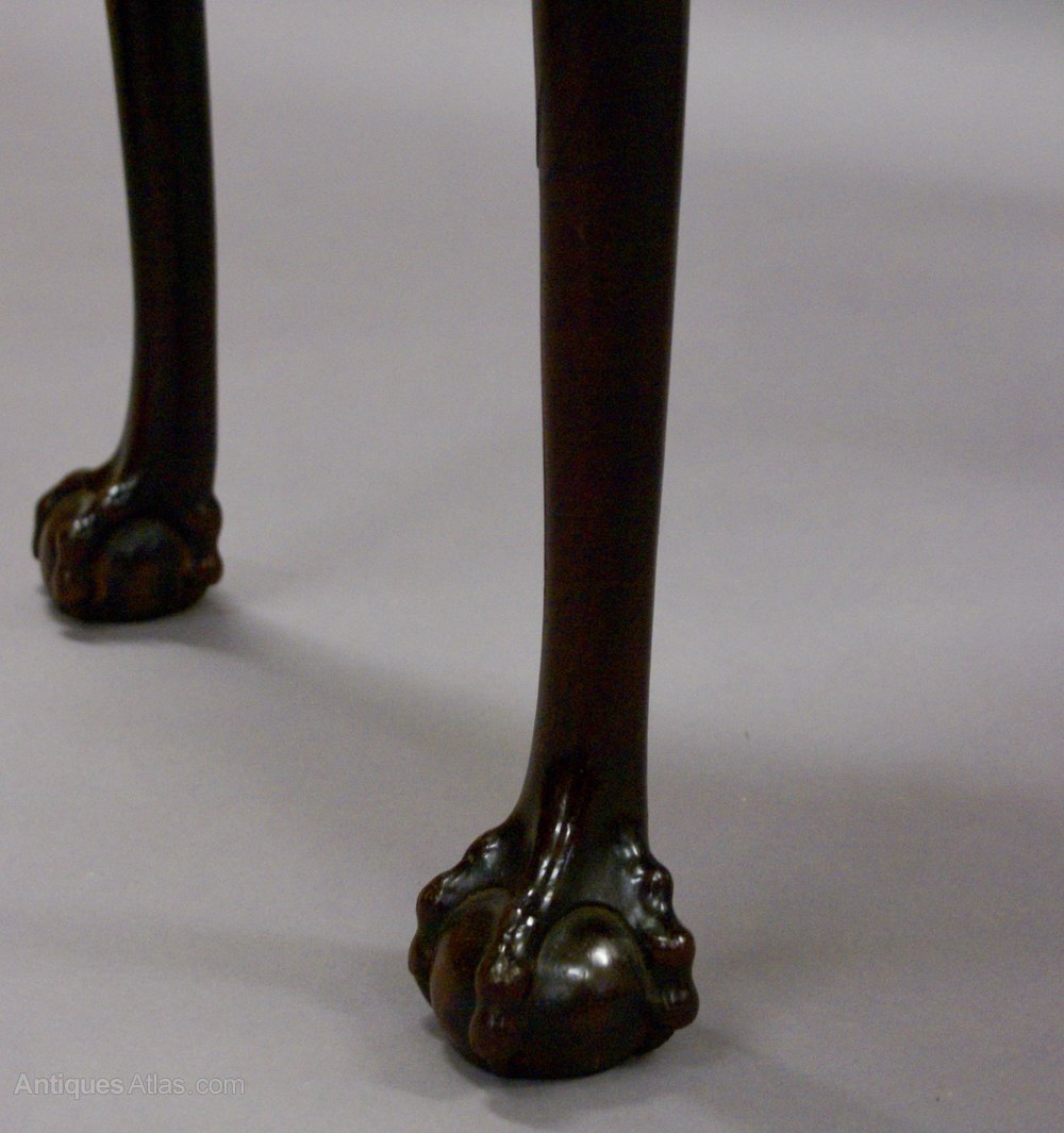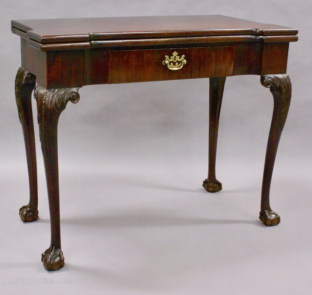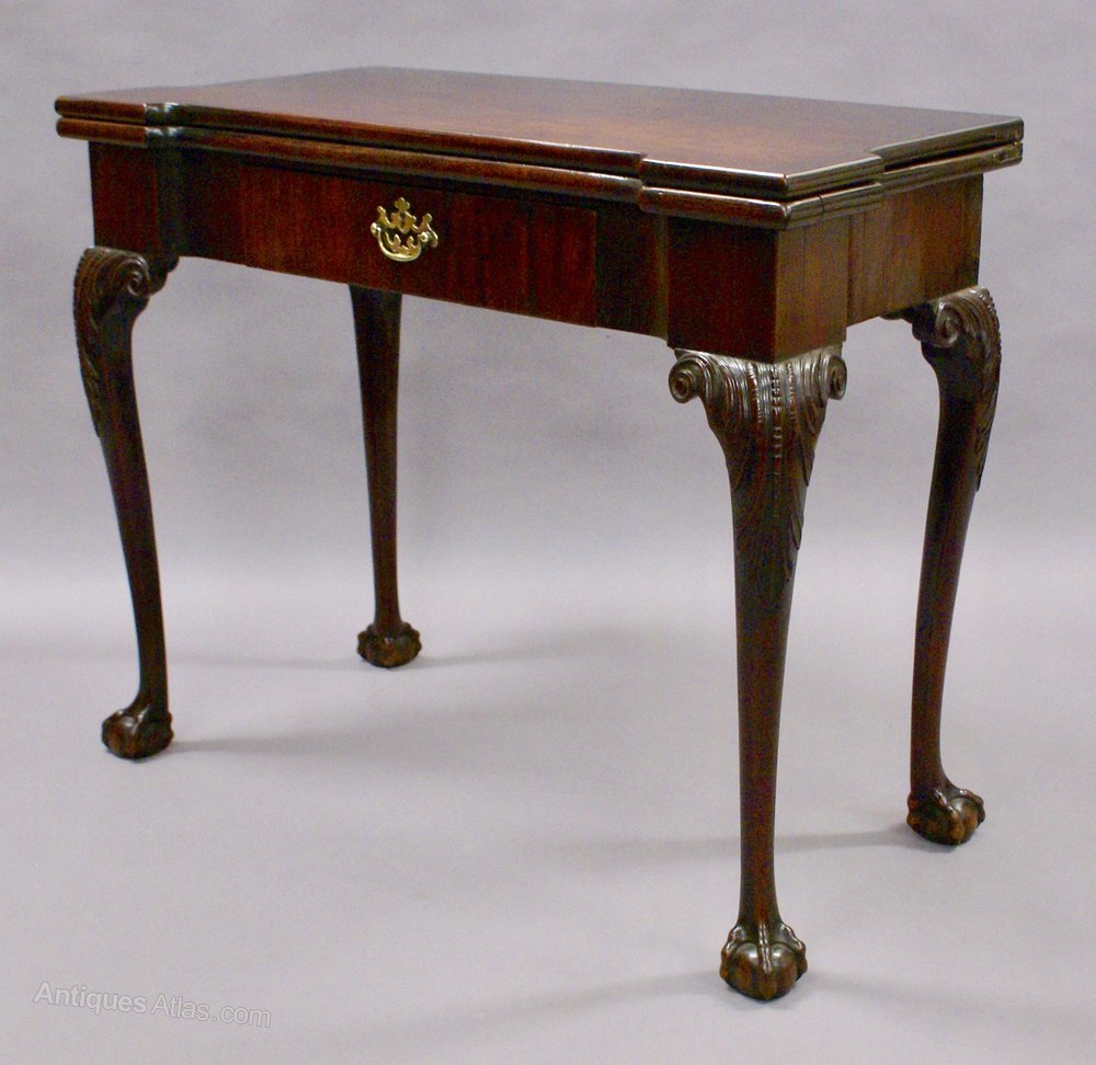 Raised on cabroile legs with claw and ball feet and carved knees depicting acanthus leaves and scrolls. The frieze has a single oak lined drawer with original handle. The top folds over to reveal the green baize playing surface. The table is in very good and original condition and retains a good colour and patina. 730mm high, 920mm wide and 450mm deep. Circa 1750.