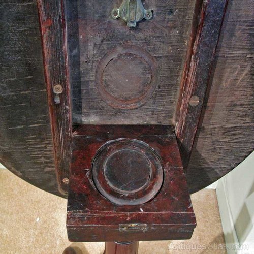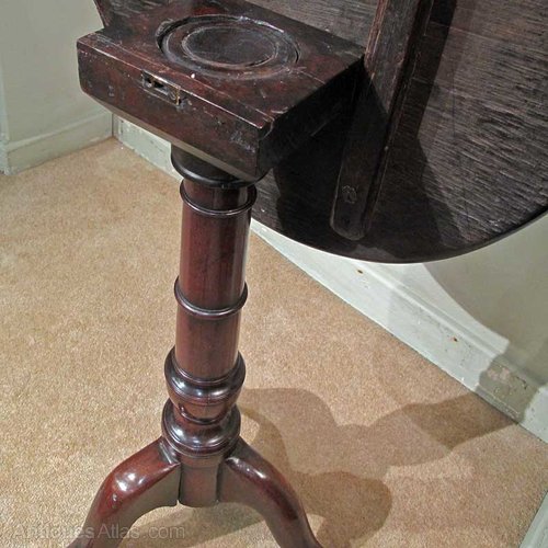 A gutsy, provincially made mahogany table, it has a wonderful single, revolving piece top, of uneven outline. The tip top mechanism which reveals an igenious birdcage, on top of a gun-barrel column on squat legs.