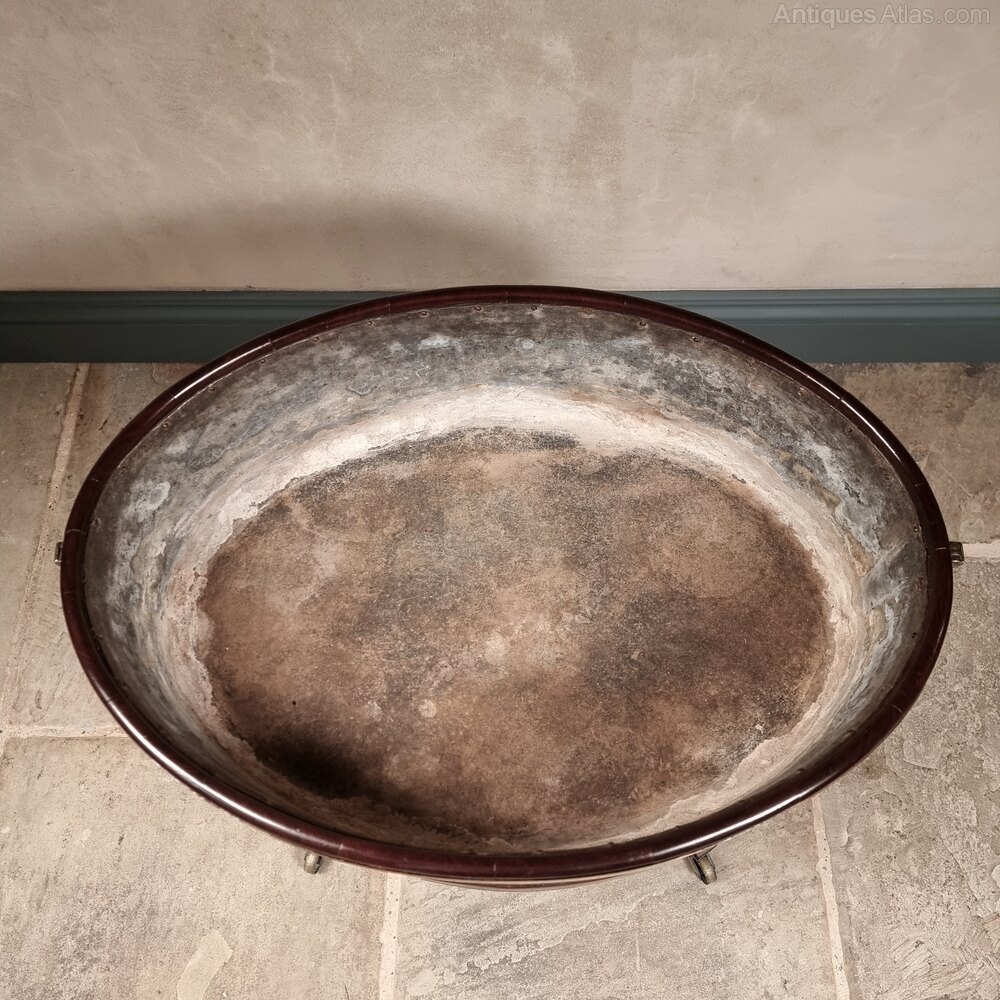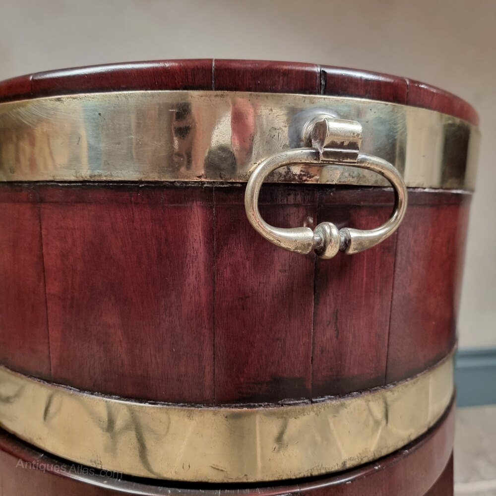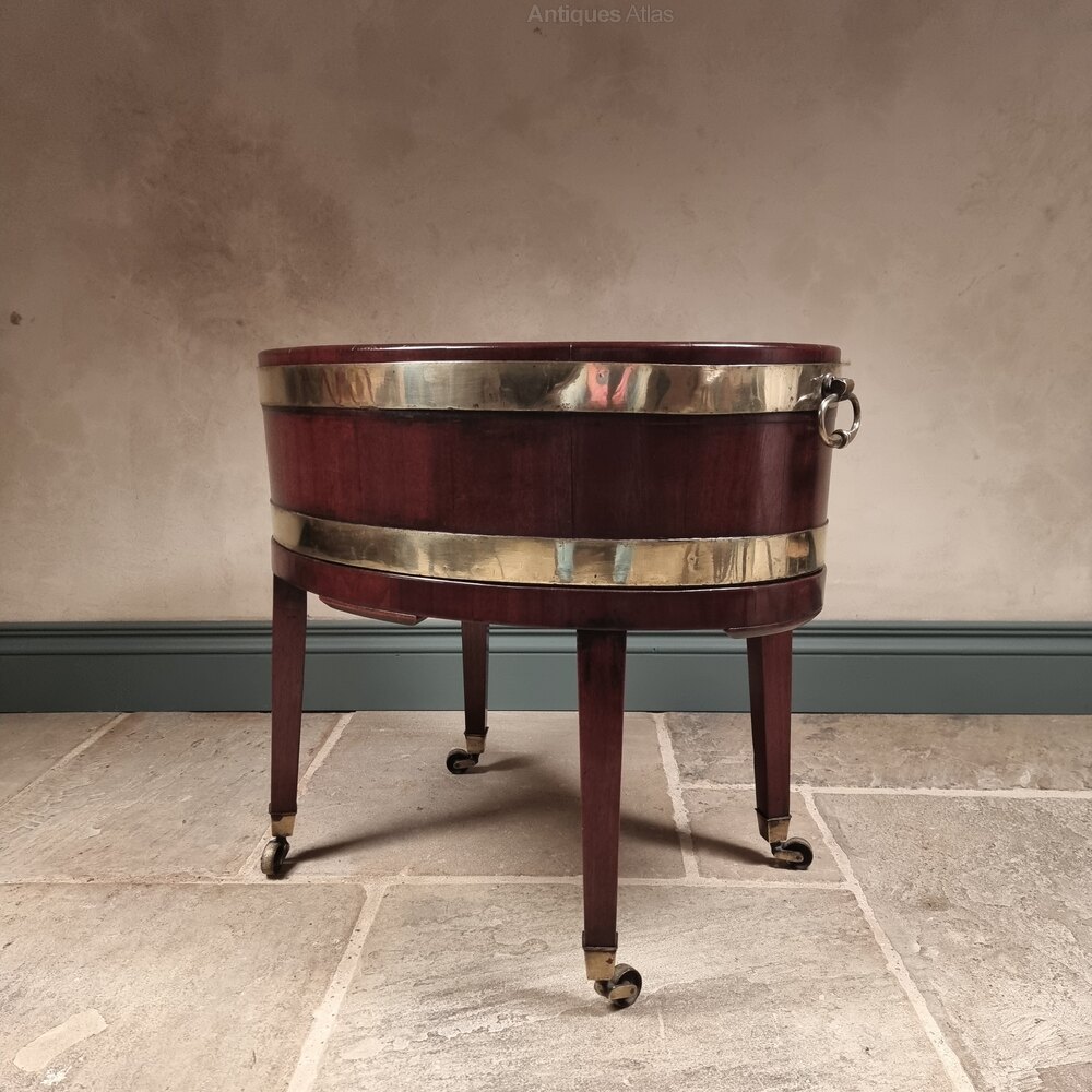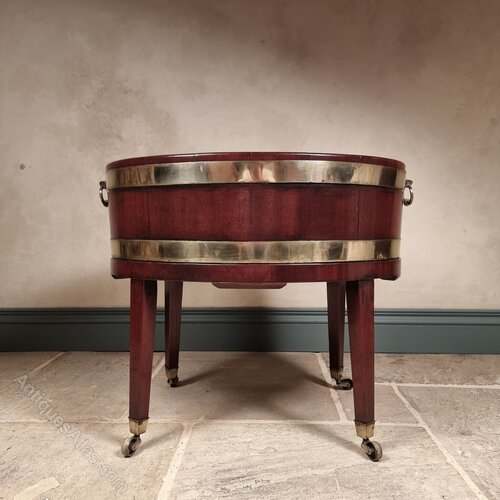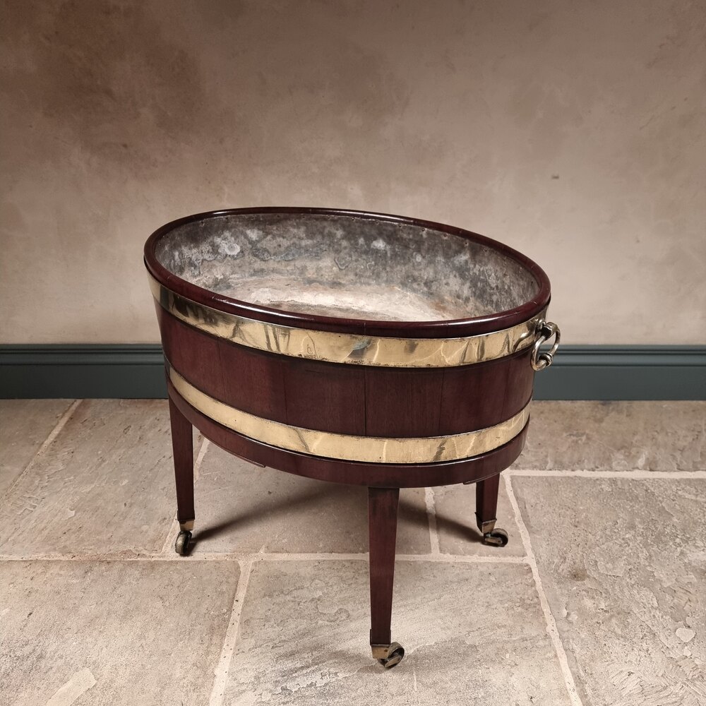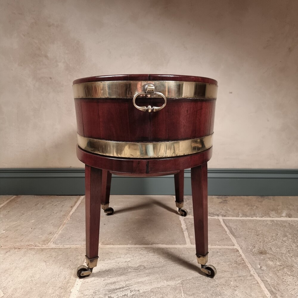 A George III mahogany lead lined wine cooler with brass coopered bands and loup handles, the base with four square tapered legs with original brass castors. The top lifts off of the base so the wine cooler can also be used on a table. This is a superb piece of georgian furniture with excellent colour and in fantastic original condition.