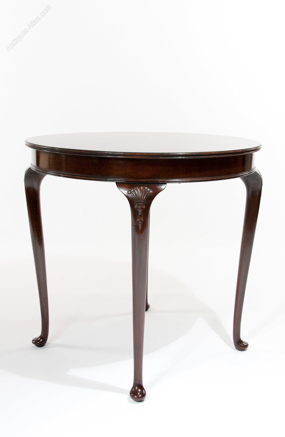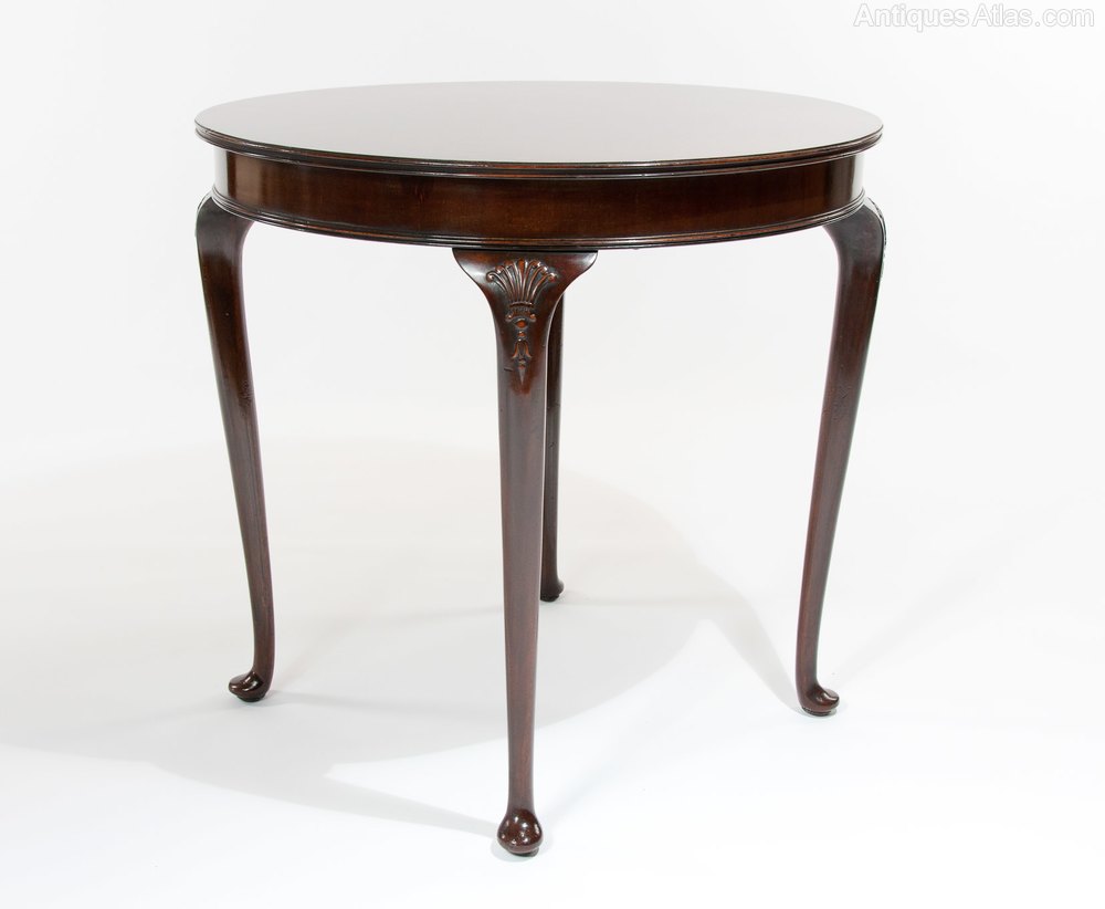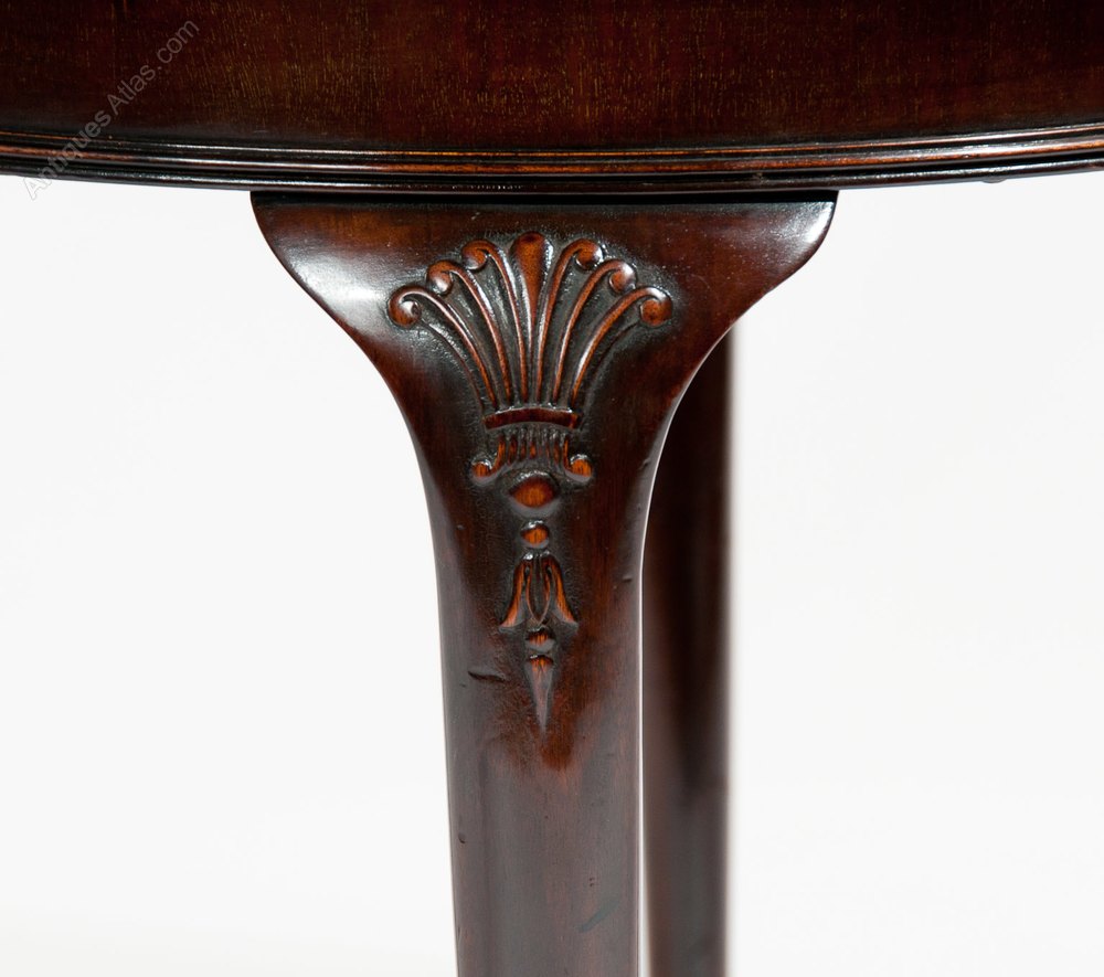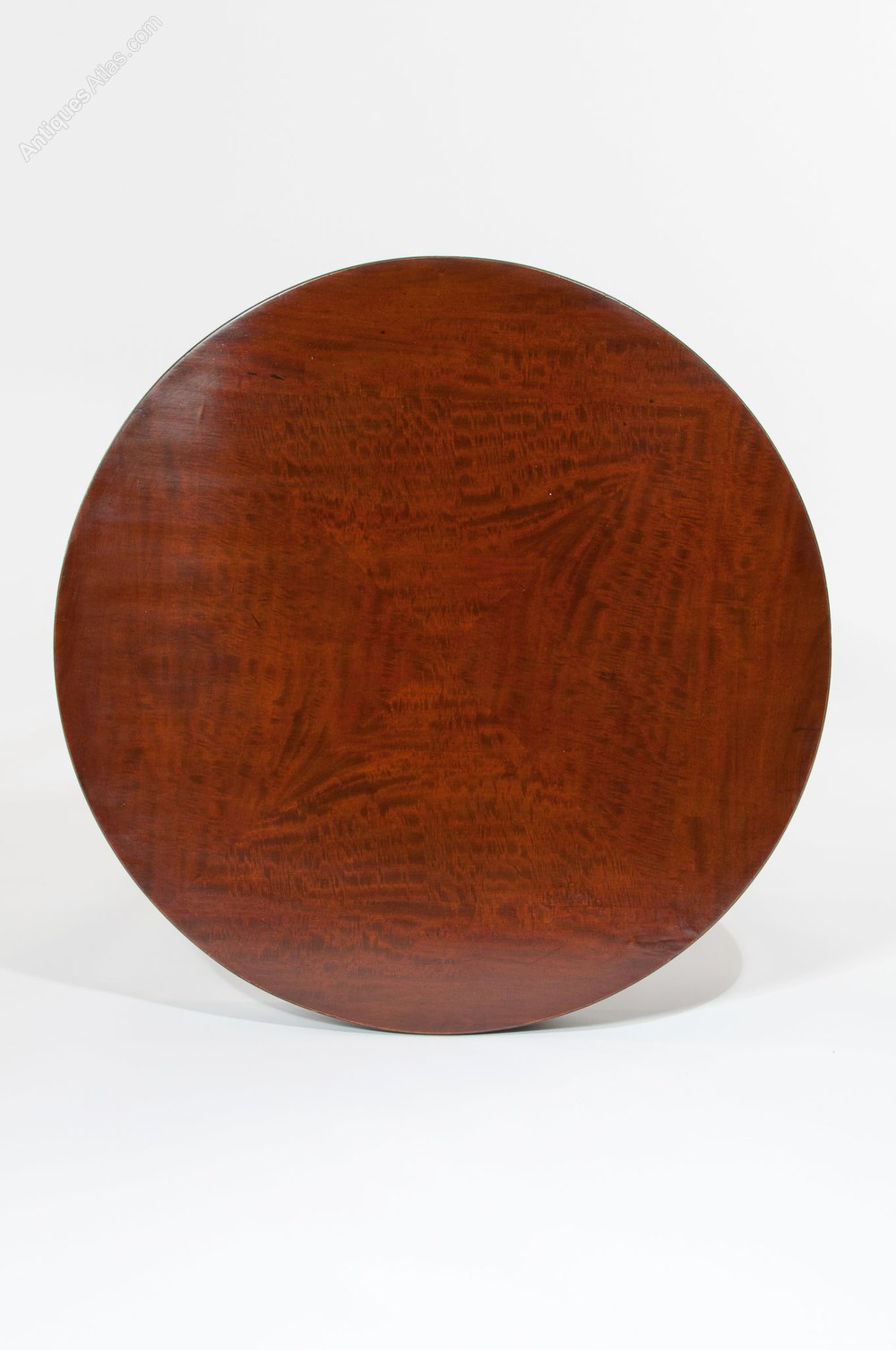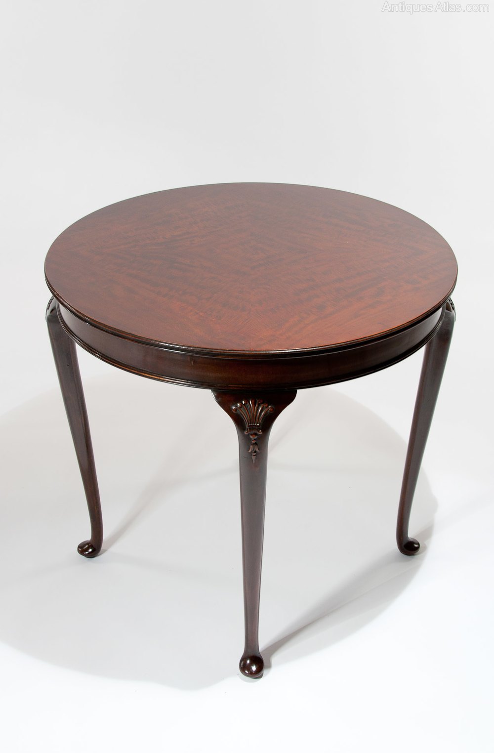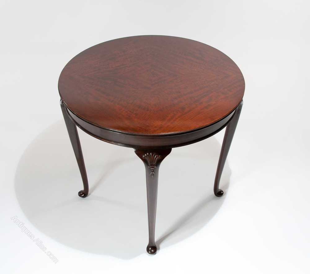 A good antique round mahogany center side table with carved knee. The round top quarter veneered in a lovely figured mahogany with moulded edge and veneered frieze raised of four slender shaped cabriole legs with carved knee terminating on pad feet.