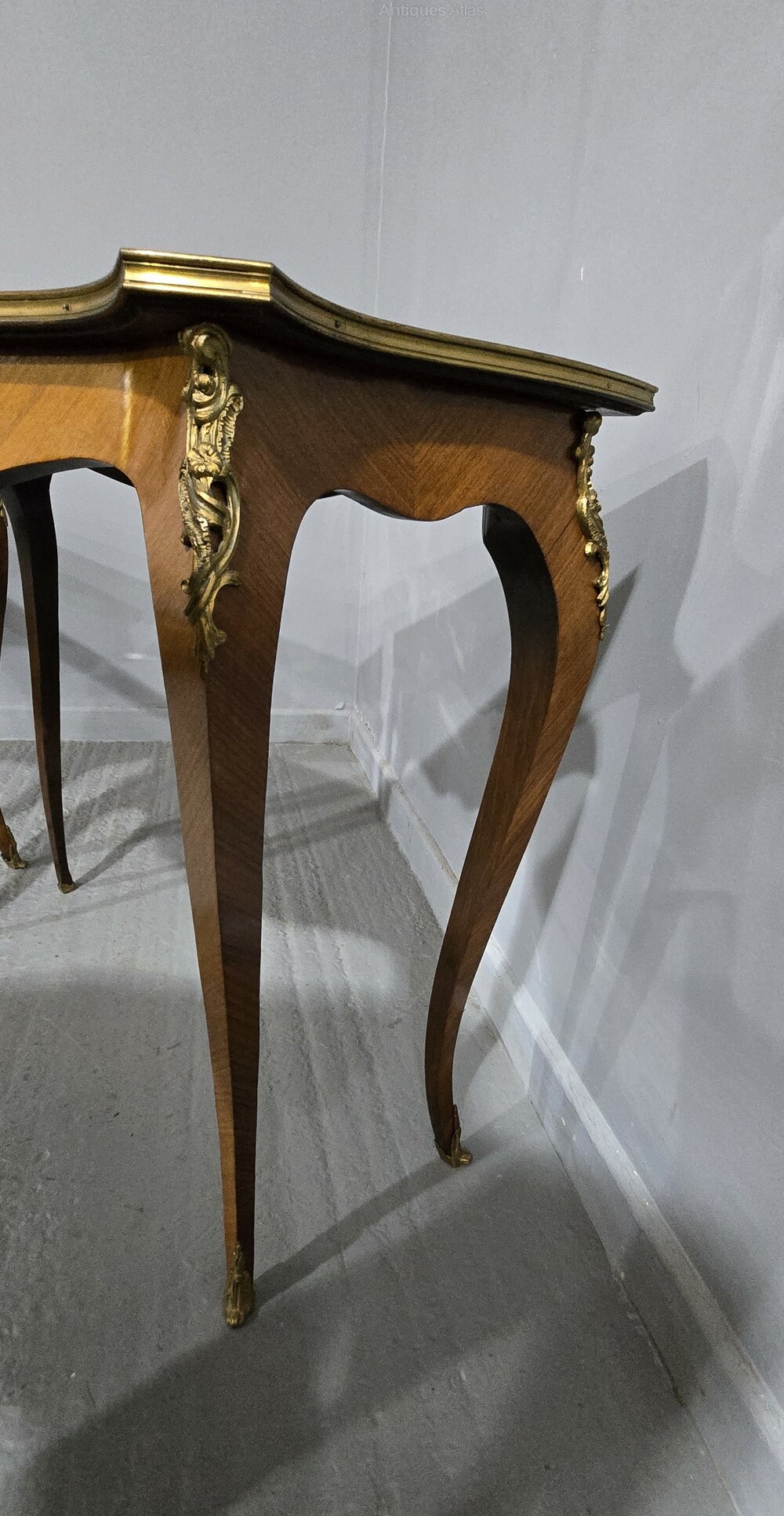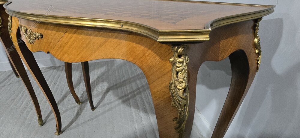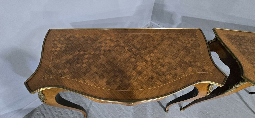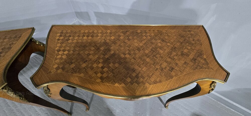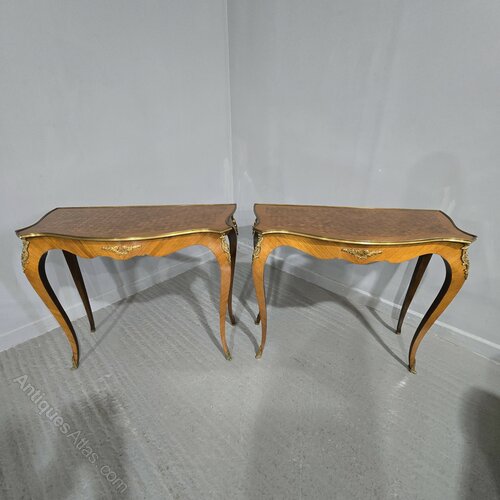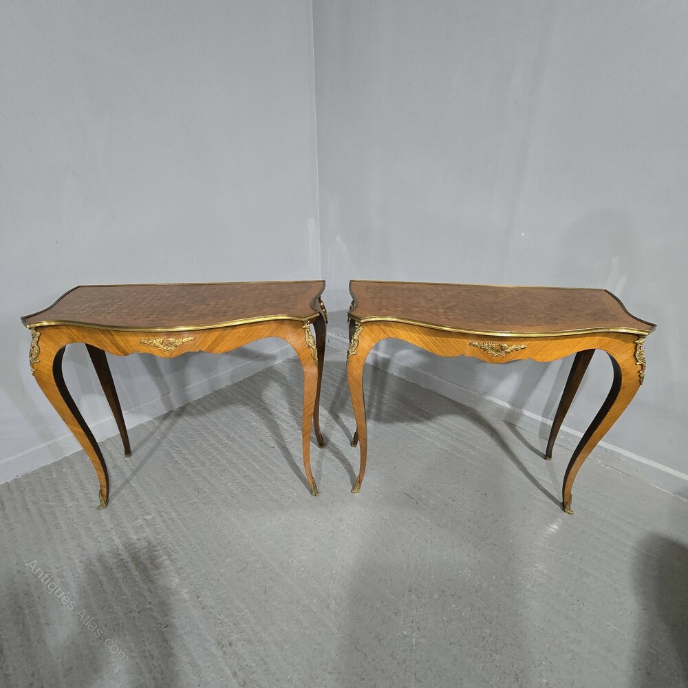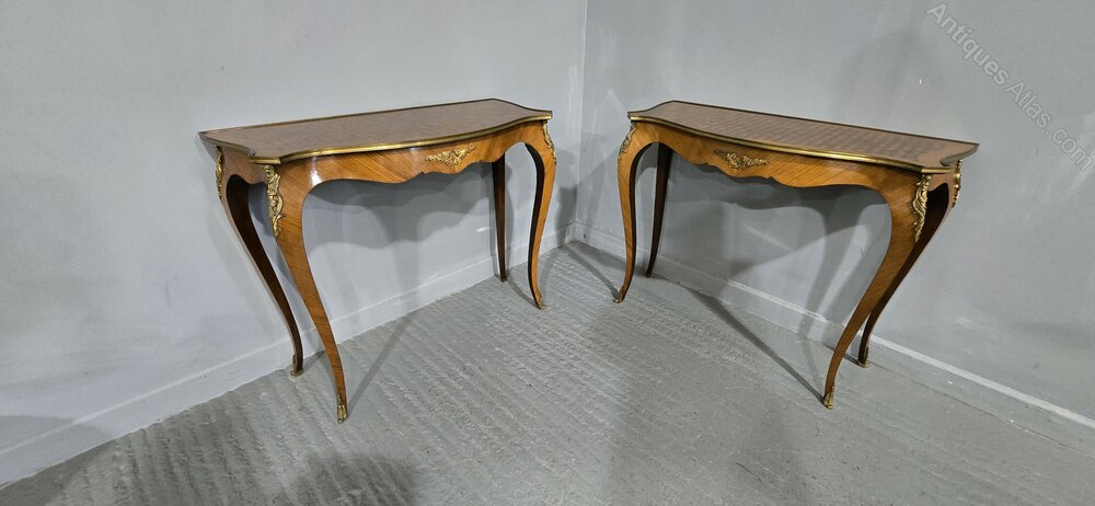 A very nice pair of French tulipwood and parquetry hall tables, freestanding with brass gallery to all sides, good ormolu mounts, in overall very good condition.