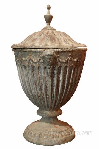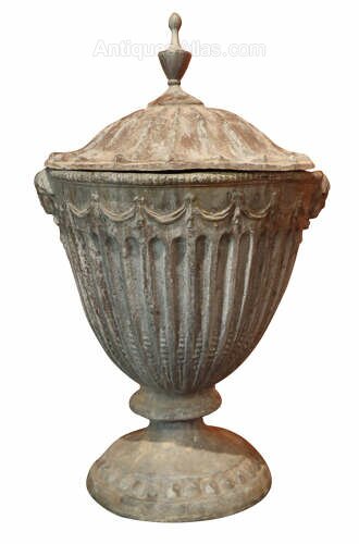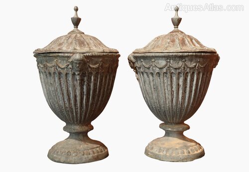 A handsome and well-modelled pair of lead urns in the Adam revival style, early 20th century, each retaining its original domed lid with flame finial. Of classical campana form with reeded bodies, bead-edged bases and decorative swags beneath the rim, the design incorporating small moulded masks in true neo-classical taste.