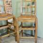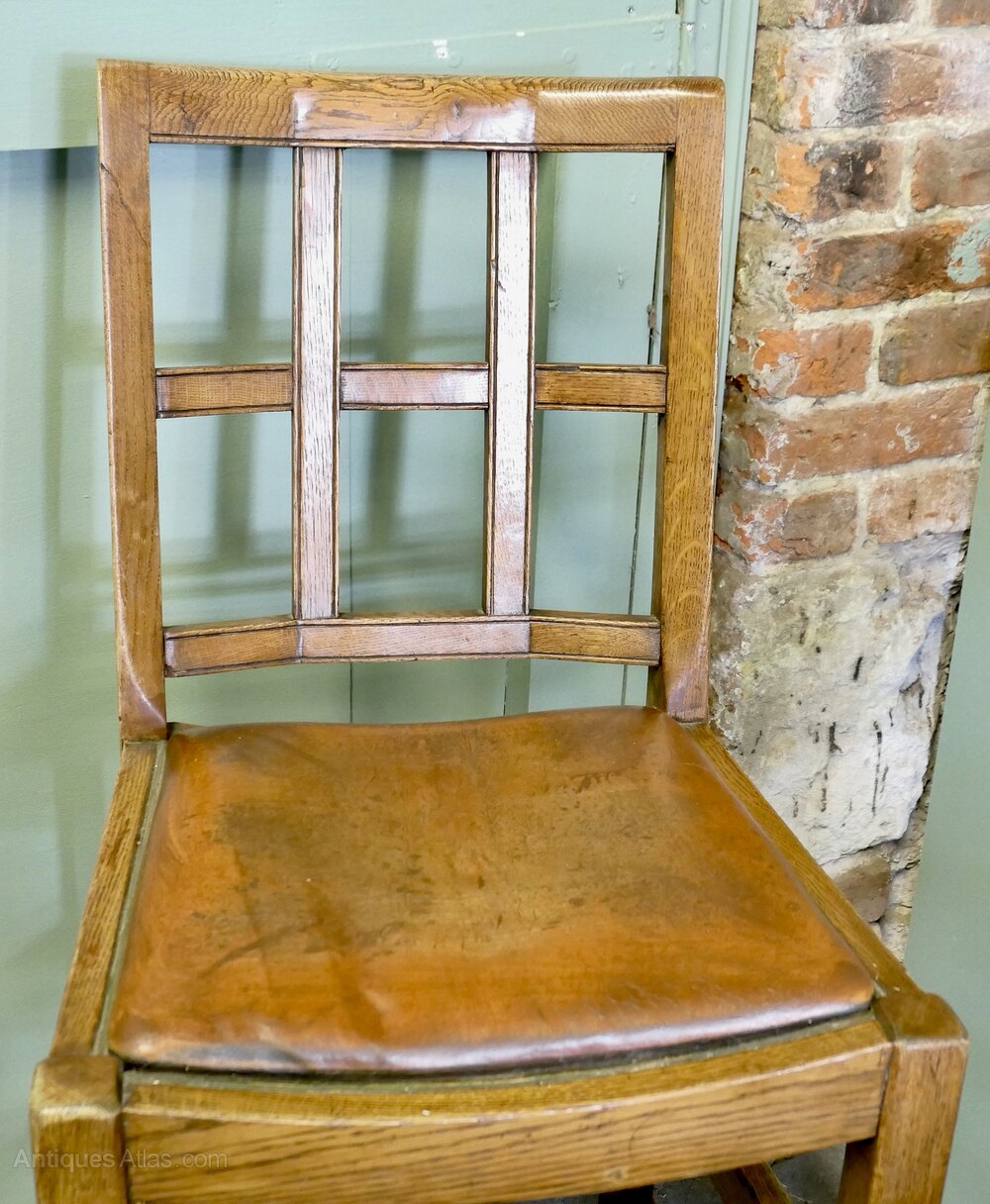 A trio of early 20th century oak lattice back dining chairs, probably by Heals, the chairs are in Golden Oak. They have the original Leather seats, and now age worn comfort, they have no rips or tears, just well worn comfort, the chairs are very sturdy with double stretchers all the way around and the bottom front has a brass kick plate
