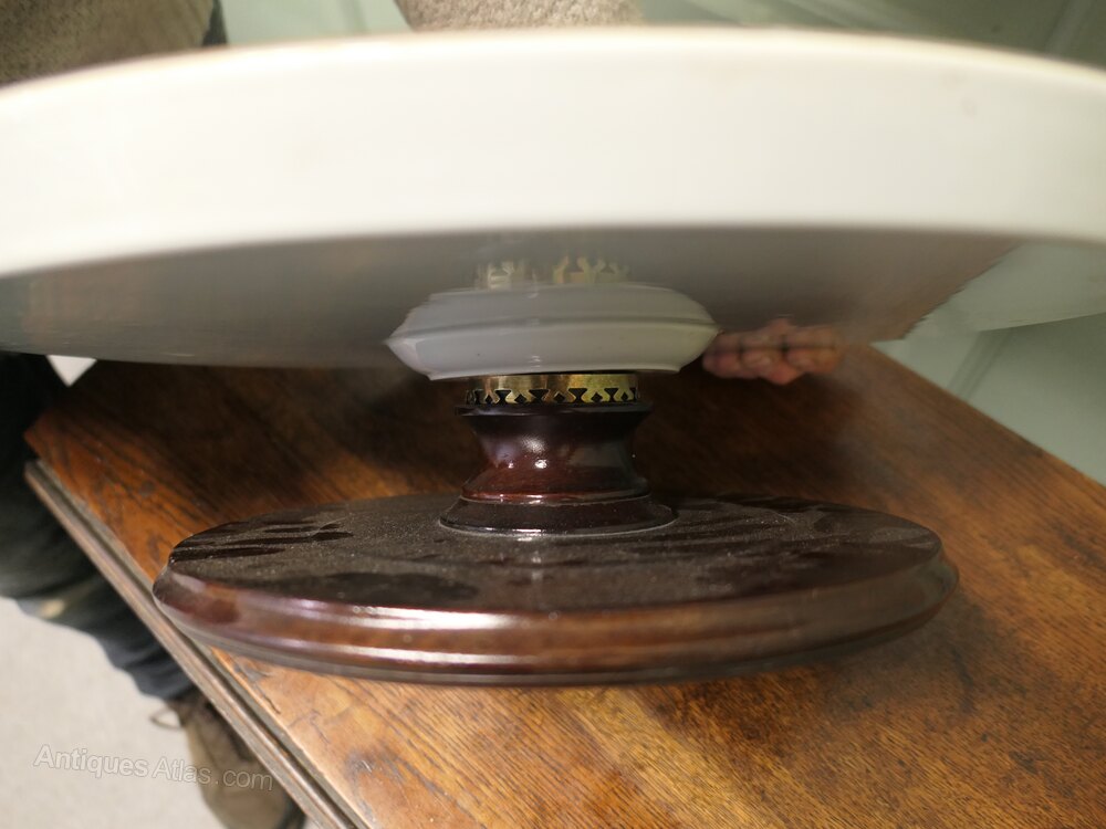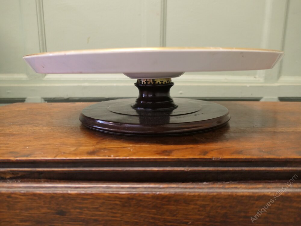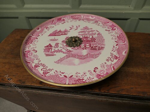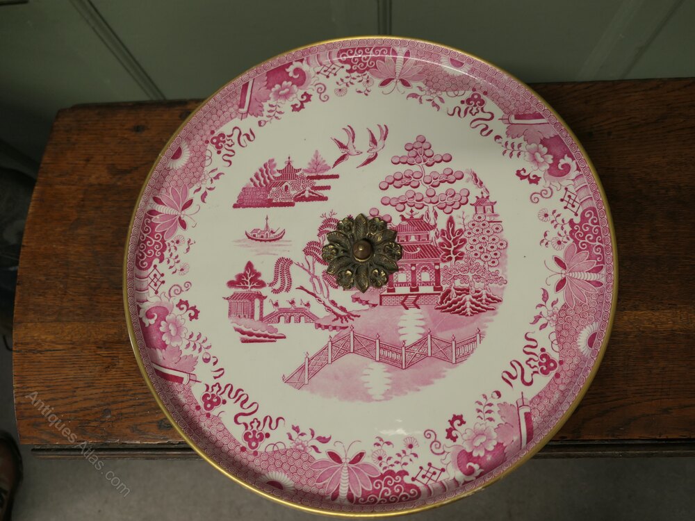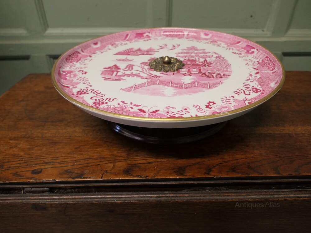 A superb large dinner party size piece, most unusually this piece is in Red and White Willow Pattern with a gold rim around the edge, the comport has a very well designed stand in wood and brass all in very smooth working order