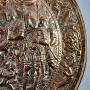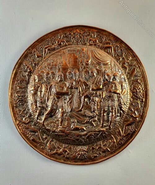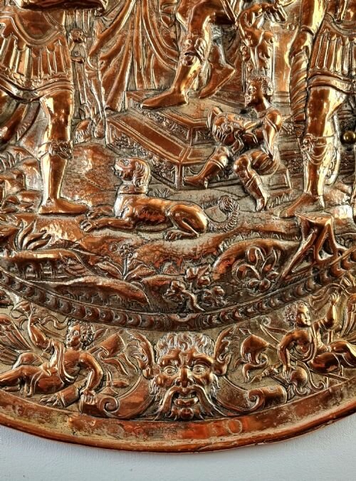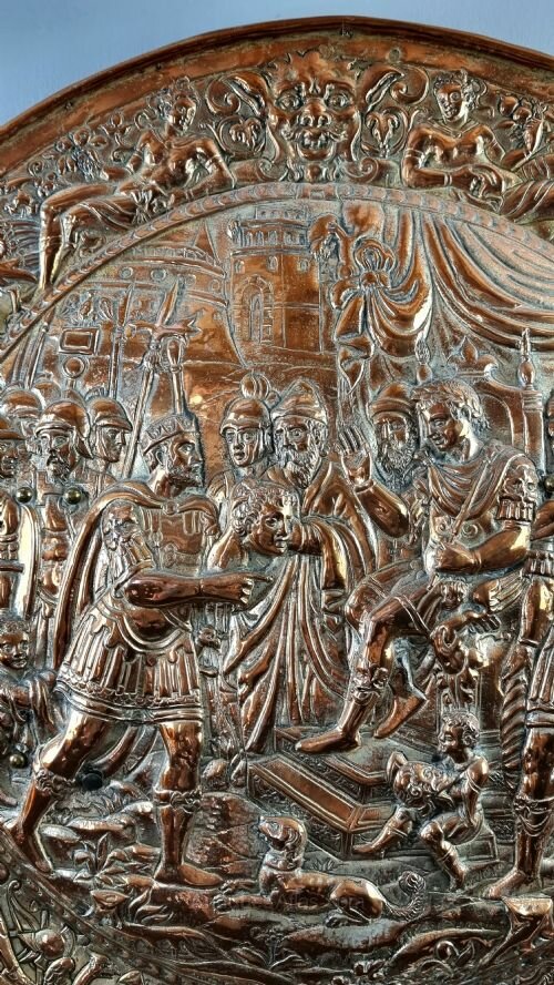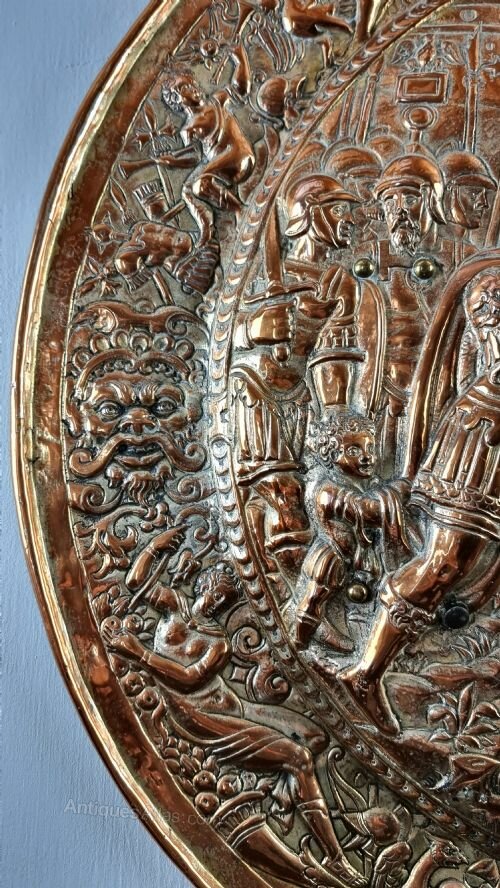 A large 19th century brass repousse shield with traces of silvering. The shield depicts the scene of the severed head of pompey being presented to Julius Caeser.
