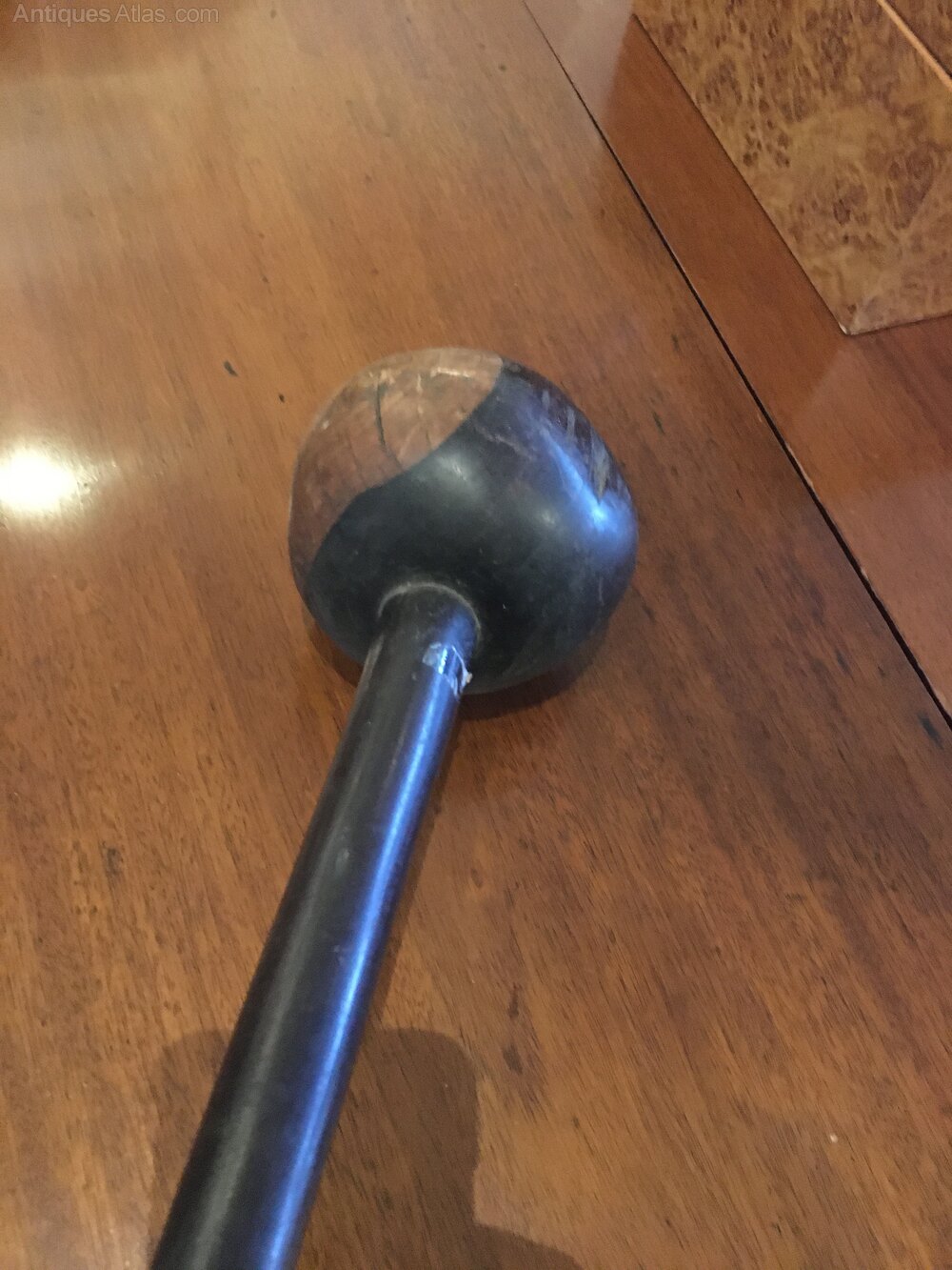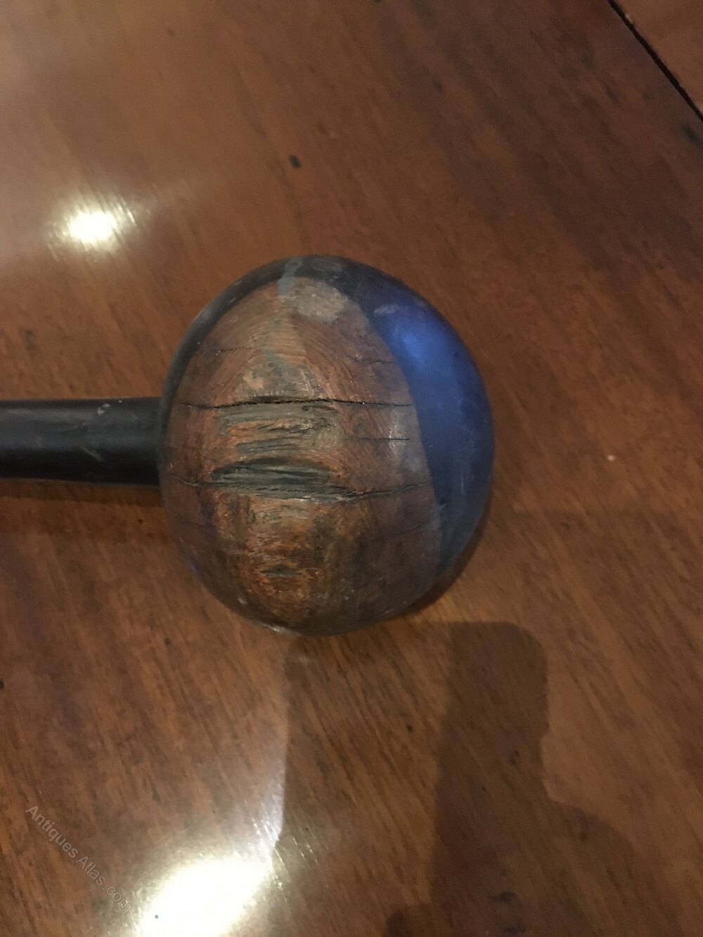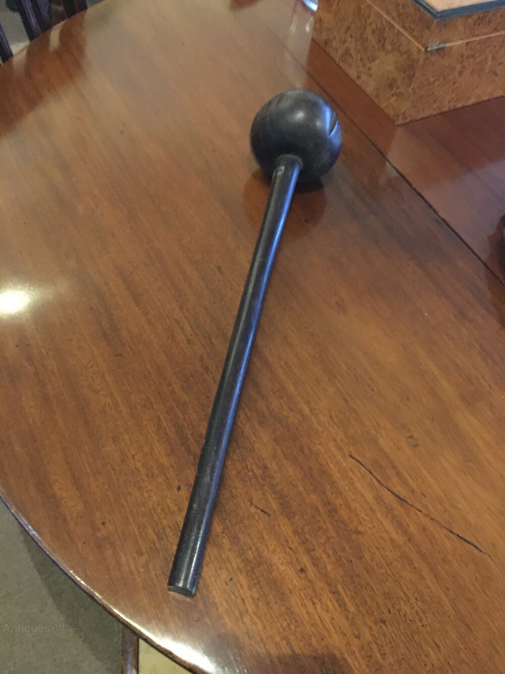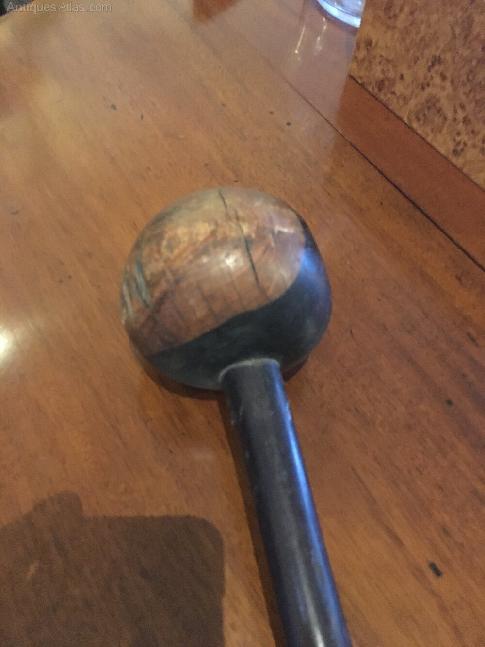 A large heavy Kerrie this one has a short shaft44 cm with a 34 cm head overall 53 cm . Good dark age patina the whole one piece of hardwood the whole shows its age and use . A good heavy short weapon.