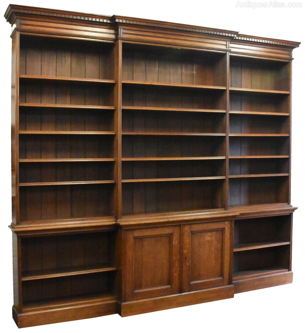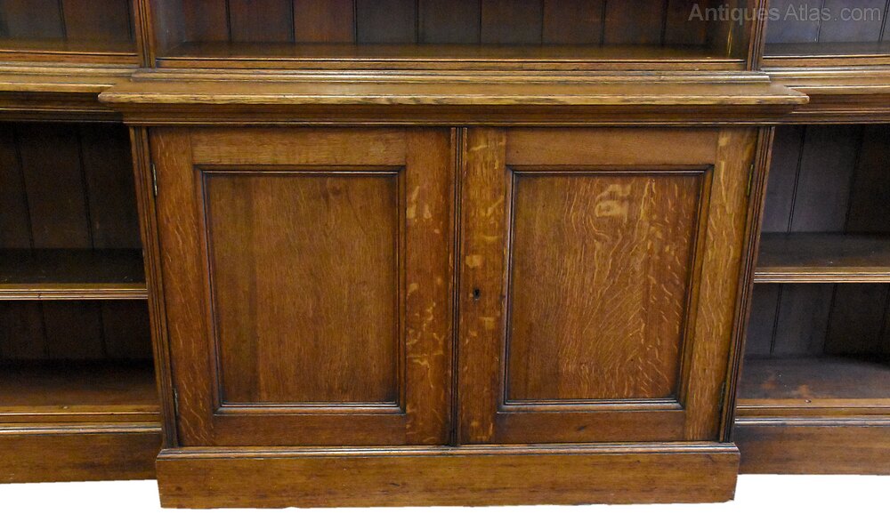 Circa 1870. A large mid-Victorian oak open bookcase, with a moulded cornice with dentil detail and frieze with scratch carving, each section has 5 adjustable shelves with stylish facings, the breakfront base with two cupboards, inside a single shelf, flanked by a pair of open sections with a single shelf. The extraordinarily large, clean bookcase breaks into about 7 sections. Approximately 22m of linear book space.