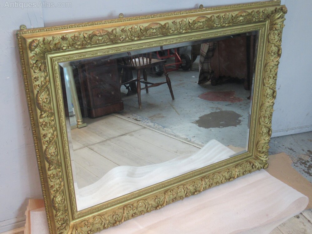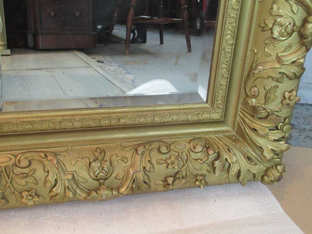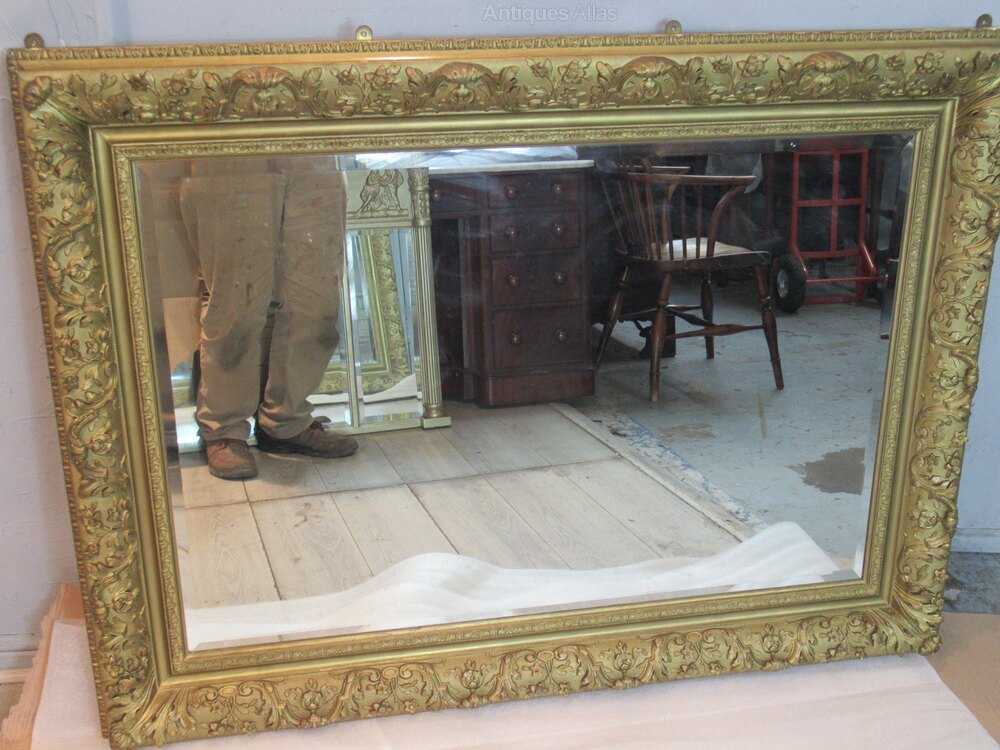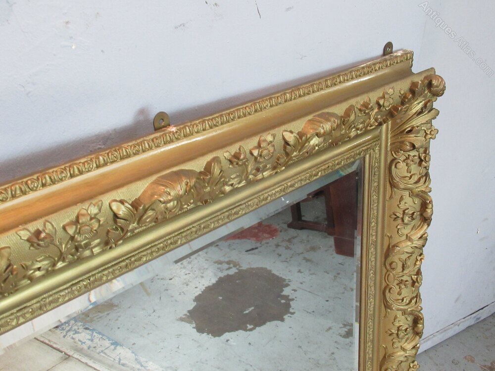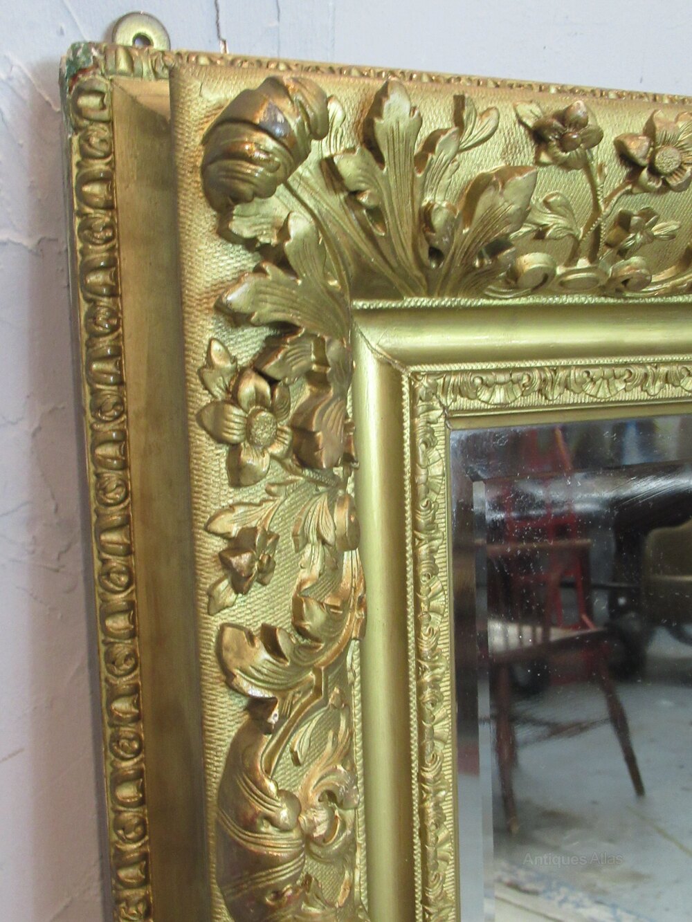 A large heavy gilt framed wall mirror , dating from around 1900. The deep frame with ornate decoration in antique gold. It has a bevel edge mirror glass in good condition. The back of the mirror has been covered with a board finish.