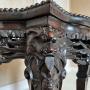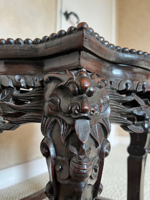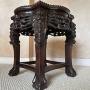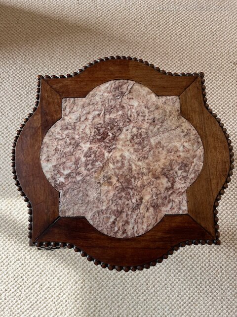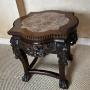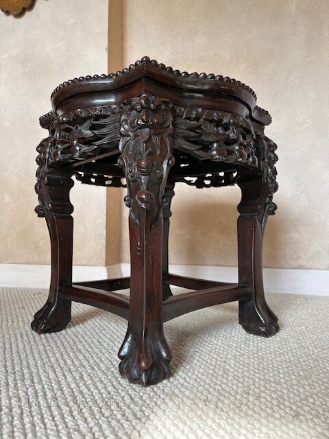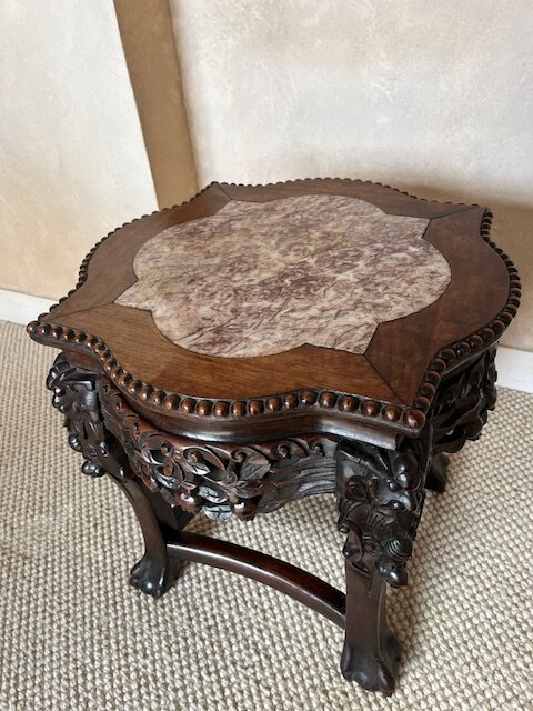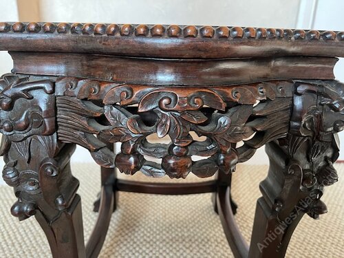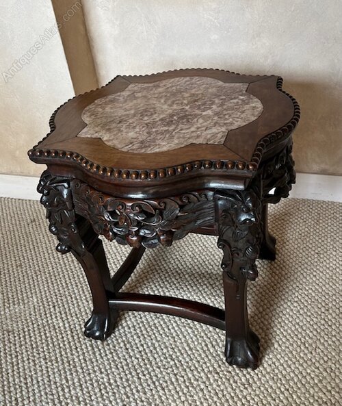 This stands consist of shaped Chinese rouge marble tops recessed into the hardwood tops with ball bead carving to the outer edge.