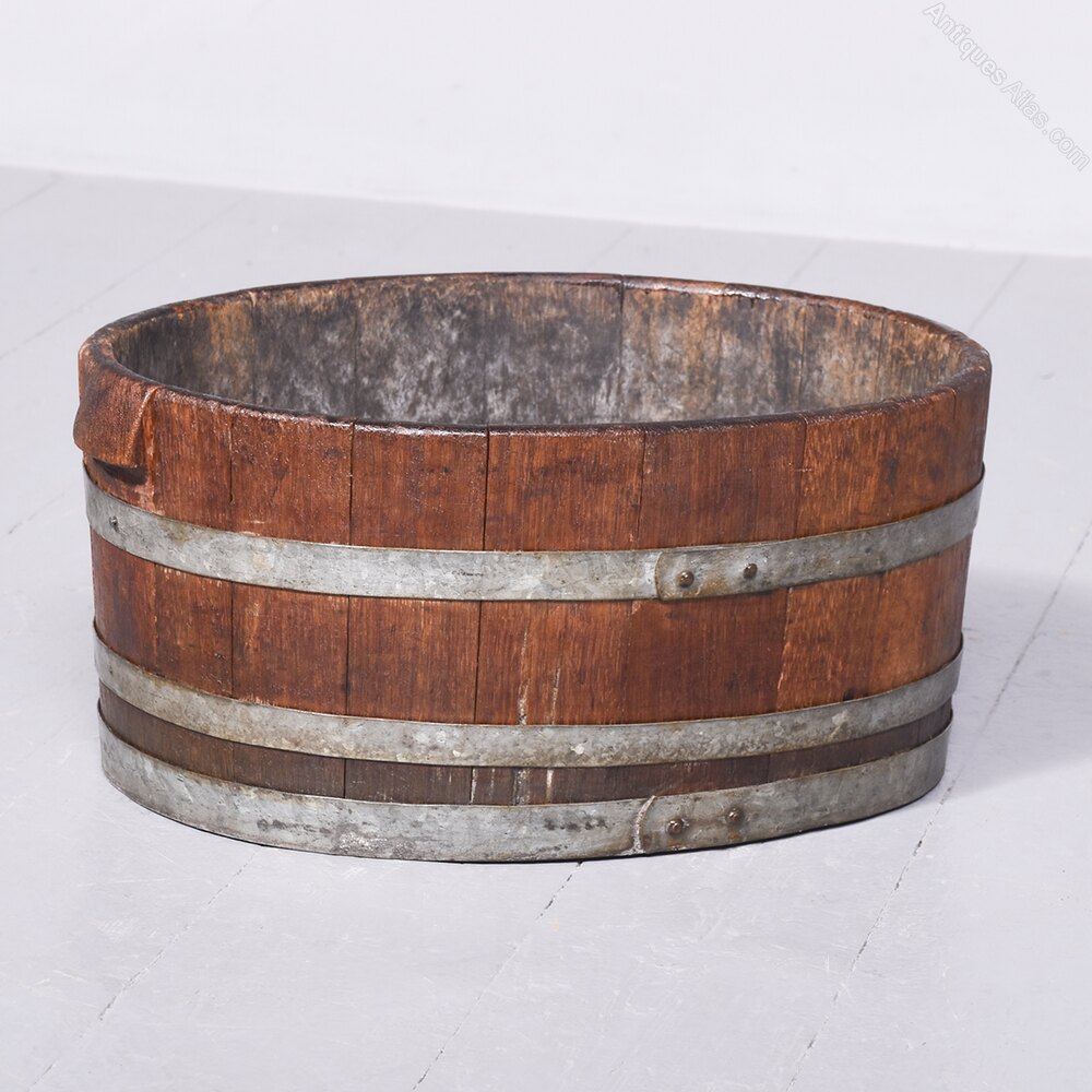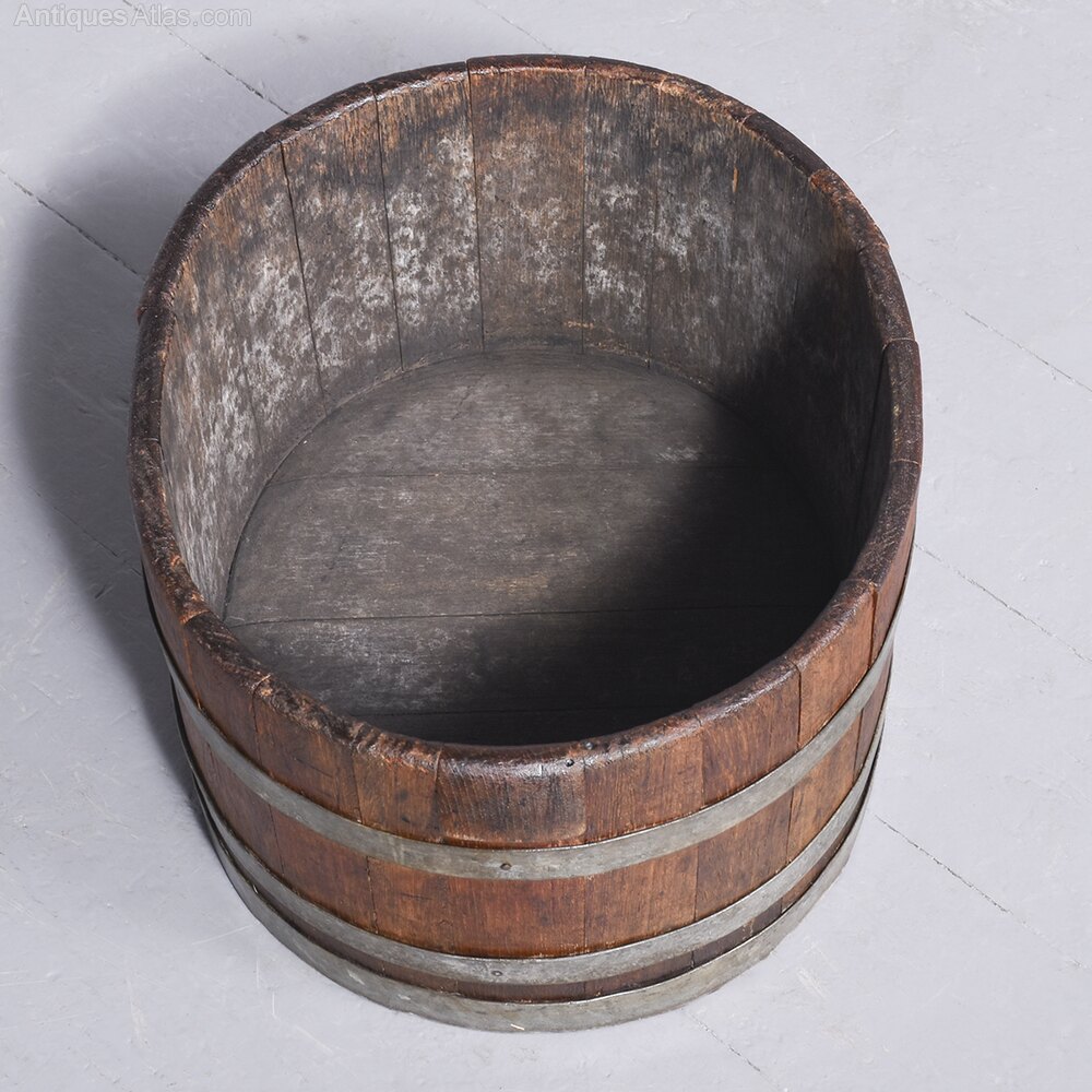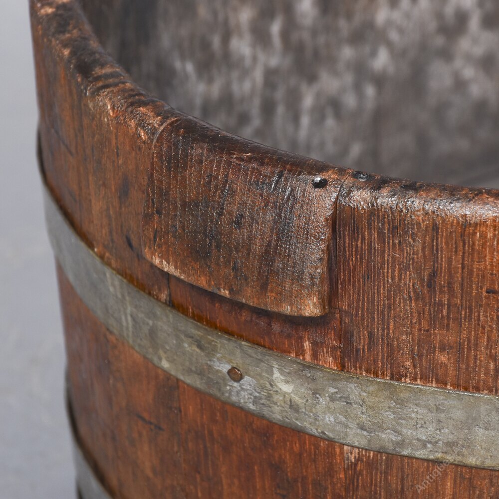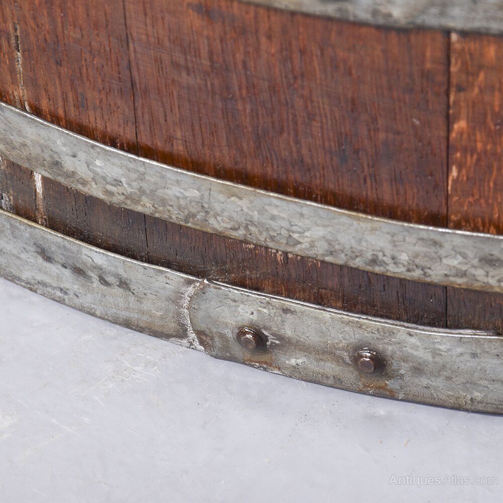 Circa 1900. A neat sized low oak staved barrel, with held in place by three polished steel bandings, the ends and the top are a slightly thicker to form a grip, the bottom is in staved in oak.