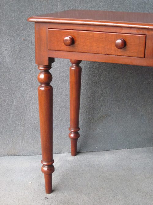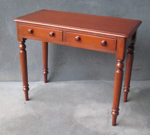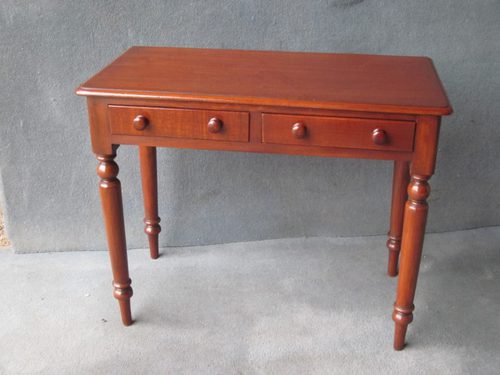 A mahogany 2-drawer side table standing on turned legs. The drawers are mahogany lined and have turned wooden knobs