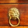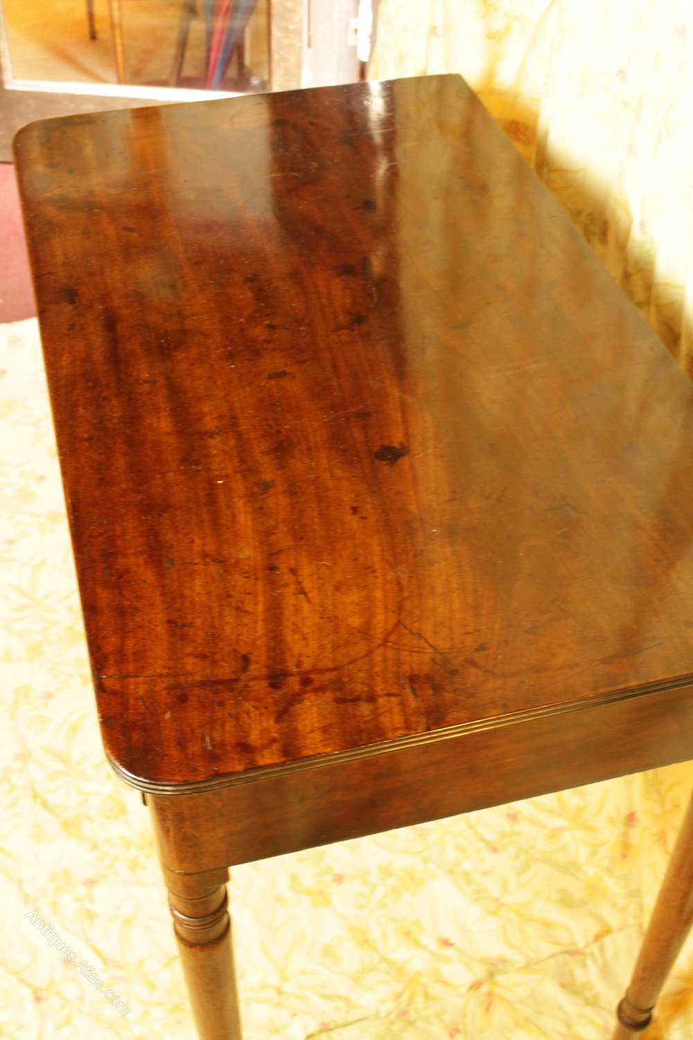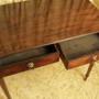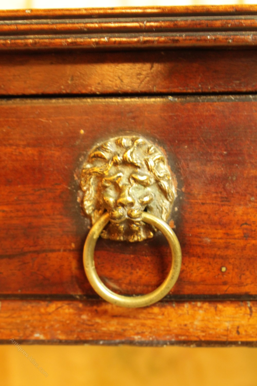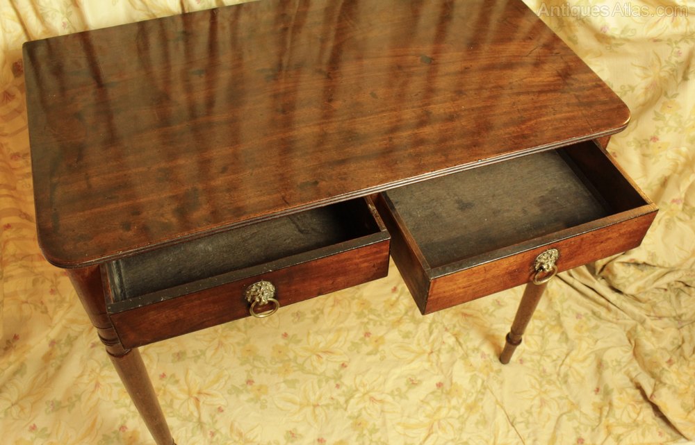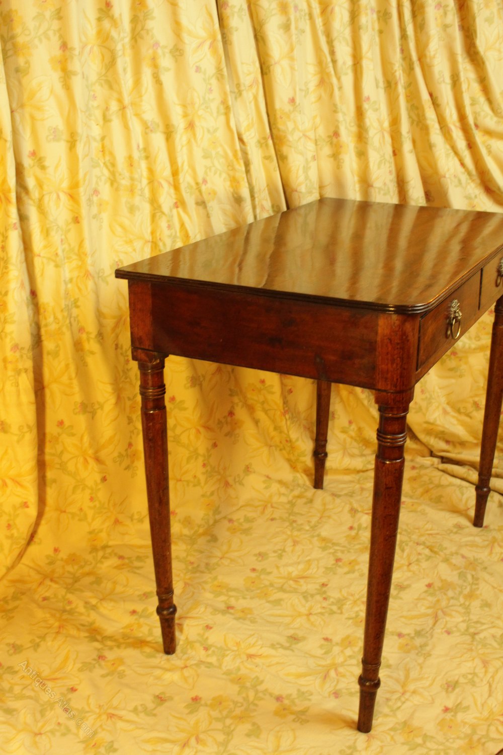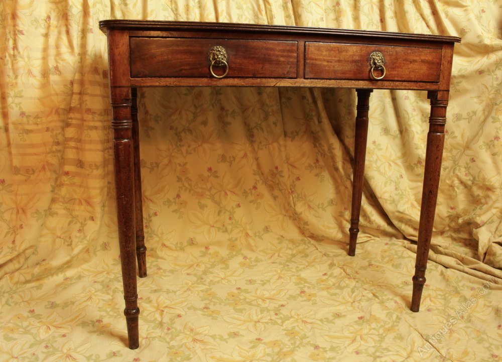 A Georgian mahogany and ebony two drawer side table with original lions head handles and turned tappering legs. This table has wonderful colour / pantia.