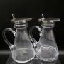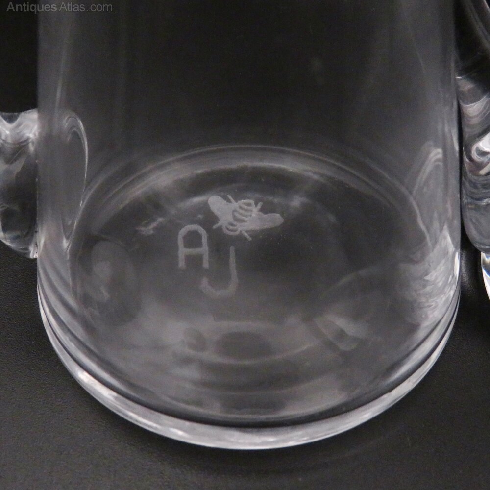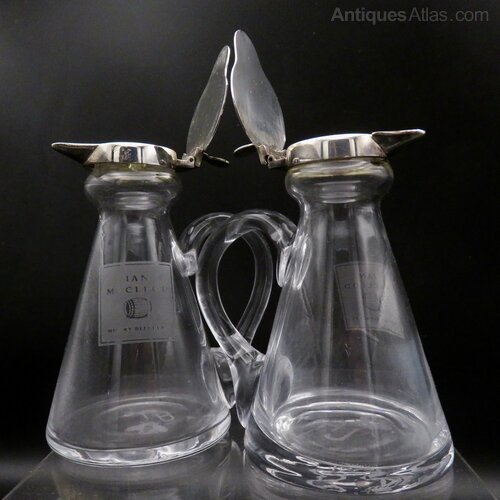 Each of the glass decanters is signed on the base AJ with a Bee motif, so they are made by the same person. The silver differs though: one cap/lid is hallmarked to Hamilton & Inches of Princess St Edinburgh, and dated to 2000, the other is by Annabel Jones, assayed in London and dated 1999.