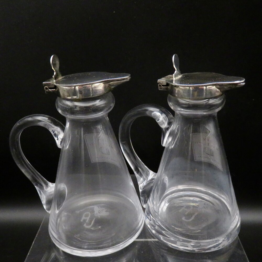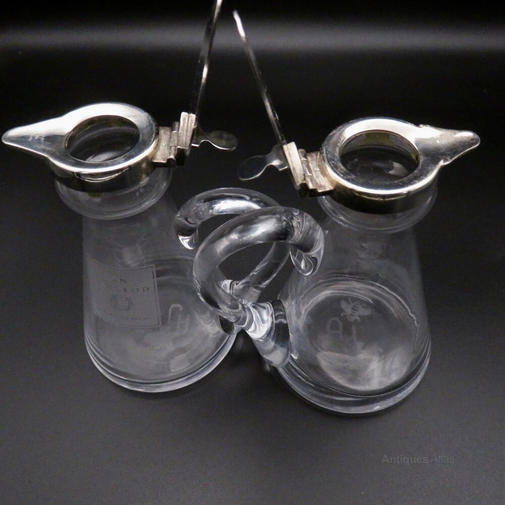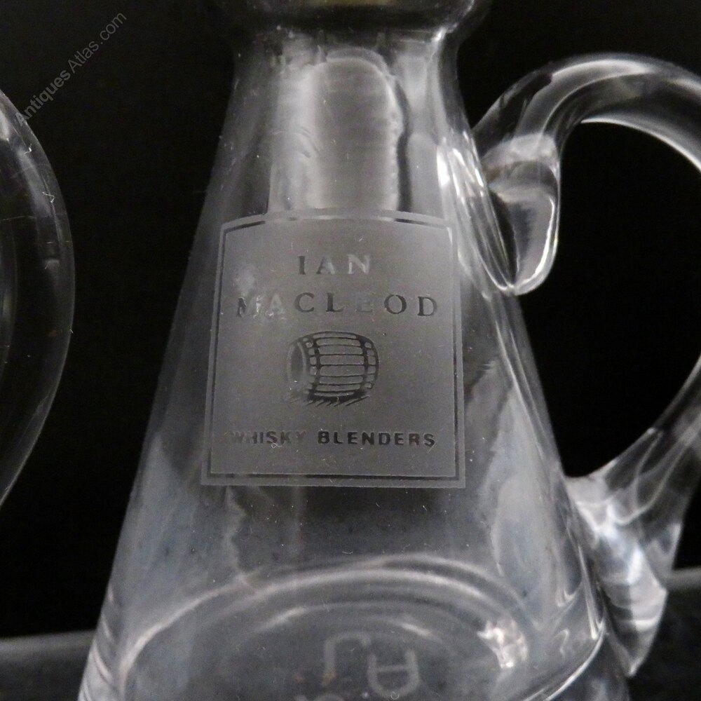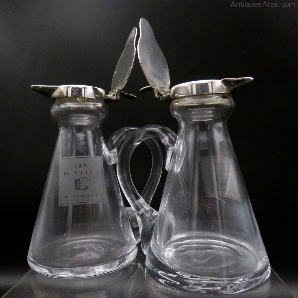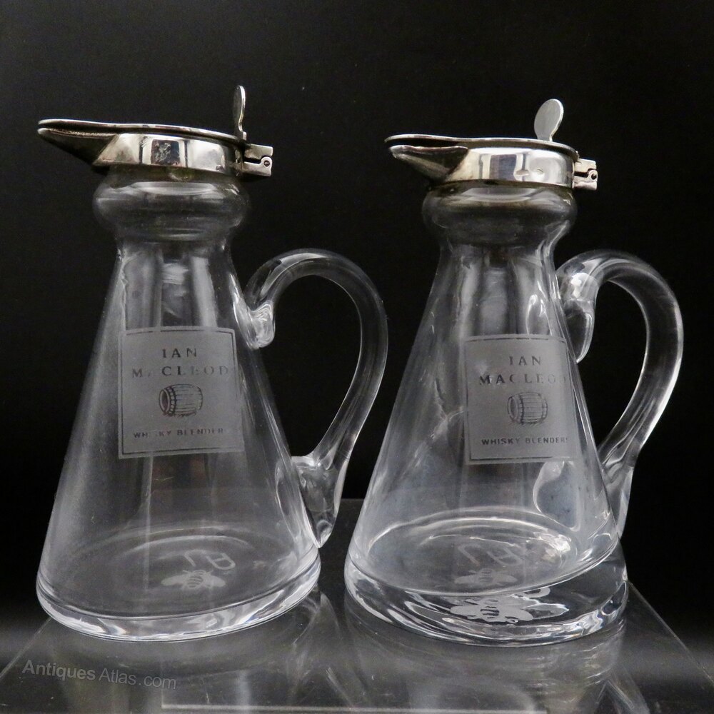 A very well matched pair of almost identical whisky noggins or tots, made of signed crystal glass with hallmarked sterling silver hinged lids. Although they both look the same, and are both etched for Ian Macleod, Whisky Blenders, and have almost identical silver caps, these are hallmarked one year apart and for different silversmiths.