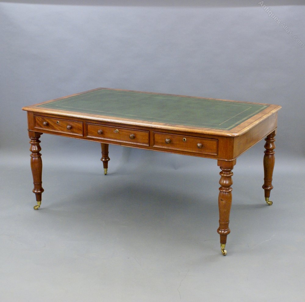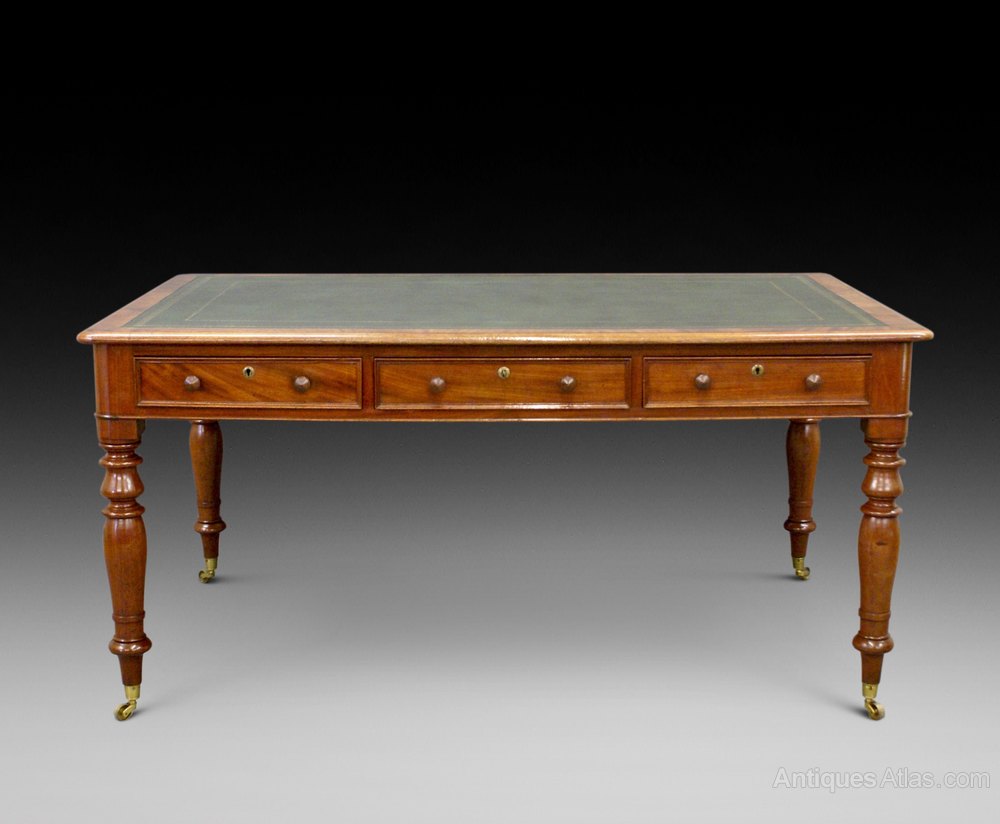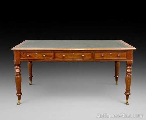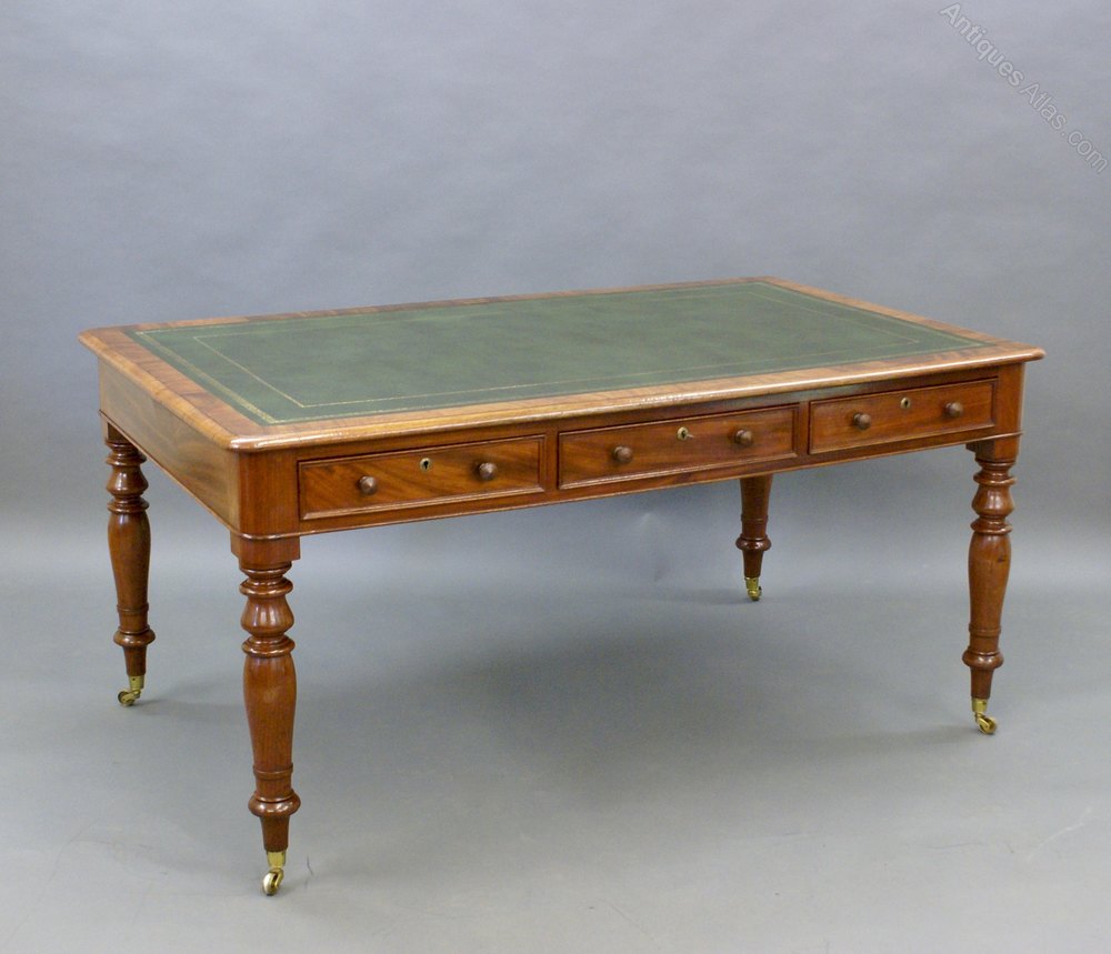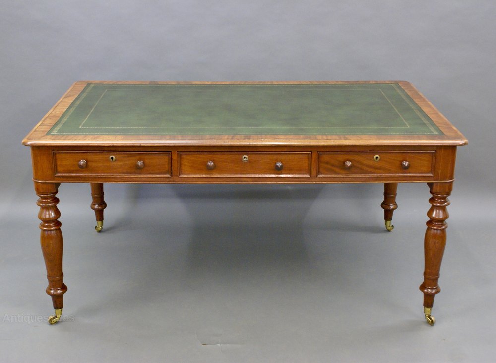 A mid-19th C mahogany, partners writing table. Raised on turned baluster legs with original brass castors and with six, oak lined drawers all retaining their original turned wooden knobs and brass locks. The top with molded edge, cross banding and inset green leather with gold tooling. In good condition. 740mm high, 1530mm wide and 930mm deep. Circa 1850.