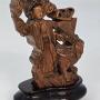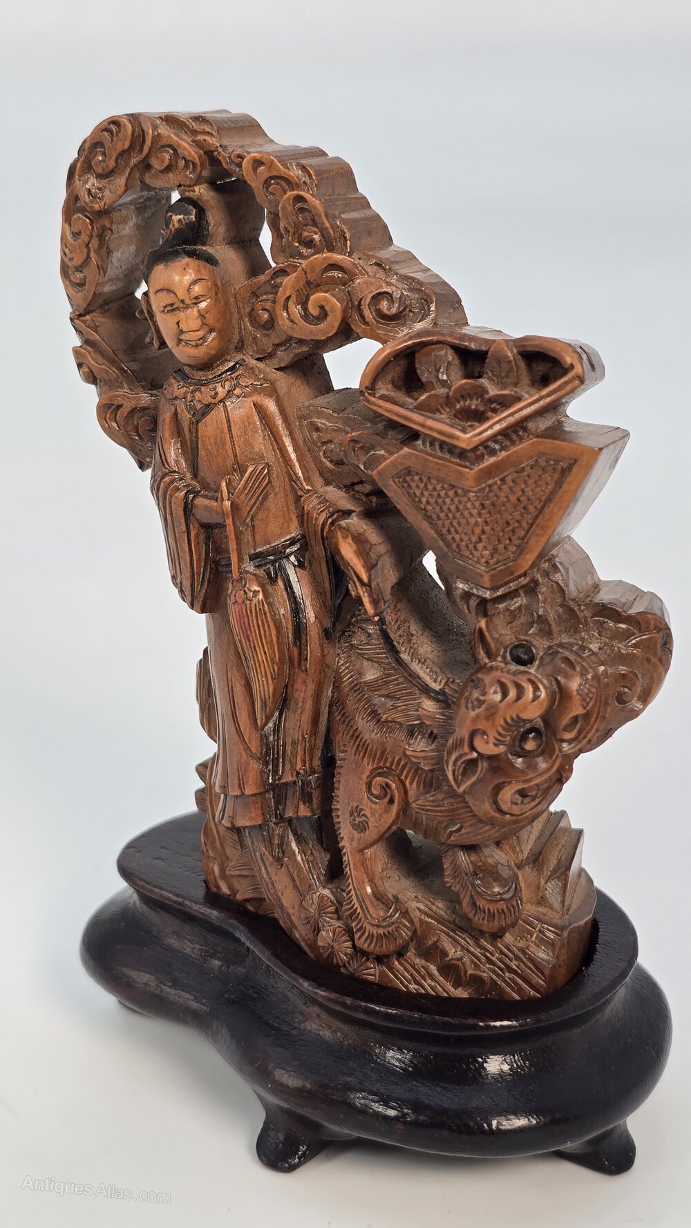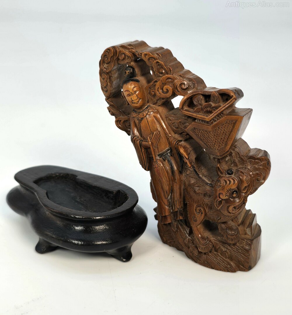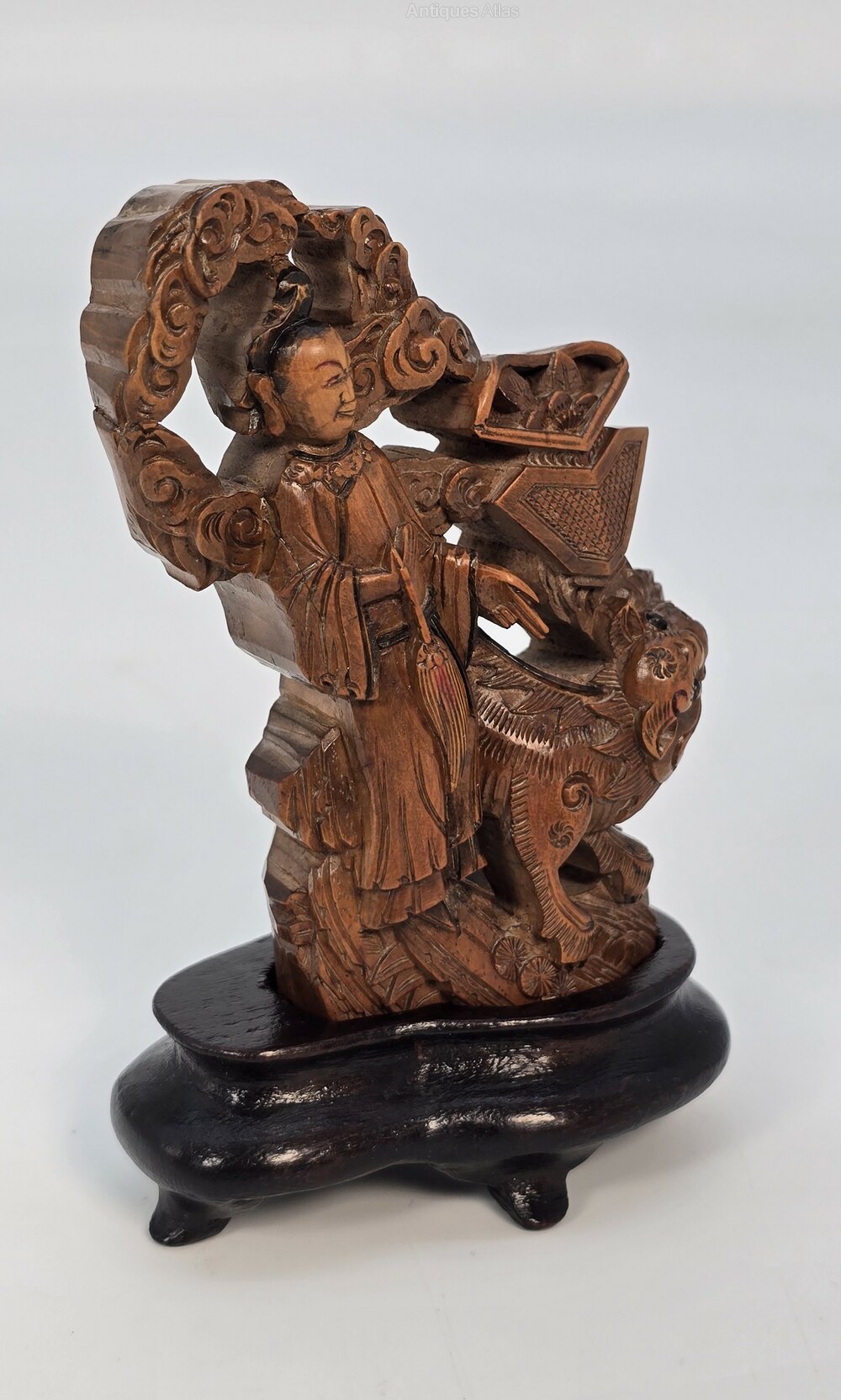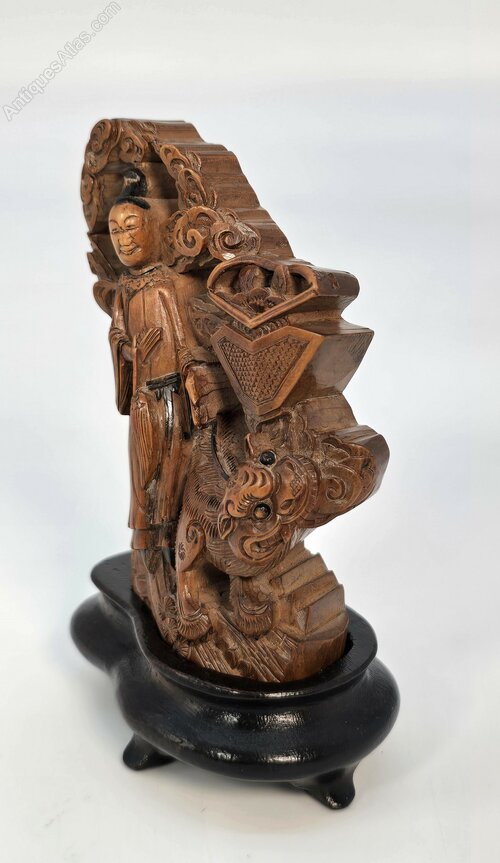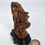 The figure is three dimensionally carved with good depth and fine detail. The edges and back are plain. The okimono comes with its original dark hardwood shaped and fitted stand, which is raised onto four out swept feet.
