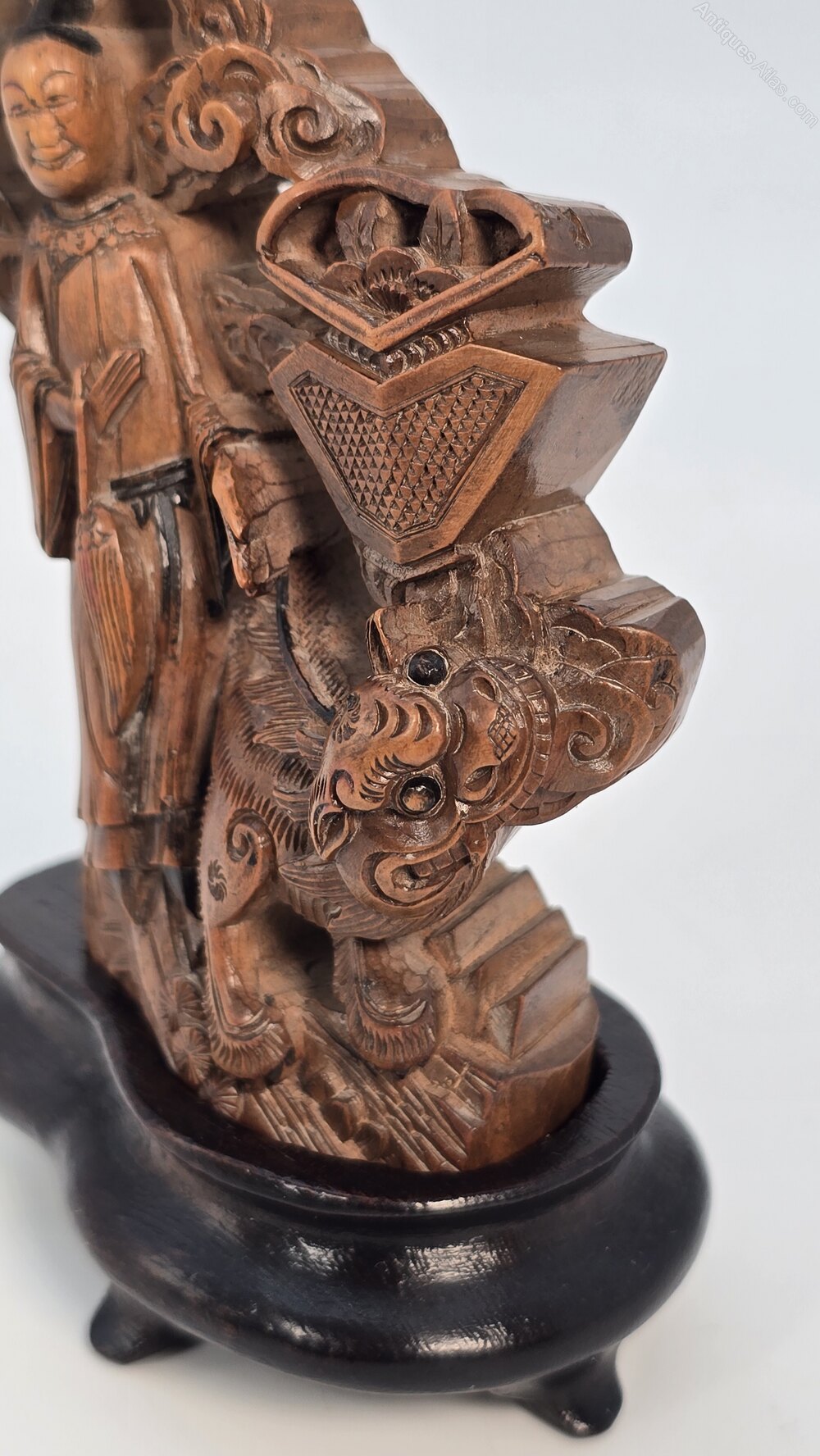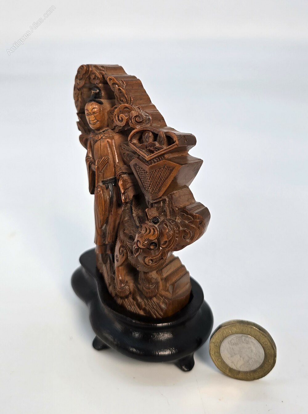 This highly detailed and very well carved late 19th century miniature bamboo okimono shows a figure group with a traditionally dressed man walking on a rocky landscape with a large mythical beast, and in the background, there is a decorative incense burner with trailing smoke.