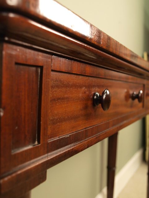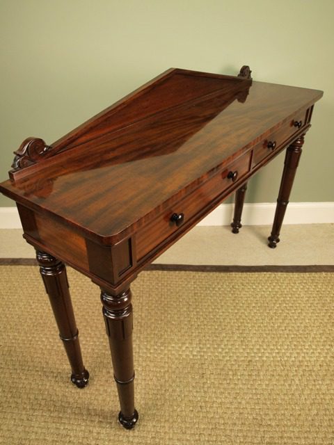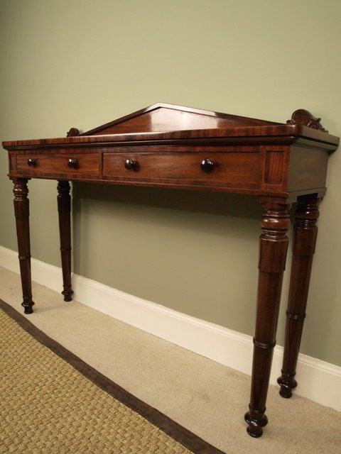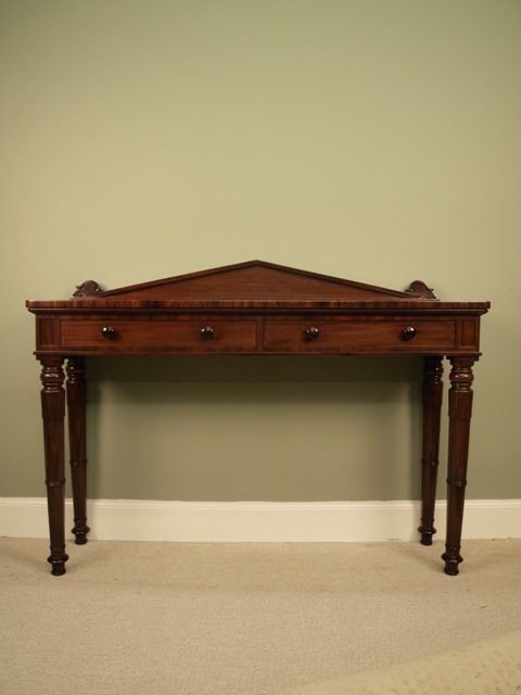A beautiful quality and well proportioned Mahogany Console Side Table, having two drawers retaing the orignal knob handles, The arched back rail with moulded edge with carved scrolled ends, the table raised on turned and carved legs. Superb condition throughout.