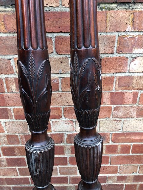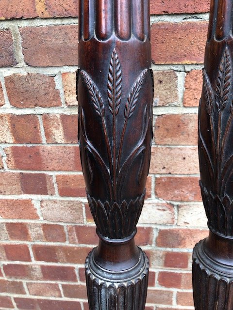 A pair of 18th century mahogany bed posts with fluted and wheat ear carving