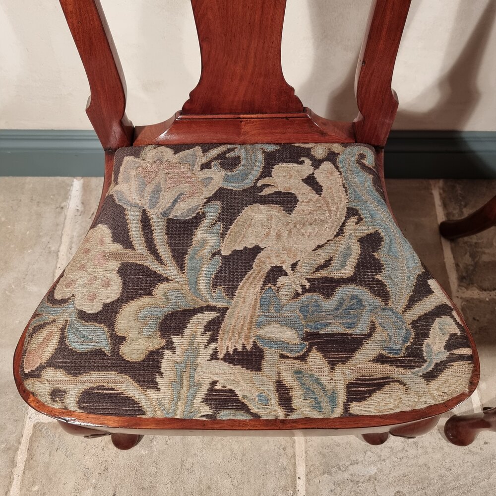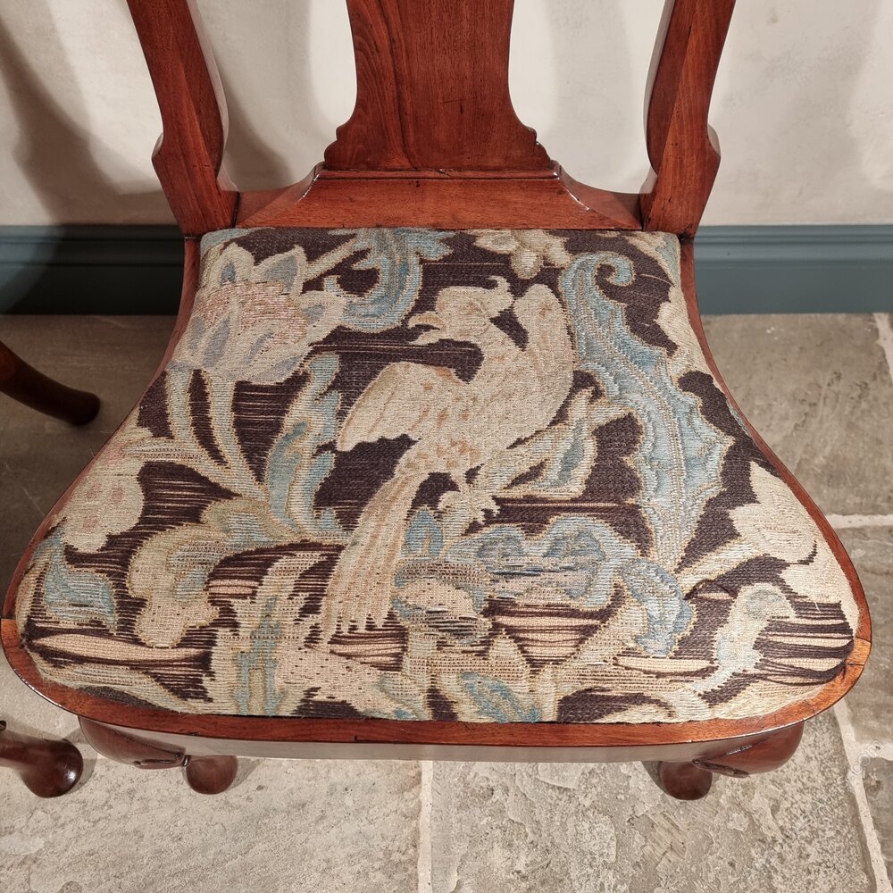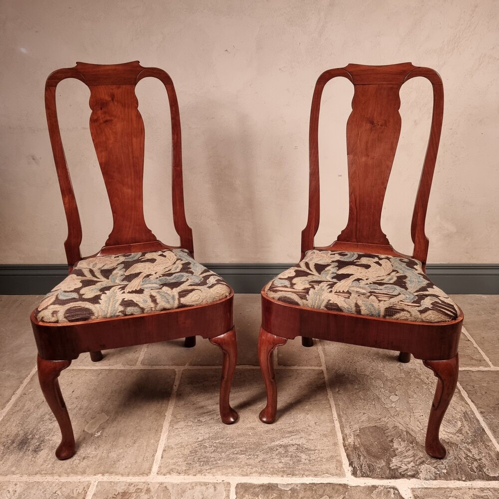 A fine pair of 18th century walnut chairs, both having a rich warm colour and lovely polished finish. The chairs have drop in needlework seats which both depict matching birds. The chairs are in good solid condition and have some restorations commensurate with age and ware losses to the needle work seats.