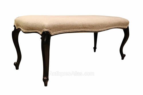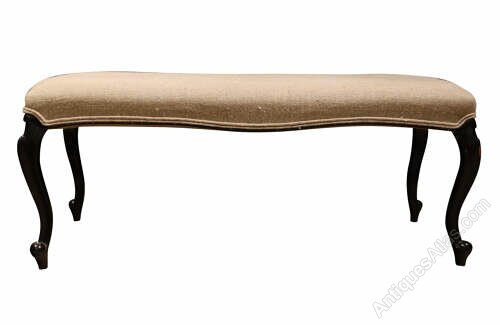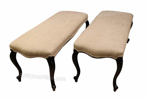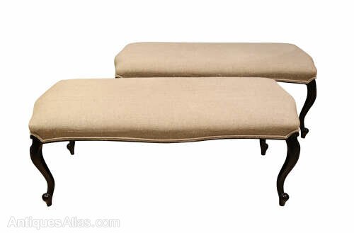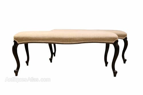 This elegant pair of late 19th century long stools display refined proportions and understated decorative appeal, making them both highly versatile and visually striking pieces. Each stool is raised on graceful ebonised cabriole legs, terminating in softly carved pad feet, the sinuous curves lending a lightness and elegance characteristic of the period.