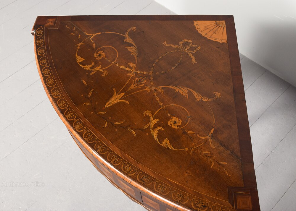 Circa 1770. A pair of mahogany, satinwood, fruitwood and marquetry corner (quadrant-shaped) in the manner of ‘Ince and Mayhew’. The bow-front tops with quarter fans, ribbon-tied husk, swags and foliate scrolls within the border above the friezes, concealed drawers, inside of each there is a trade label for ‘Frank Partridge, St James & New York’. The frieze with parquetry inlay, and a wavy inlaid apron, raised on inlaid square tapering legs terminating with brass castors and ball feet.