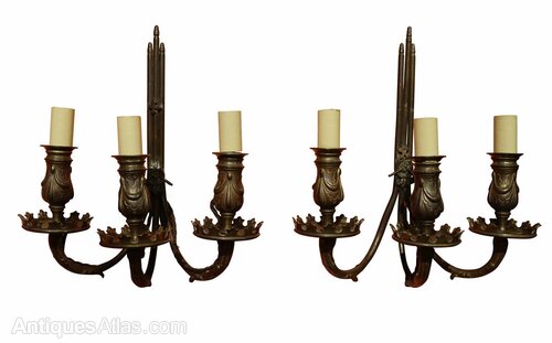 A Pair of Patinated Brass Three-Branch Wall Sconce