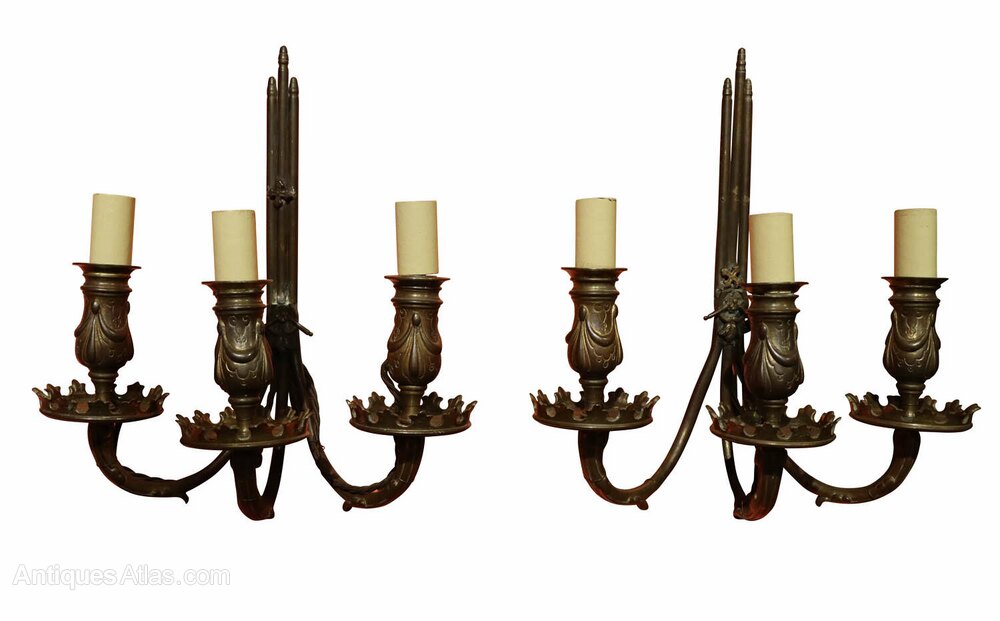 A decorative pair of patinated brass three-branch wall sconces, dating from around circa 1900. Each sconce features a central upright stem with three scrolling arms, terminating in shaped candle nozzles above decorative drip pans with pierced detailing.