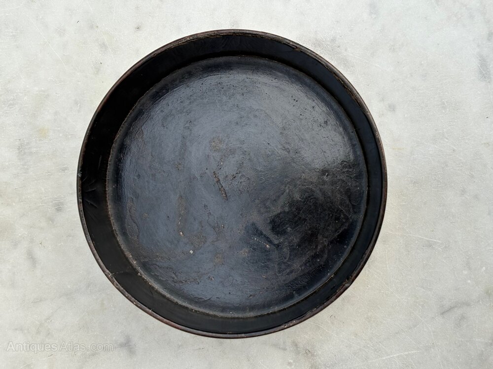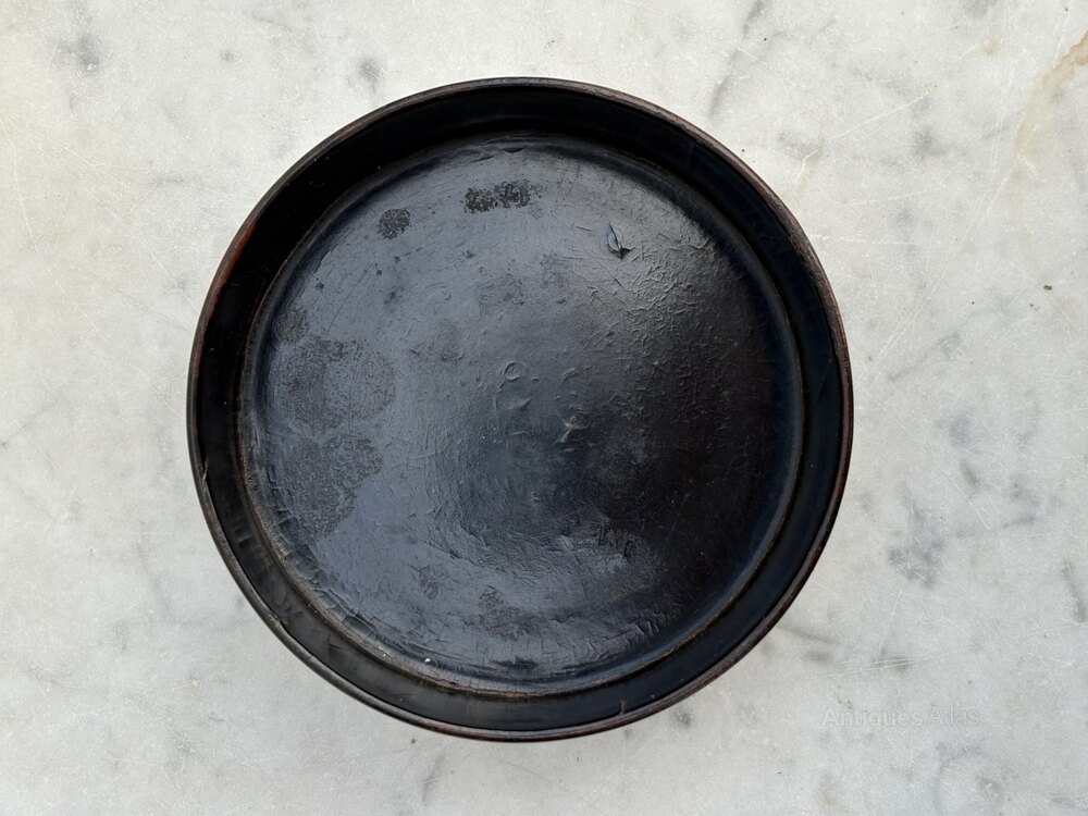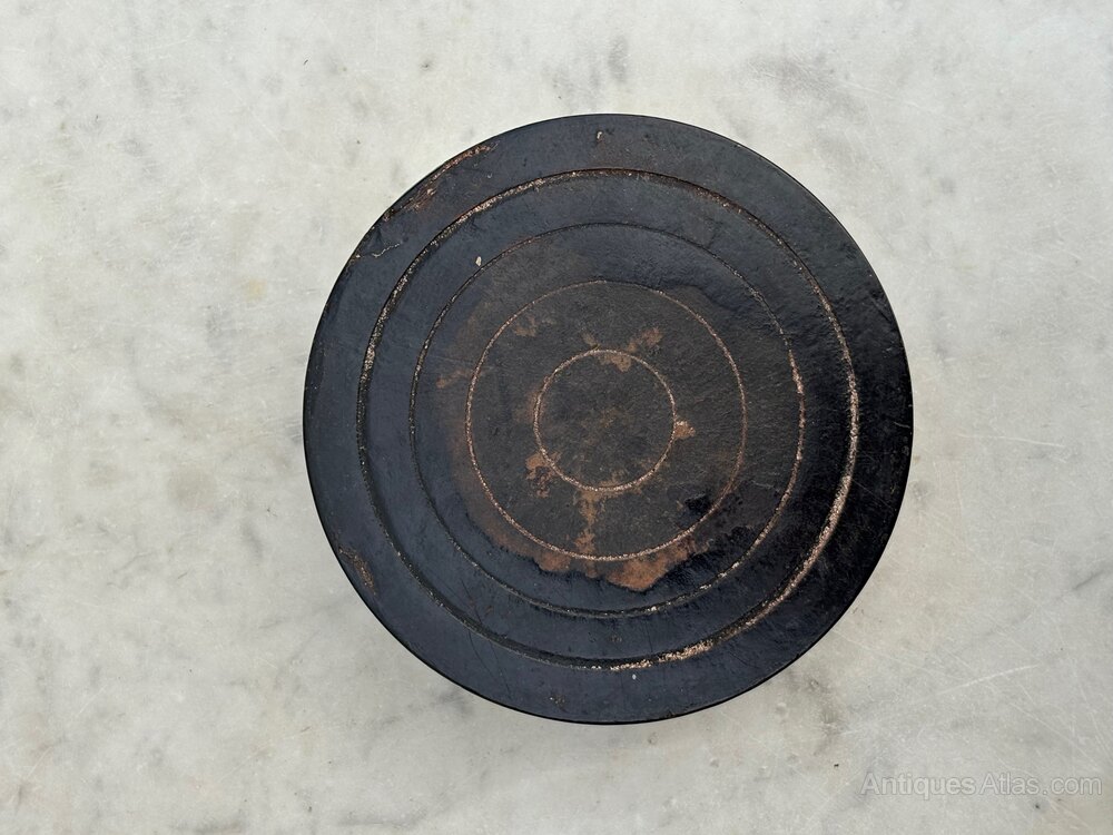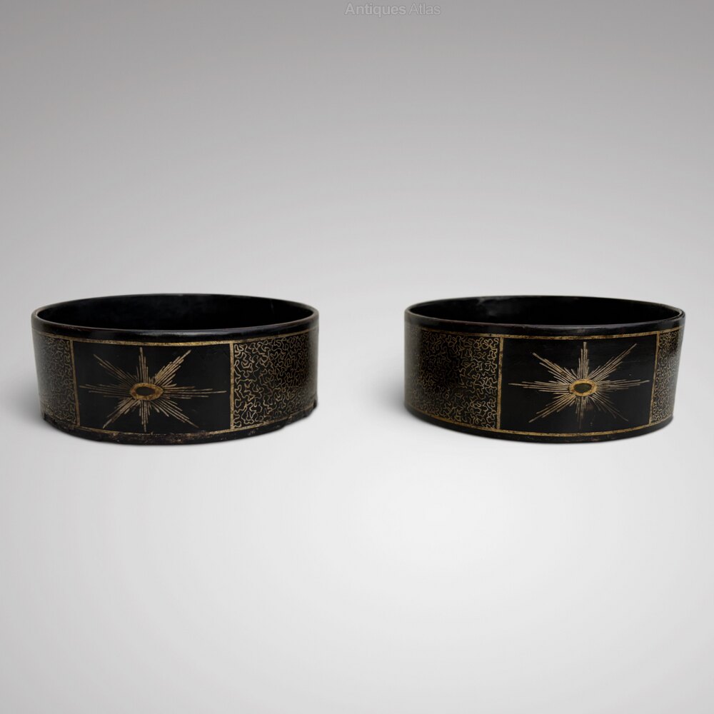 A pair of papier mache bottle or decanter coasters dating from the Regency period. This pair of antique coasters is decorated with alternating sunburst and scrolling panels. There is a little wear, this is compatible to over 200 years of use but it does not detract from the appeal.