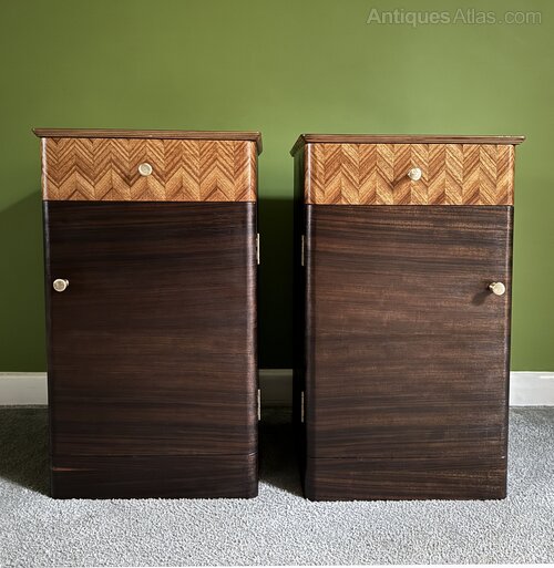 A pair of mid century bedside cabinets / nightstands made by Uniflex. Dating from the 1950s or 60s, these walnut cabinets have a beautiful, contrasting golden finish on the drawer fronts, with the woodgrain laid to create a chevron pattern. This pattern, along with the elegant curved edges to the drawers and doors, give the cabinets an Art Deco feel. The original knobs are solid brass, as are the hinges. Inside are fixed internal shelves.