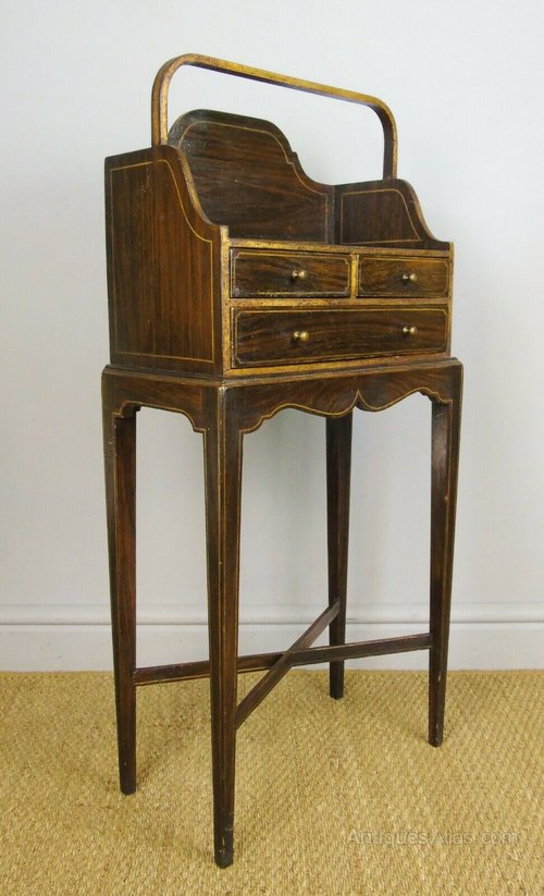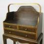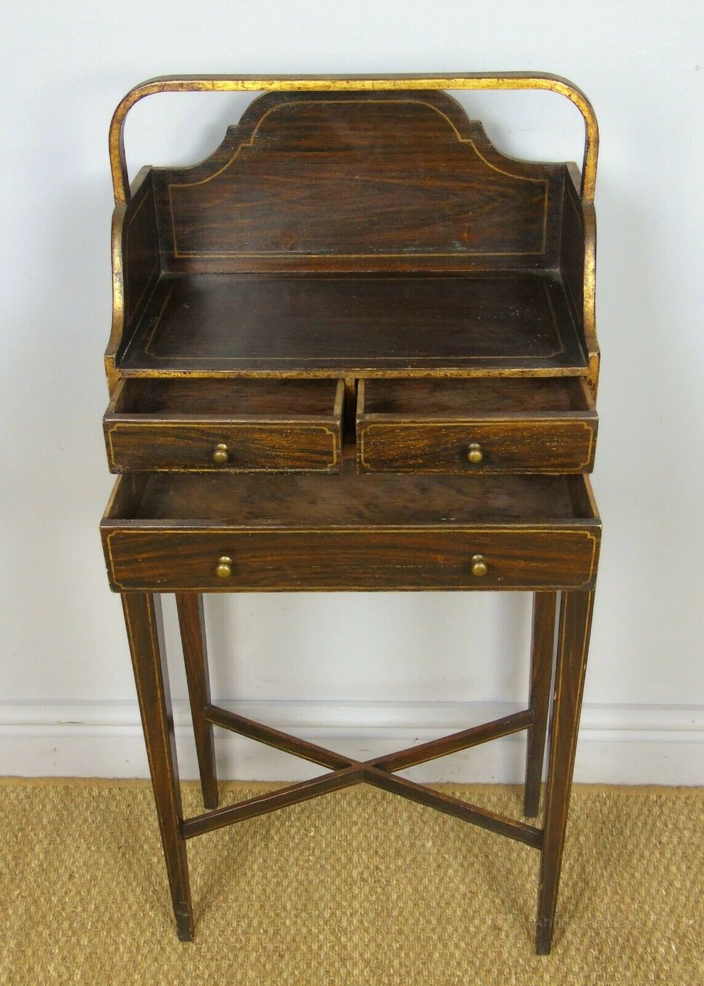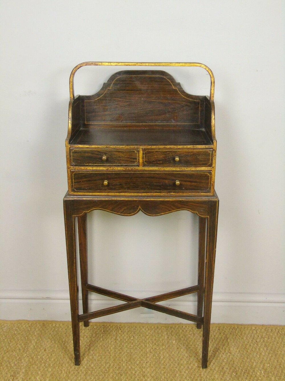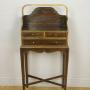 This is a delightful Chevret table with hand painted and gilded finish in the Regency Style dating from around 1900. The table is of typical form with elegant neat proportions and slender tapering legs. There is a curved carrying handle to the top above the writing surface with gallery back. The three drawers have their original bronze handles and the piece has a shaped frieze to the base above an X frame understretcher. The table is in very good original condition and measures 92 cms high 43 cms wide by 23 cms deep.
