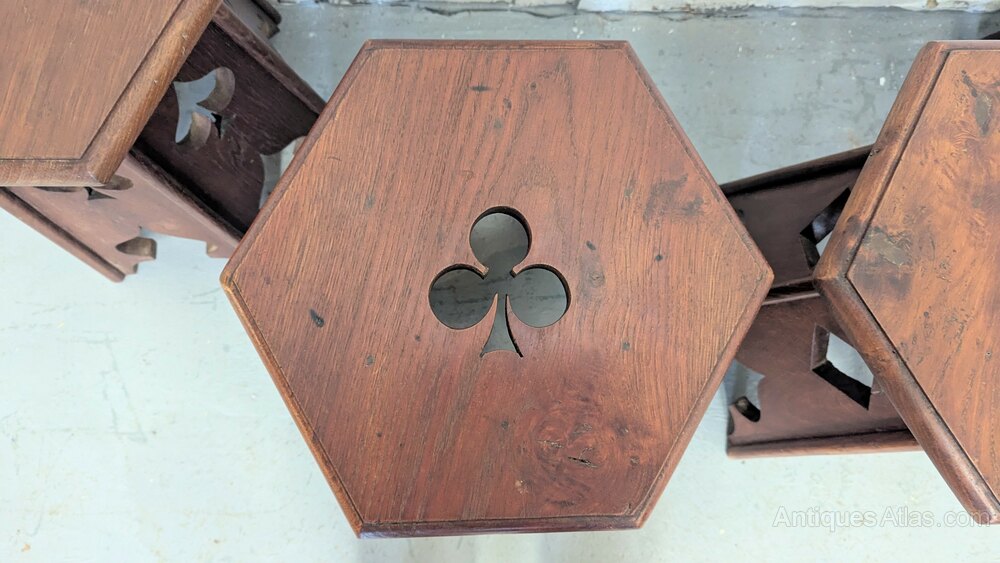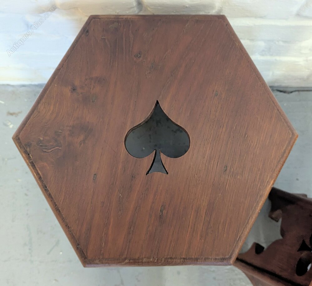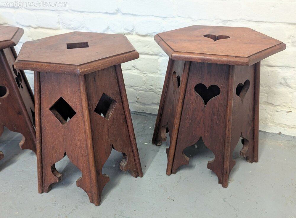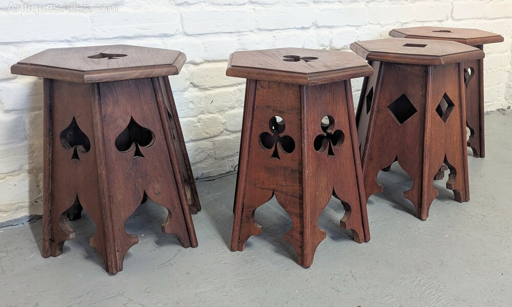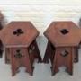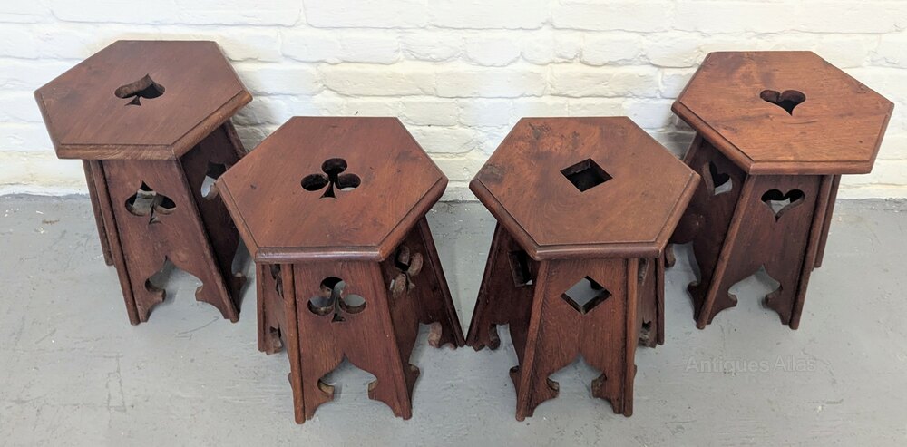 A set of four rare oak Arts and Crafts occasional or side antique tables each with different card suit cutouts in used marked condition measuring 33 cm x 39 x 46.