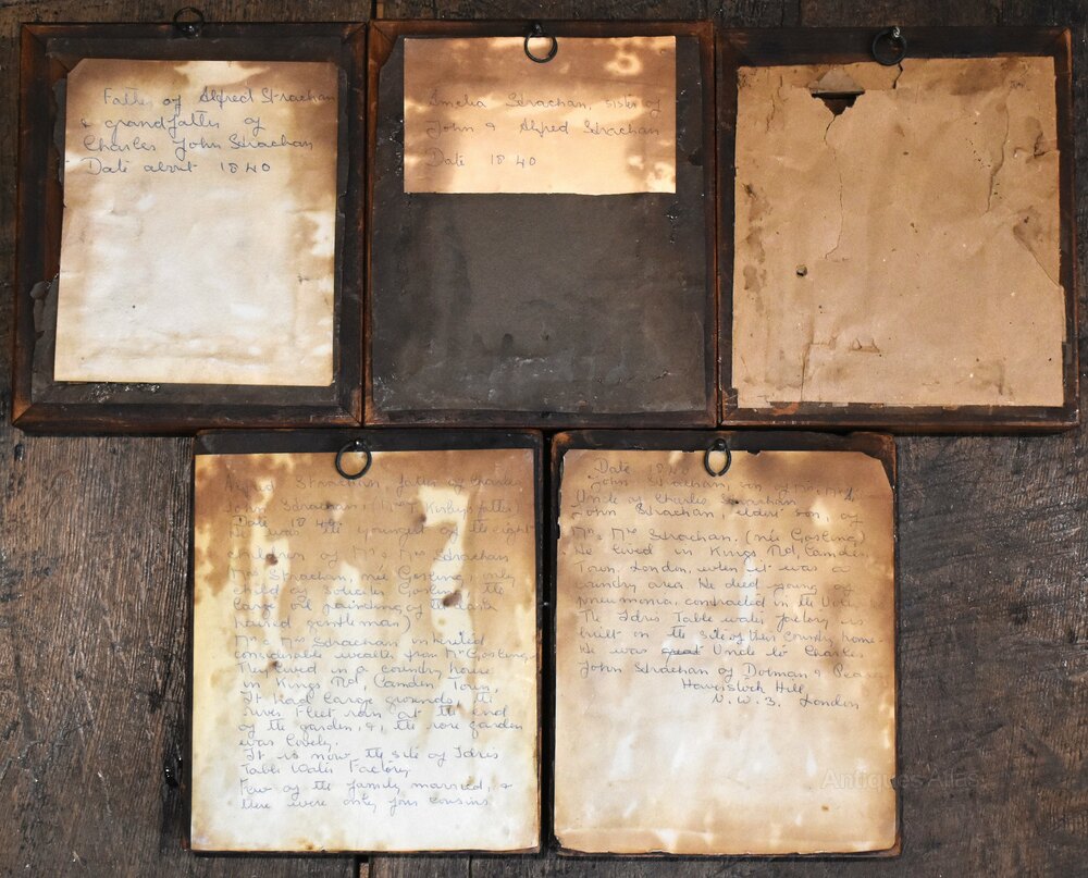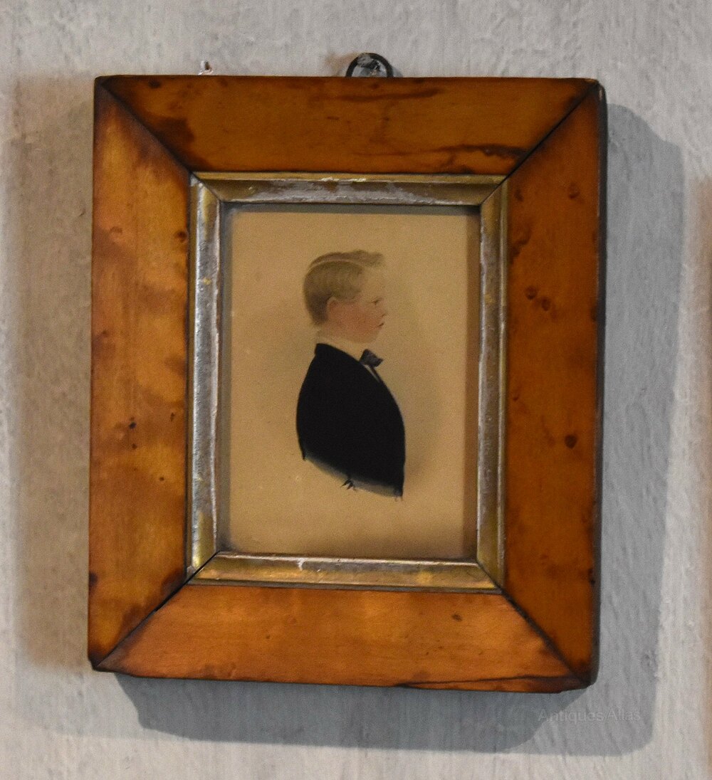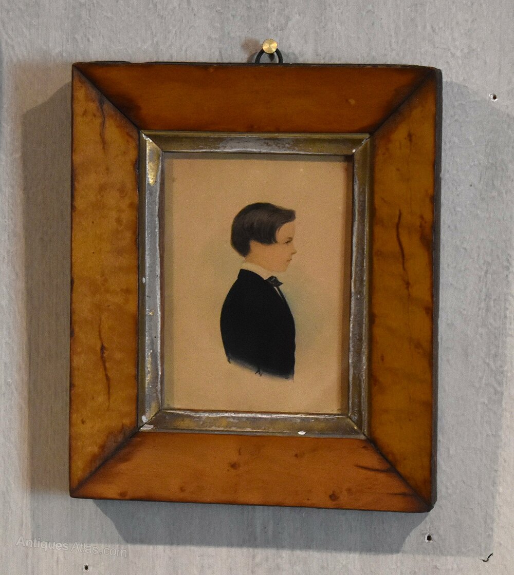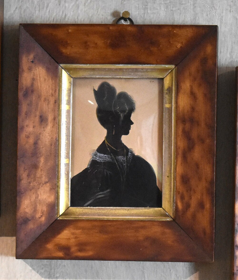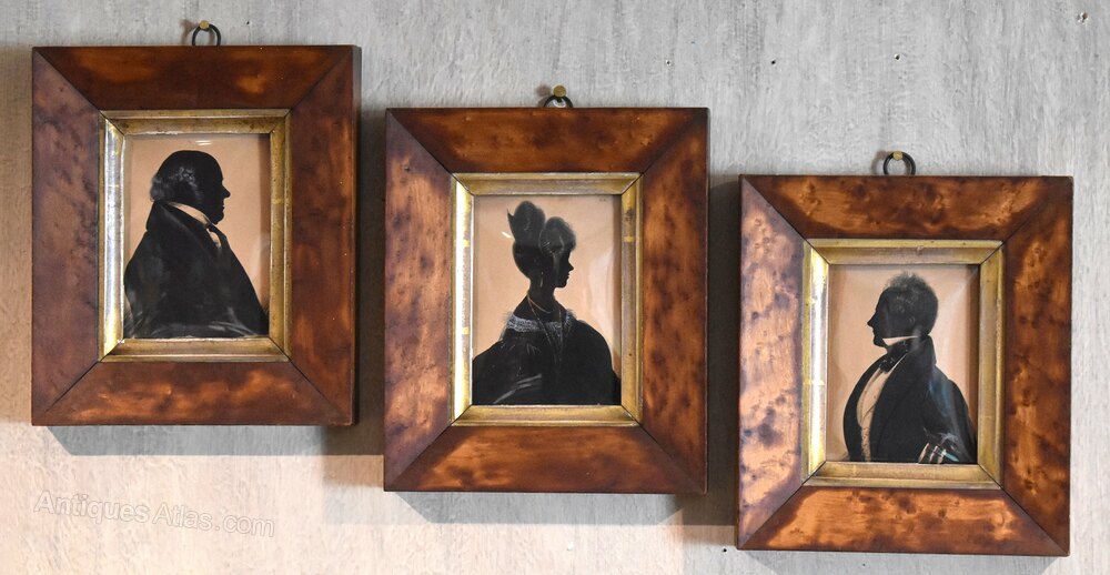 A very unusual group of five silhouettes all of the Strachan family and dating to the 1840’s. Three of the silhouettes are painted in black highlighted with white and gold. The two silhouettes of children are completely and beautifully coloured. The group are all by the Hubard Gallery a famous and illustrious provider of silhouettes in the early nineteenth century. The whole set are in excellent condition and in the original bird’s eye maple frames, the three black silhouettes also have the original convex glass. The reverse of the silhouettes also retain a large amount of information regarding the Strachan family of London. It is exceptionally unusual for such a fine quality group of family silhouettes to remain together and as a group they have a huge amount of decorative impact.