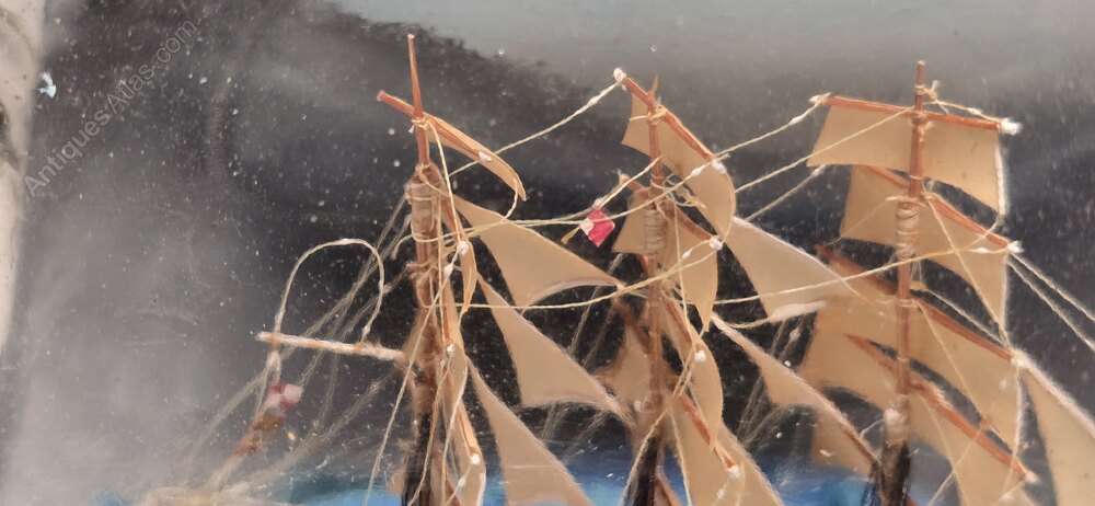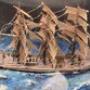 The diorama displays the ship running at speed through choppy seas with a full display of sails capturing a powerful wind.
