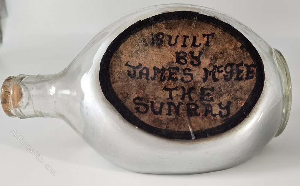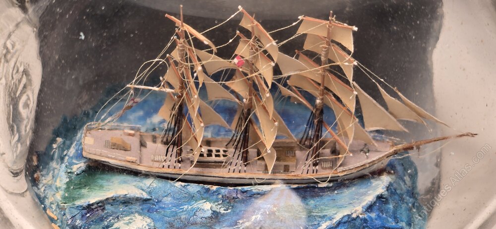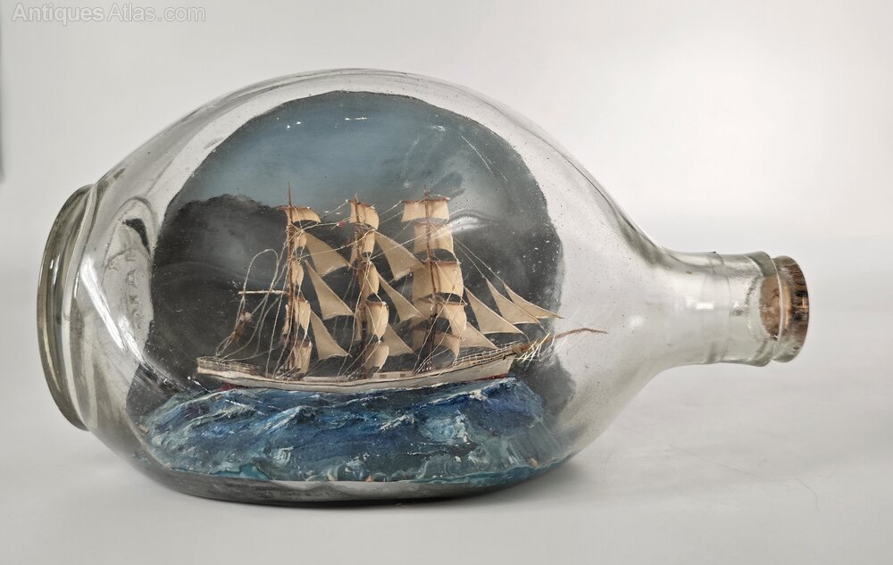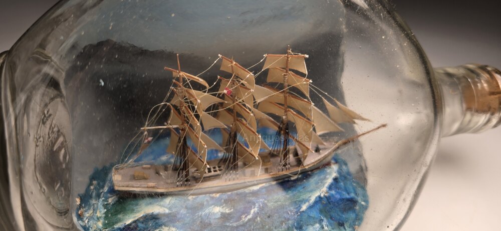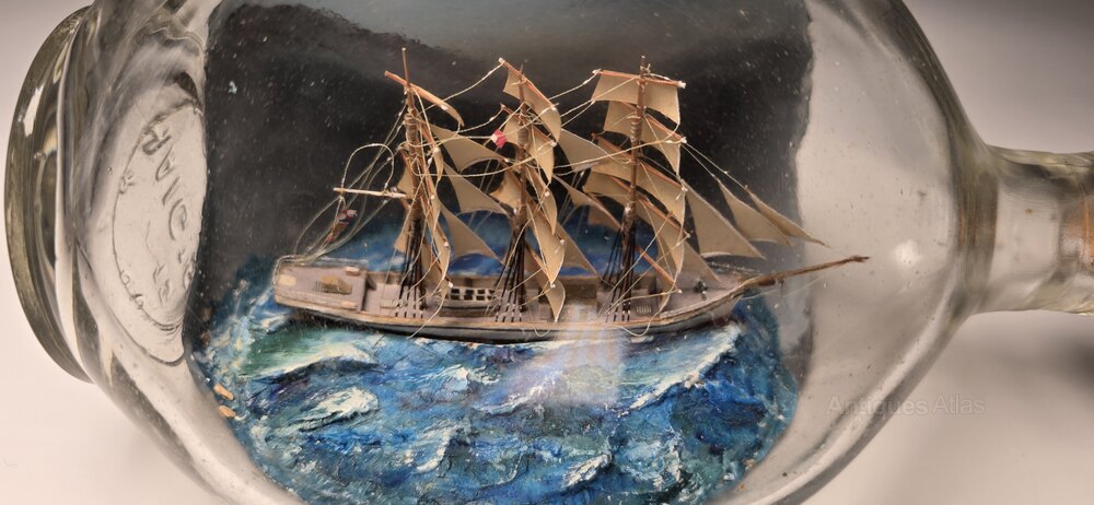This exceptional ship in a bottle is a three mast sailing ship is set in a seascape diorama. It has been built in a pinched (indentation) Scottish whiskey bottle, and it is remarkably well detailed.