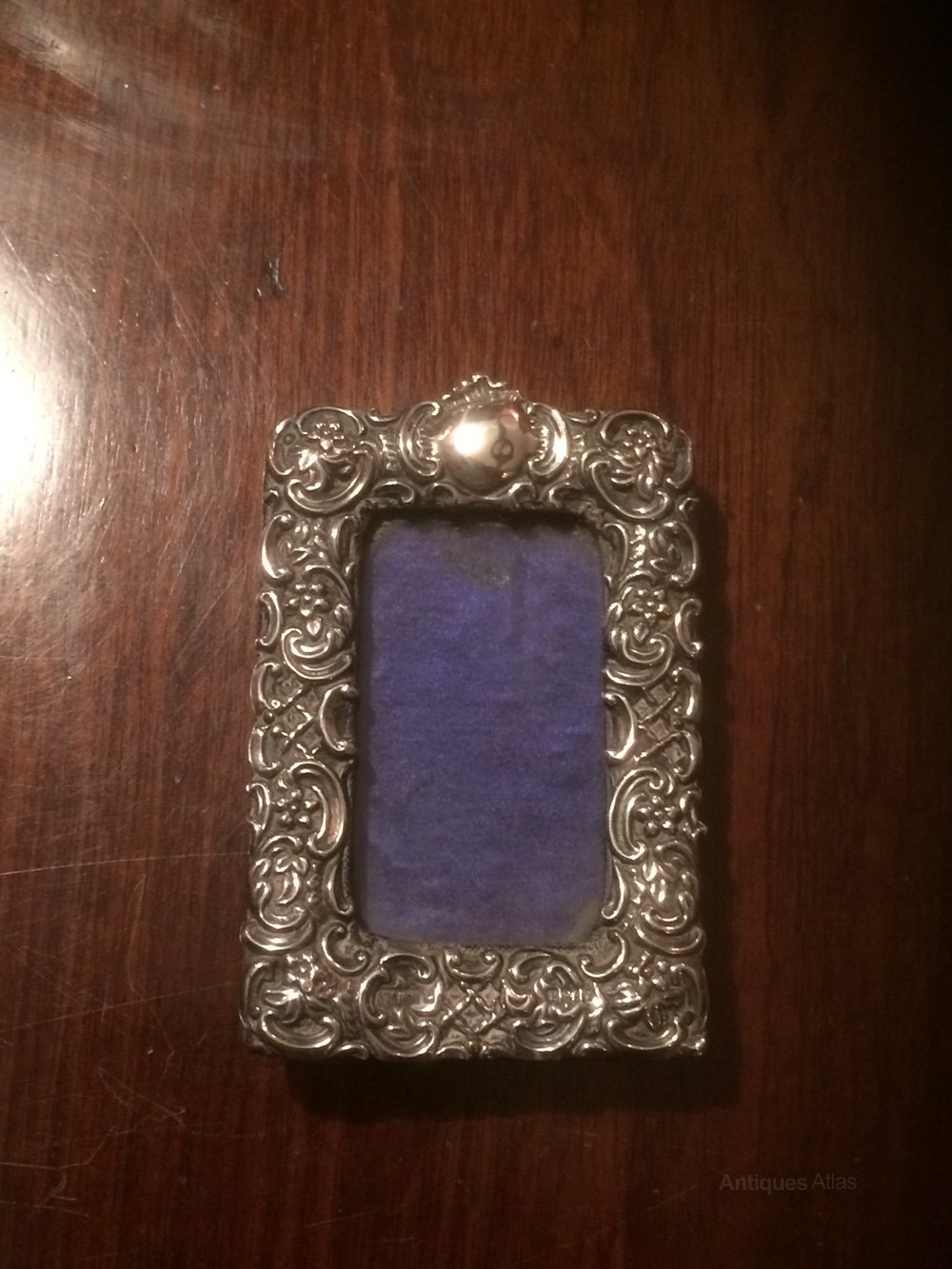 A pretty ornate silver frame hallmarked for Birmingham 1900,it measures 2.5 ins x 3.25 ins on the outside taking a photo 2.25 ins x 1.5ins.In very good condition with original glass and velvet to the reverse.