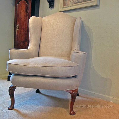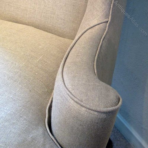 This chair is now refurbished and re-upholsterd in a natural linen, with the additonal feature of shaped piping to the leading edges.