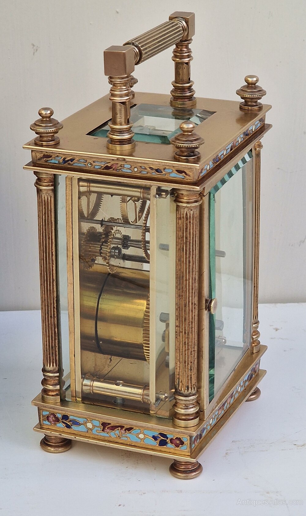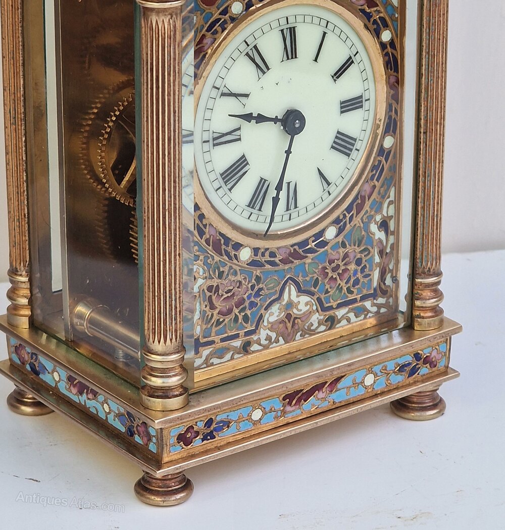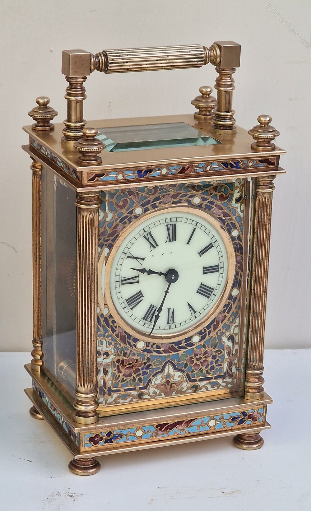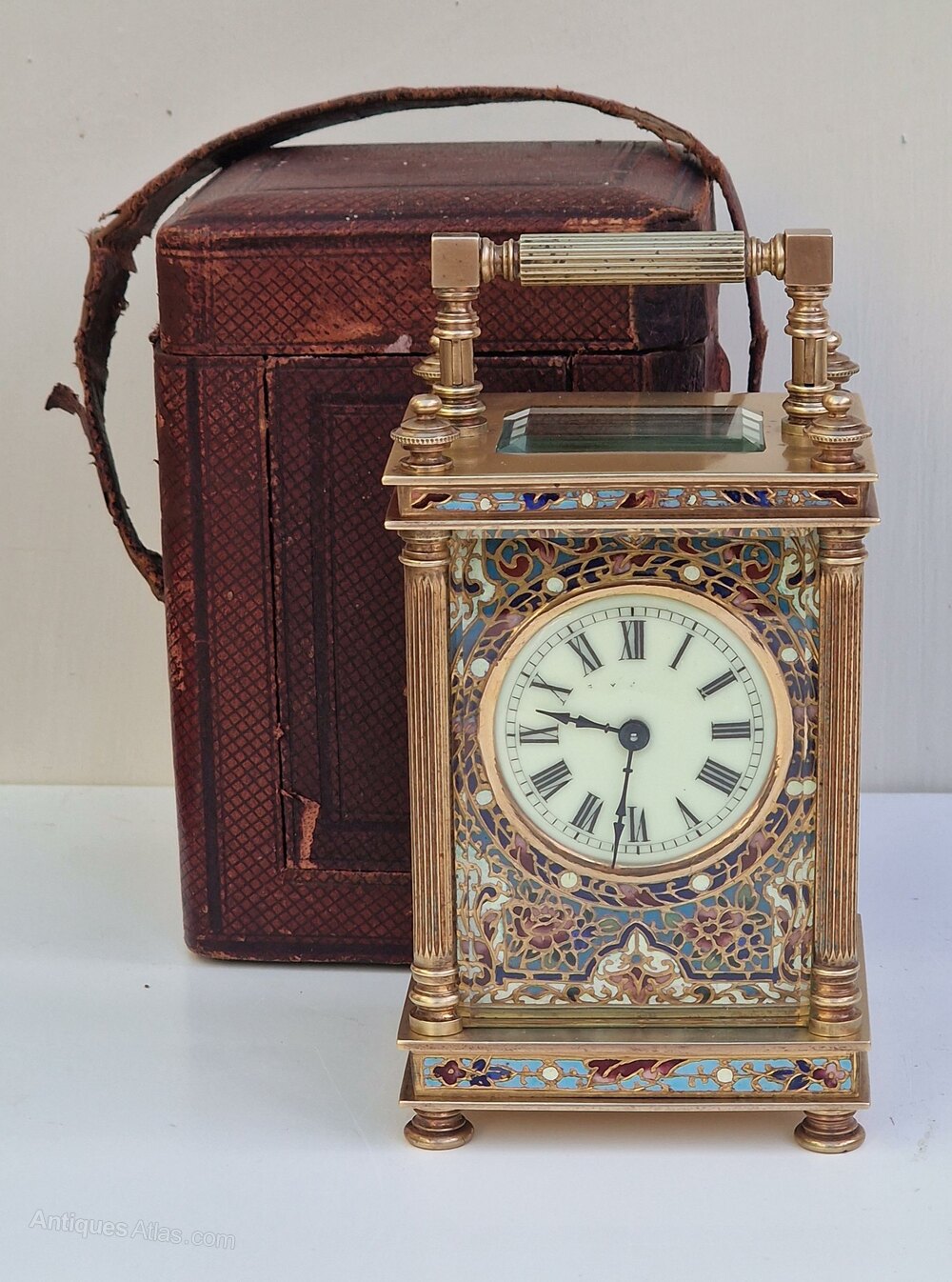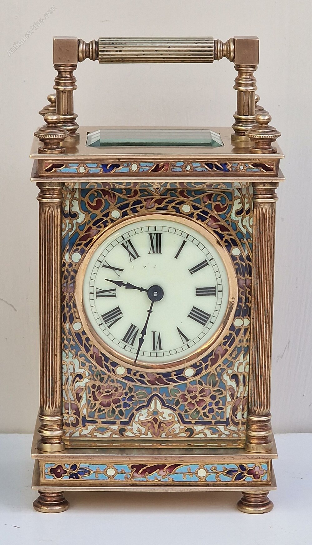 A superb French Champleve enamel carriage clock. A fluted carrying handle, side columns and standing on bun feet. An circular enamel dial with blued steel hands and black Roman numerals. Fine enamel work surrounding the dial and to the case top and base. An 8-day duration mechanism. An escapement visible through the oblong, bevelled top glass. The original travelling box. Circa 1900.