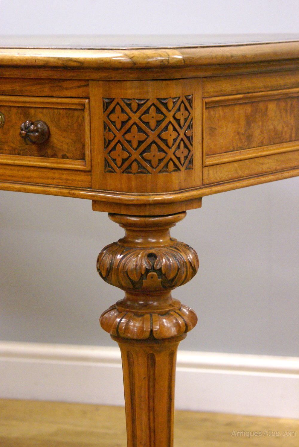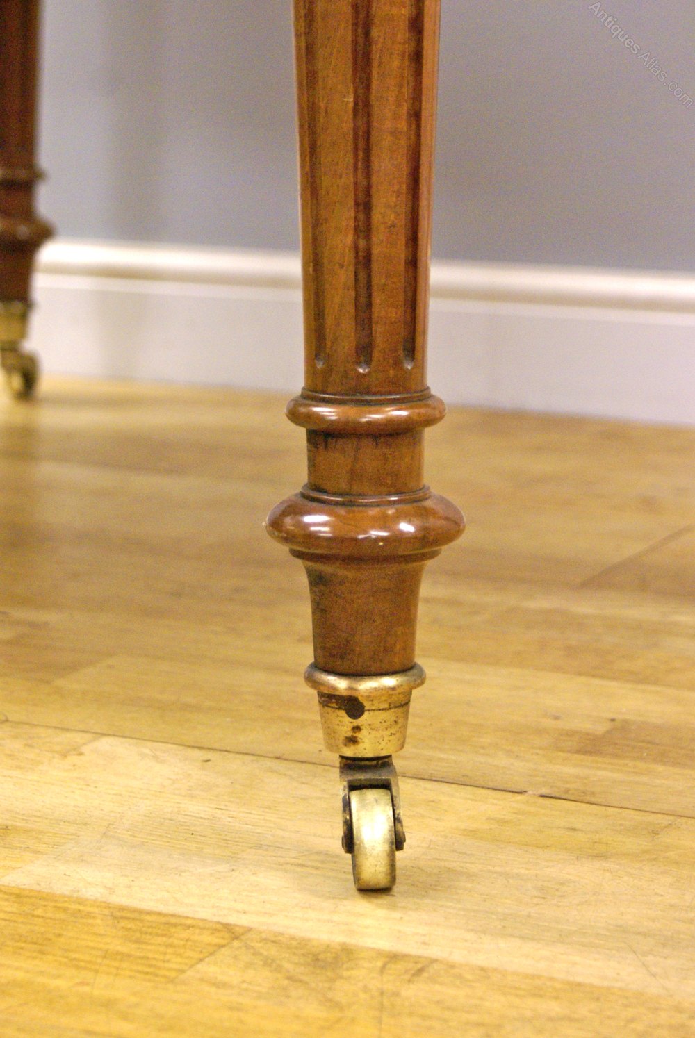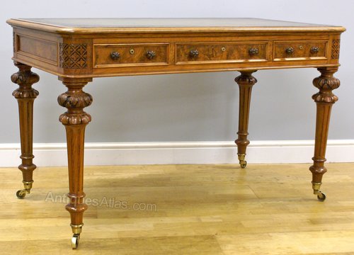 Standing on fluted and carved legs with original brass castors and with 3 mahogany lined drawers which retain their original carved wooden knobs and Bramah locks. The table is finished all the way around with the reverse side having dummy drawers making this a "stand alone piece". The top has a molded edge, burl walnut cross banding and a leather inset writing surface. In very good and original condition and of outstanding quality.
