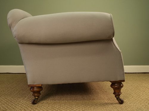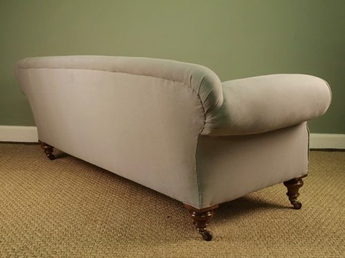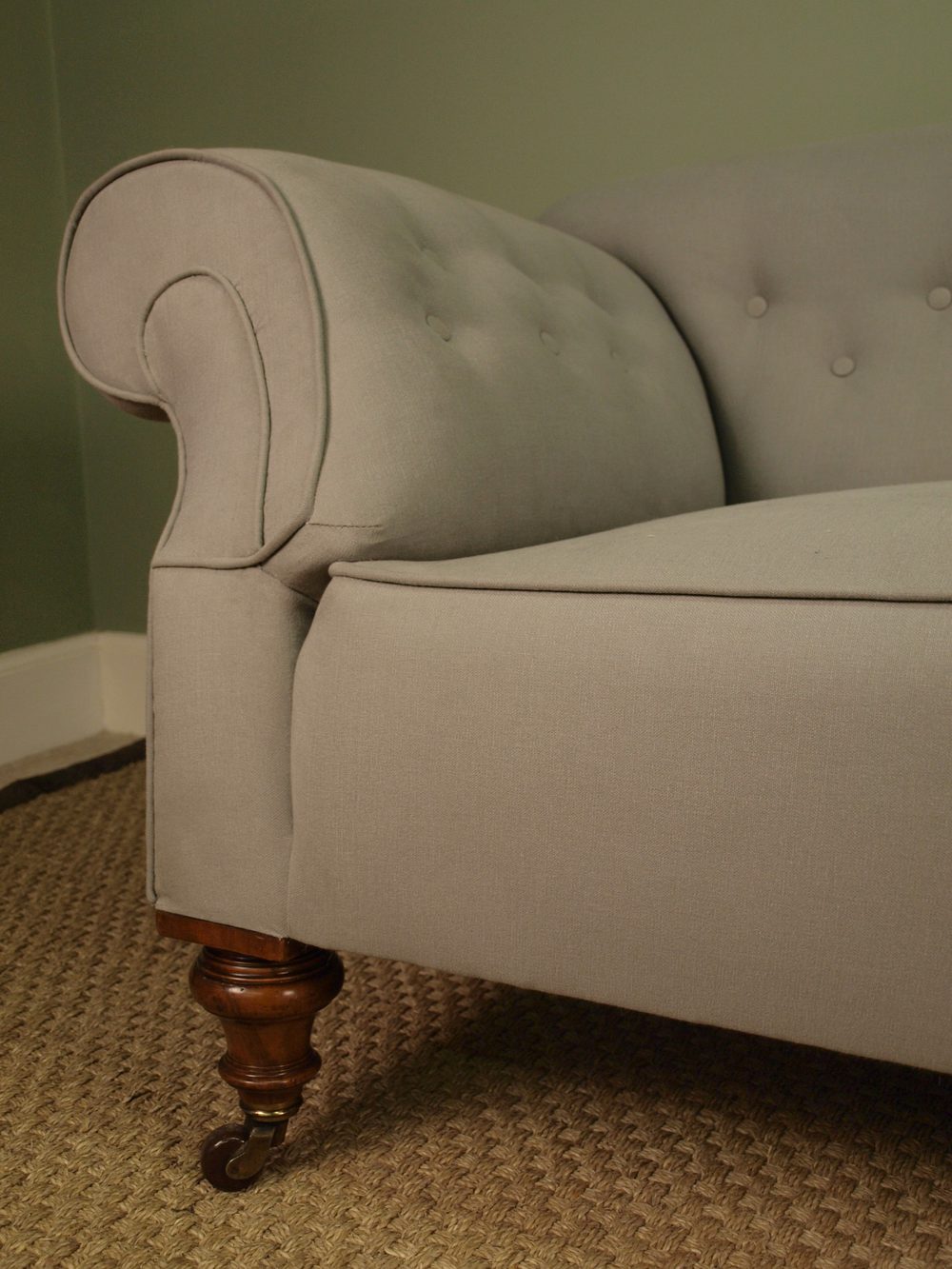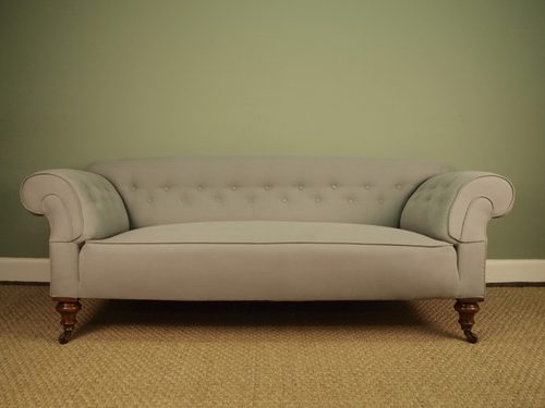 A superb high quality Victorian Chesterfield Sofa raised on beautiful walnut turned legs legs to both front and back all of which retain the original brass and porcelain castors. The deep seat is sprung and is shallow buttoned to the back and sides. Retains the original horse hair stuffing. Recoved in a dove Grey brushed cotton. This sofa is made to the highest standard, has excellent proportions and very comfortable when seated. This sofa has one of the best quality internal frames we have ever seen.