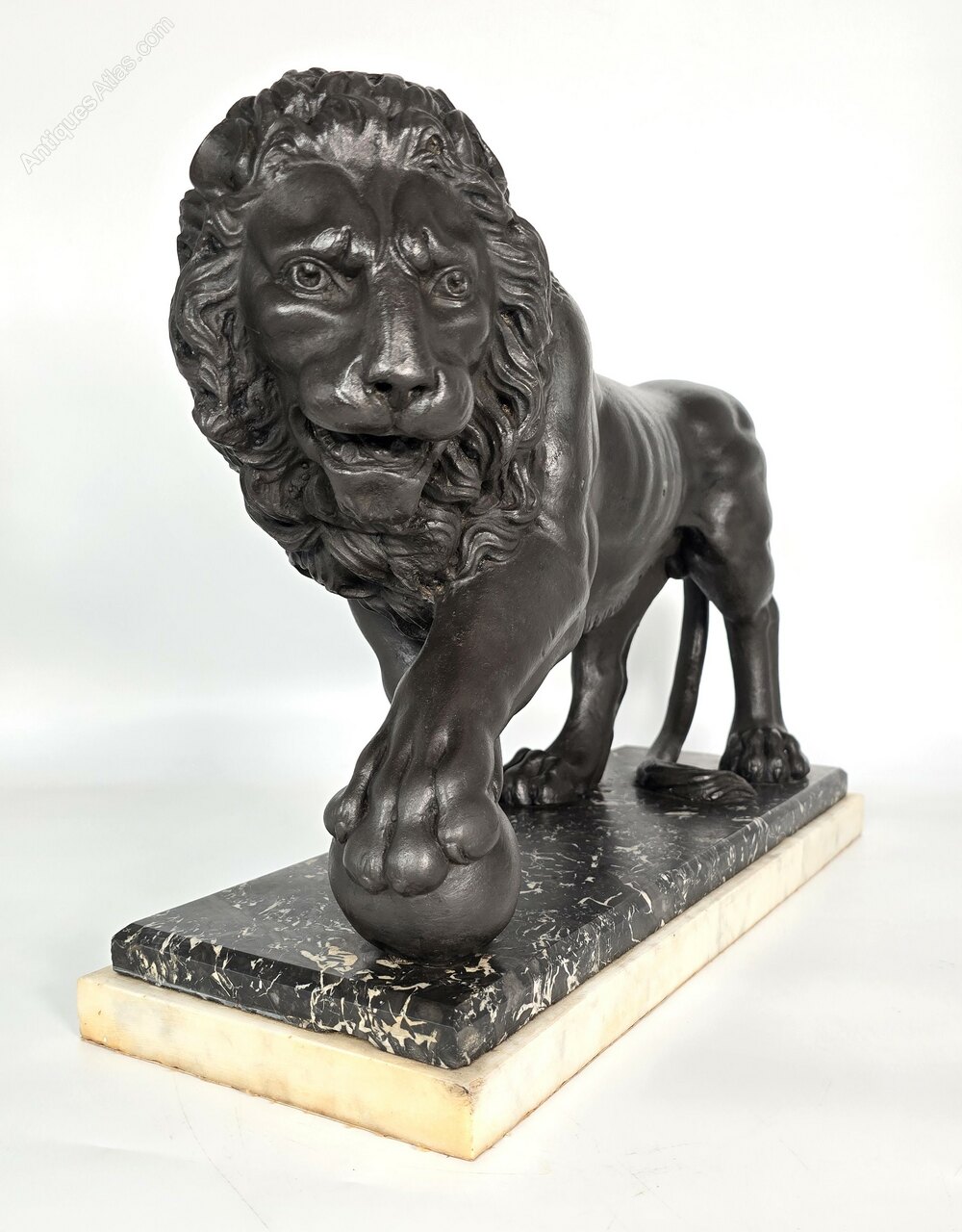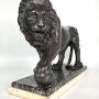 The lion is securely mounted onto a stepped white and black well figured marble plinth.