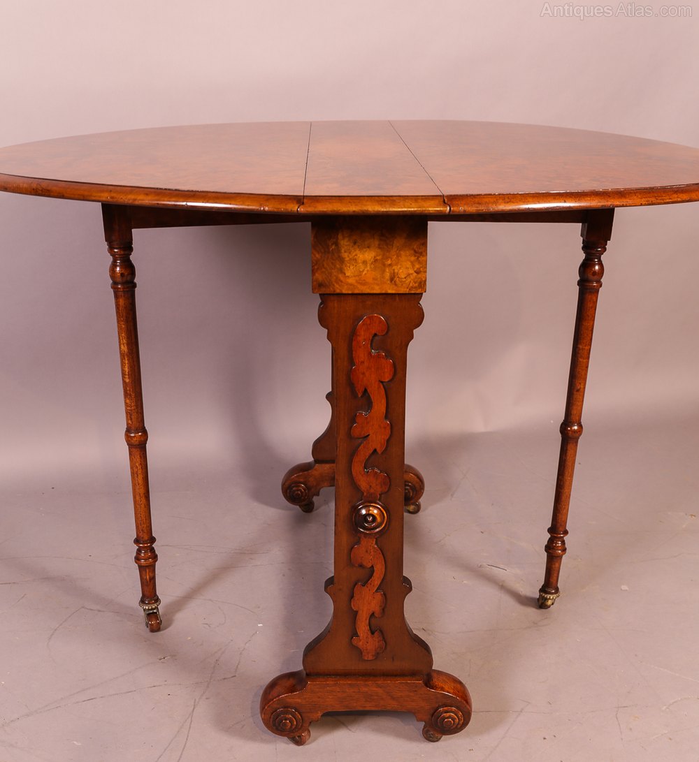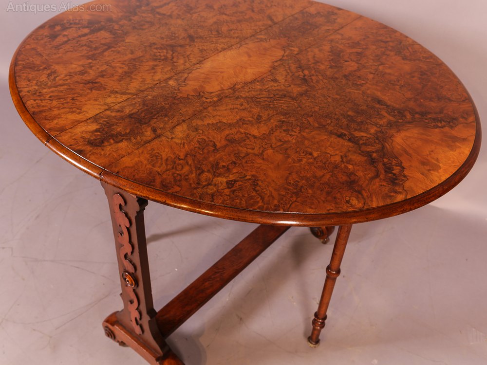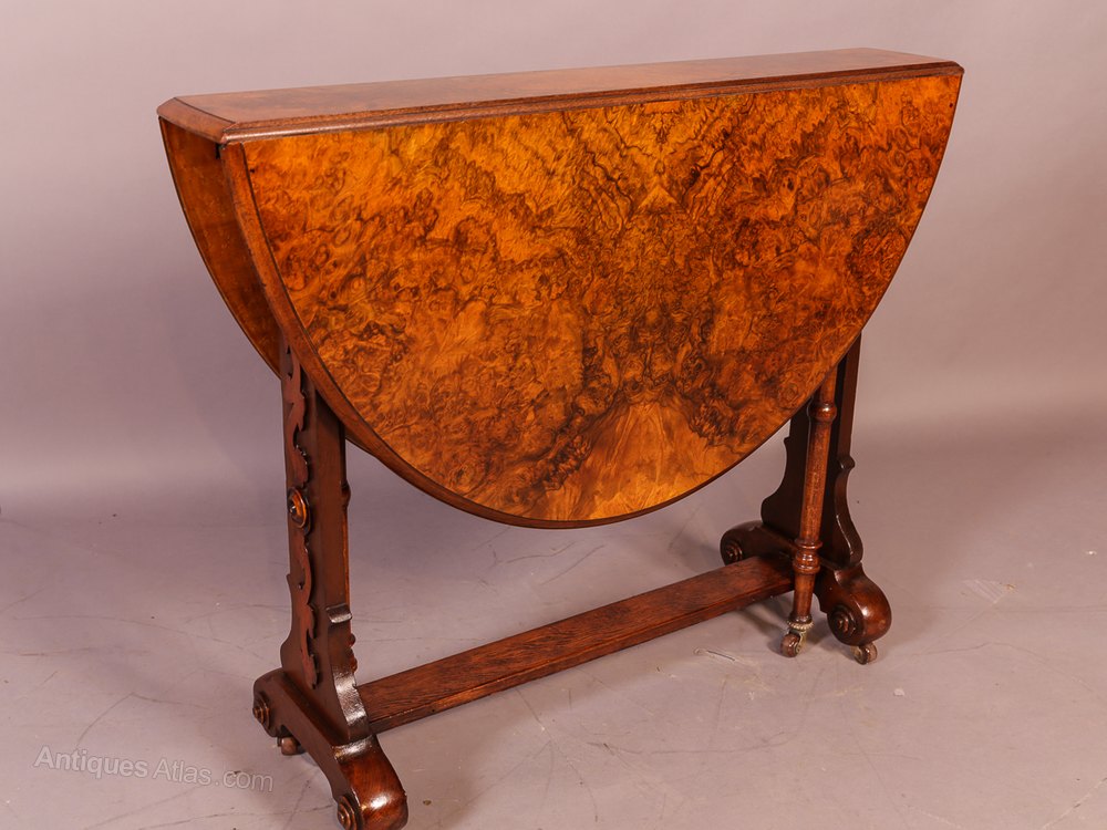 A Good Victorian Sutherland table the top is fabulus Burr Walnut, it has two legs that swing out to support the top when needed otherwise it can remain a drop leaf table, the legs have small castors. The condition is excellent with a lovely finish to the polish.