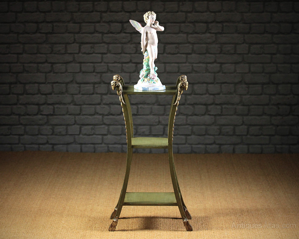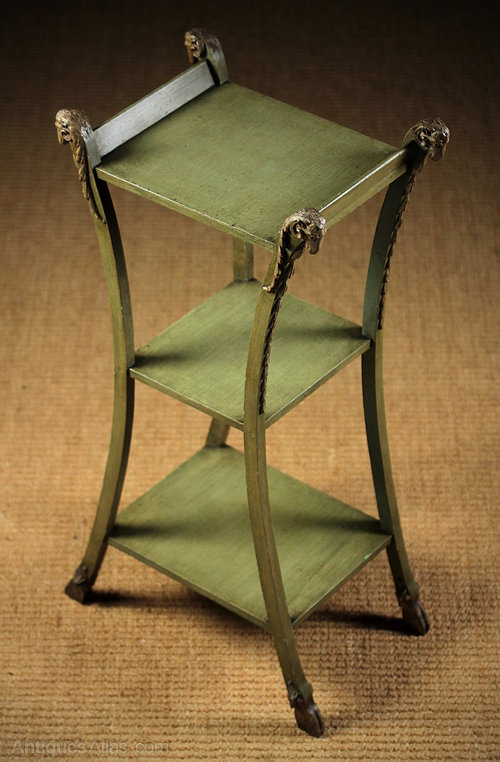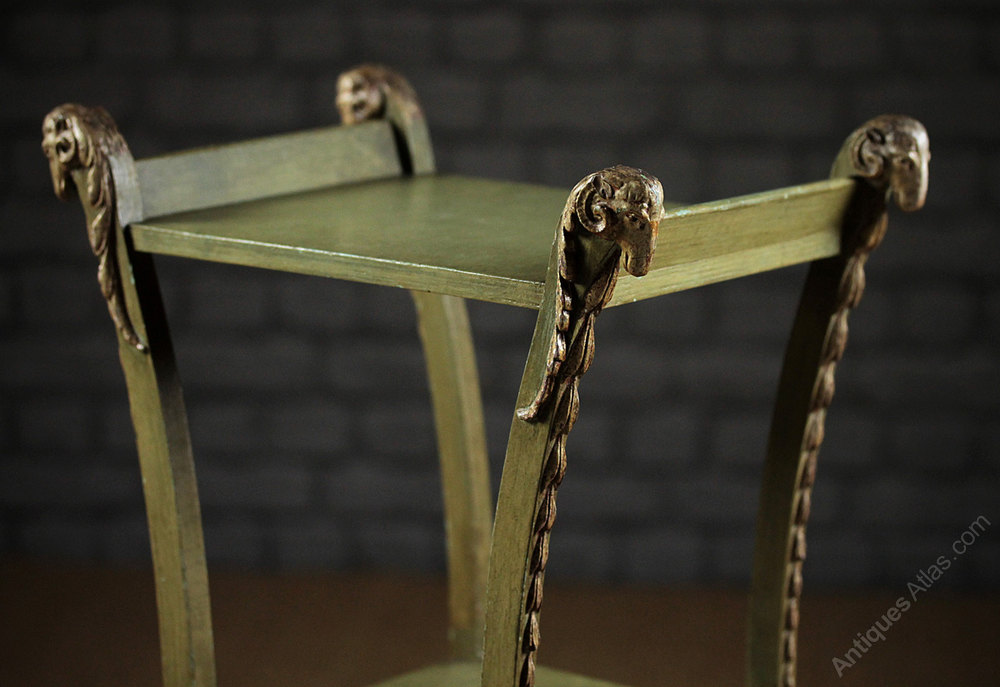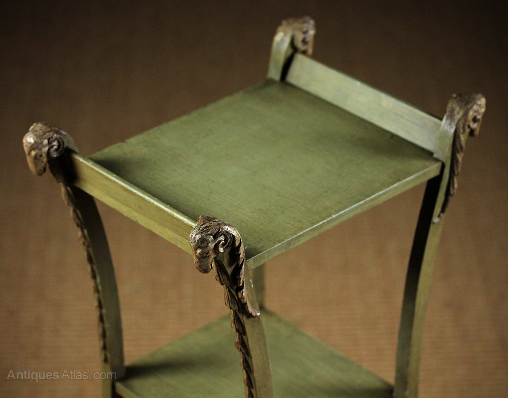 Very unusual little early 20th.c. pale green painted three tier stand or side table c.1930. In the manner of Robert Adam with bow shaped staves topped with gilded rams heads, and terminating in a neat little hoof foot. Excellent condition with original paint finish.