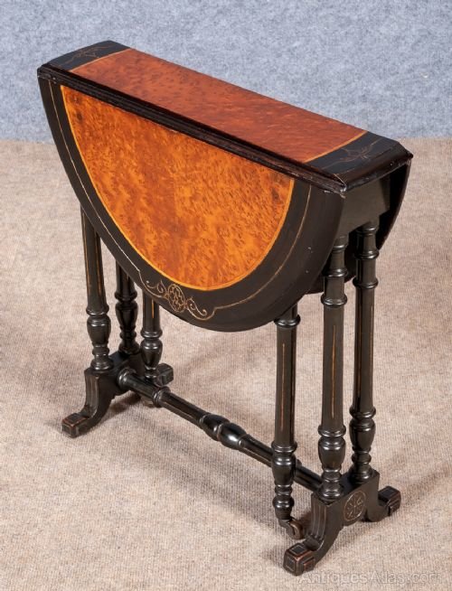 An unusual Aesthetic baby sutherland occasional table. The drop leaf top with purple heart veneer within boxwood stringing and an ebonised boarder with carved and gilded decoration. The ebonised base with gate leg action, gilded highlights and brass and porcelain casters. The whole in very good condition. Dimensions:- Height… 22’/ 56cm. Open Width…21.5’’/ 55cm. Depth…22’’/ 56cm. Closed Depth at Base…8’’/ 20cm. Delivery to most of U.K. mainland £35.