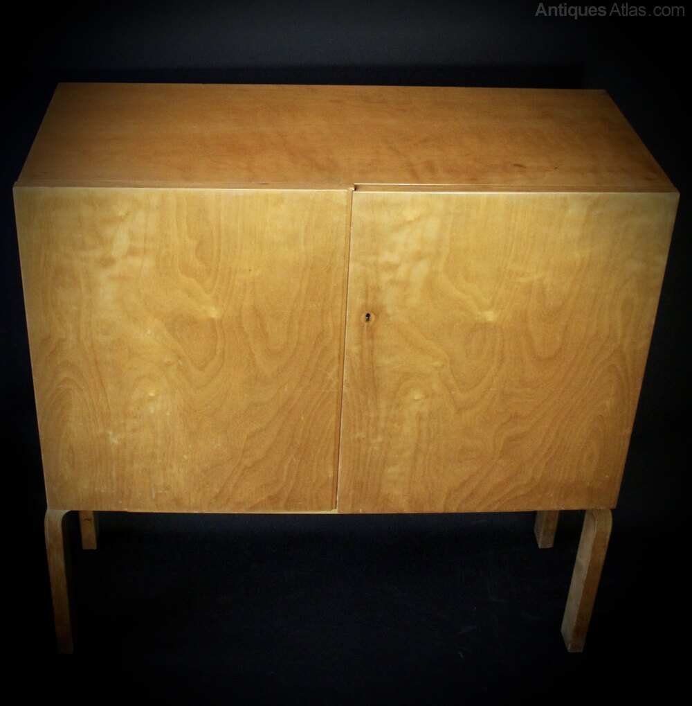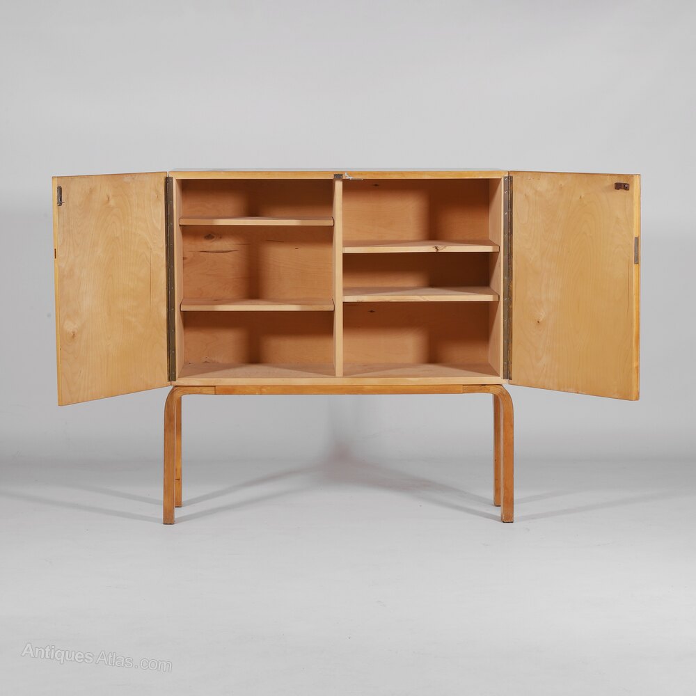 Alvar Aalto (Finnish, 1898-1976). A model 810 cabinet, birch plywood with two front doors, opening to reveal for adjustable shelves, raised on four legs. This is an early produced example. Measures 100 cm high x 95 cm wide x 40 cm deep