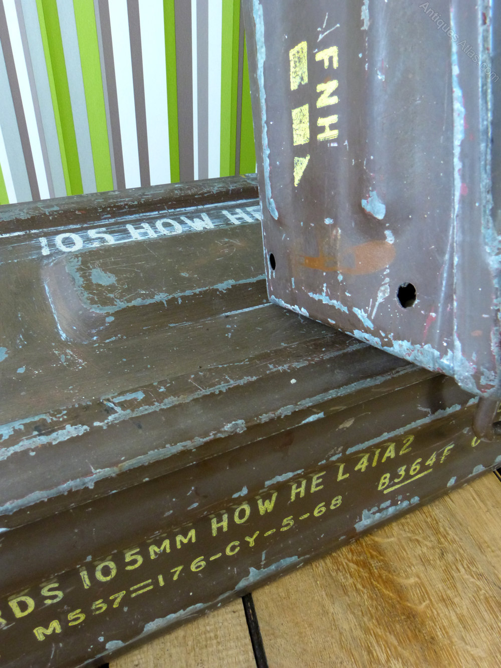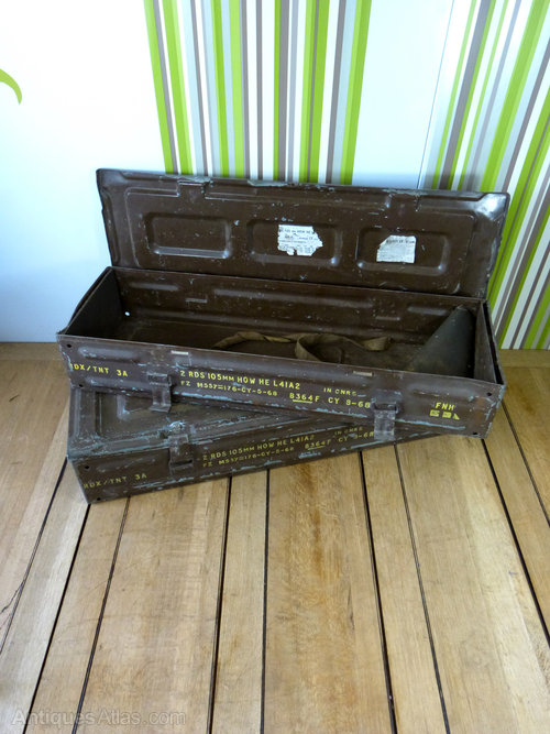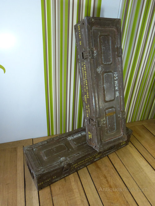 A pair of ammunition's metal cases for the 105mm Howitzer shells, great condition for their age with the original stencil lettering to the sides.